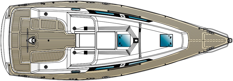 | Outside | 220 V-Landanschluss, Bootshaken, Delta-Anker, Fallwinschen, Fender, Festmacherleinen, Genuawinschen, selbstholend, Heckanker, Sprayhood, Windex |