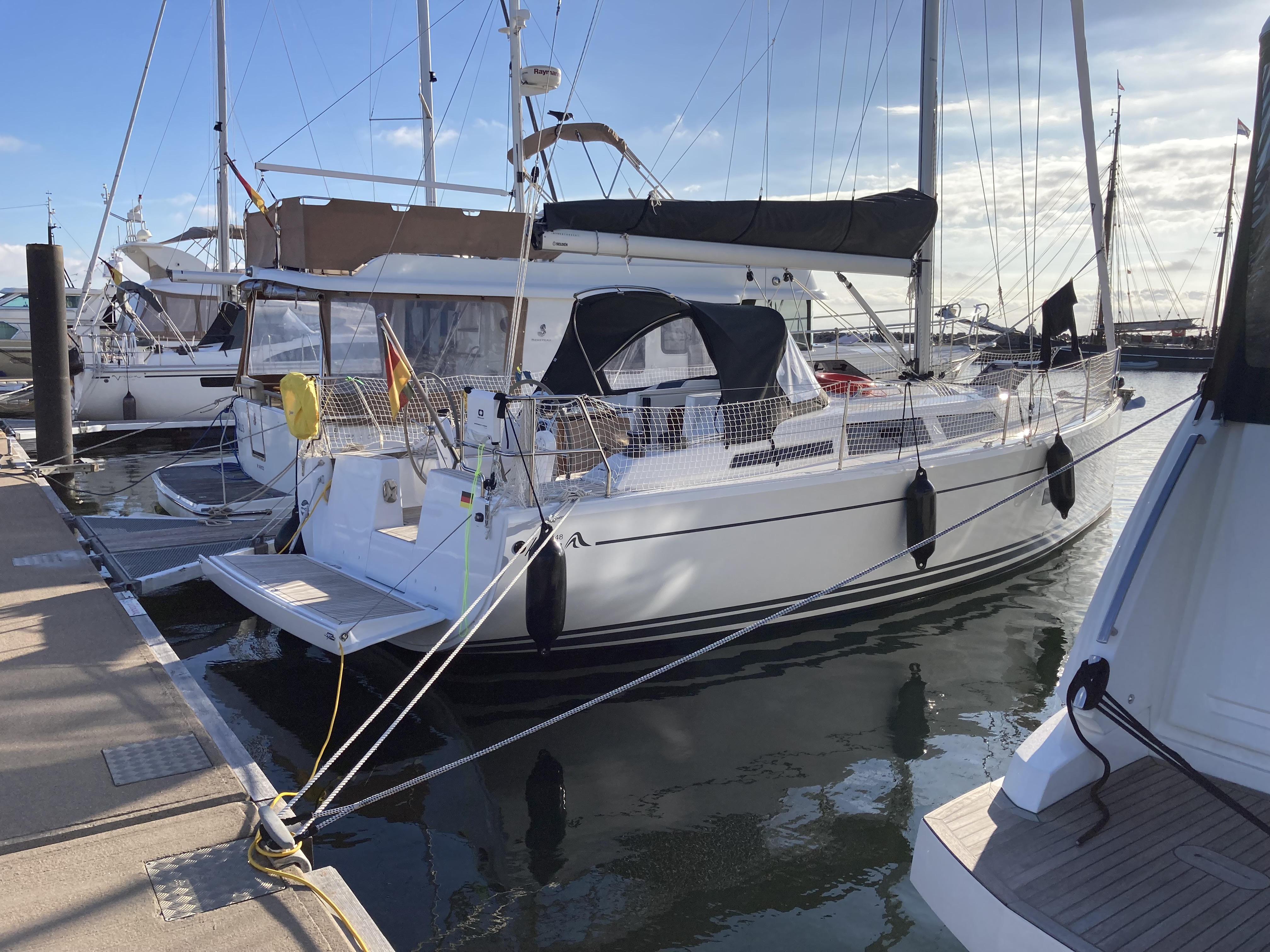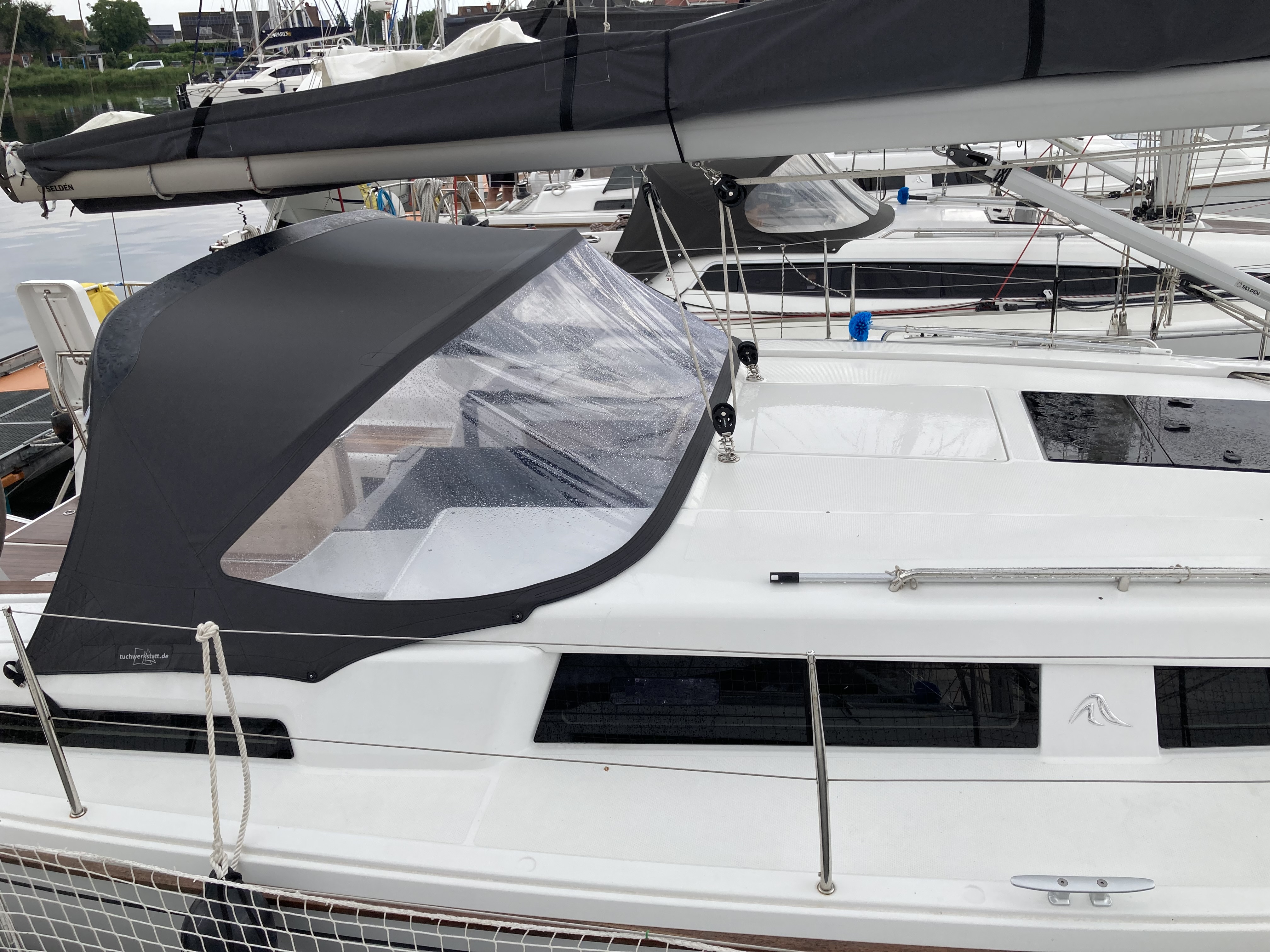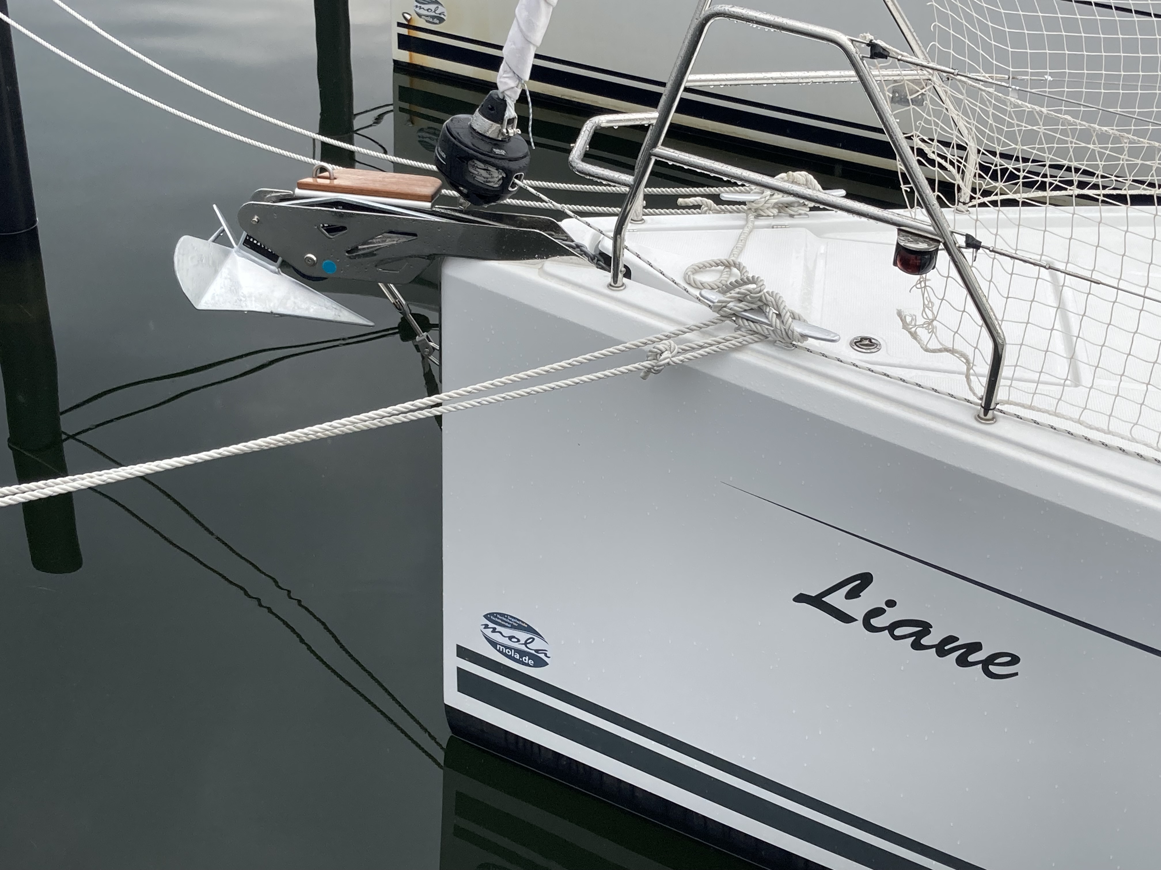 | Outside | 220 V-Landanschluss, Bootshaken, Delta-Anker, elektr. Ankerwinsch, Fallwinschen, Fender, Festmacherleinen, Genuawinschen, selbstholend, Heckanker, Sprayhood, Windex |