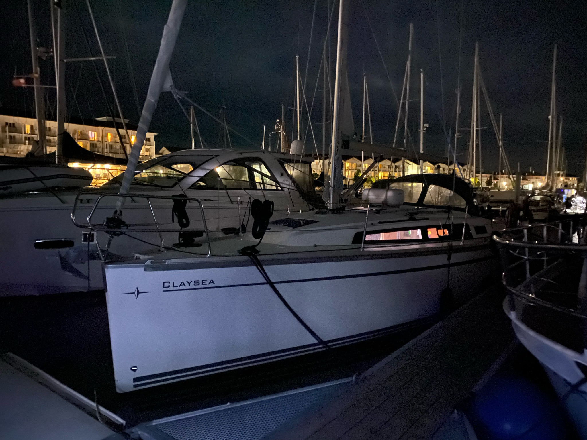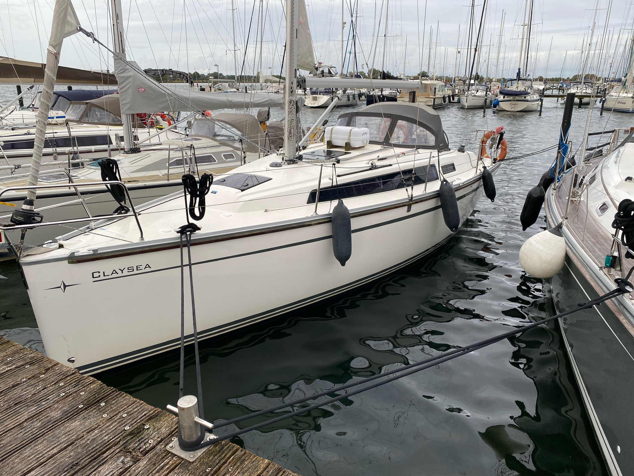 | Outside | Bootshaken, Cockpittisch, Deckbürste, elektr. Ankerwinsch, Fender, Festmacherleinen, Sprayhood, Wantenschneider |