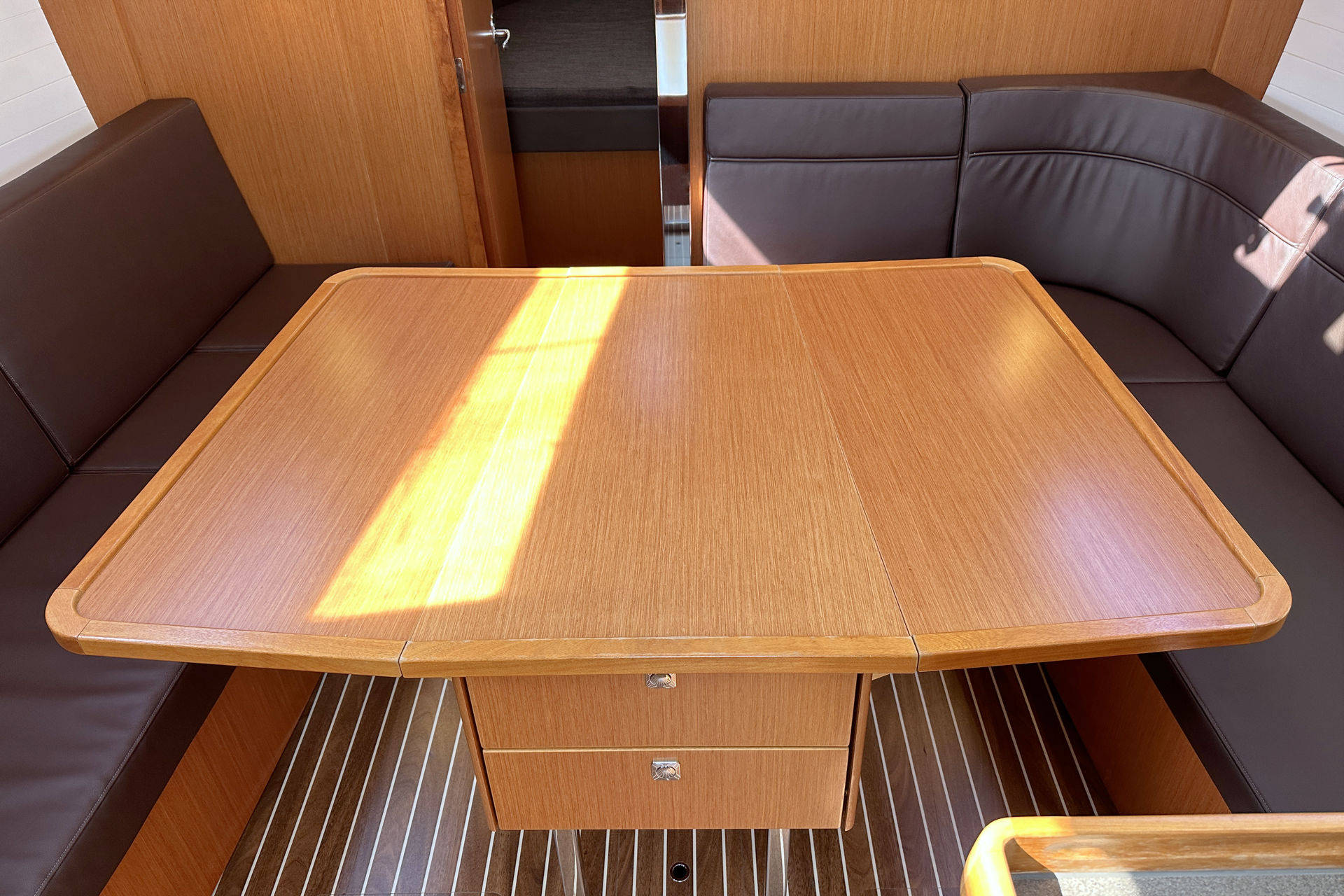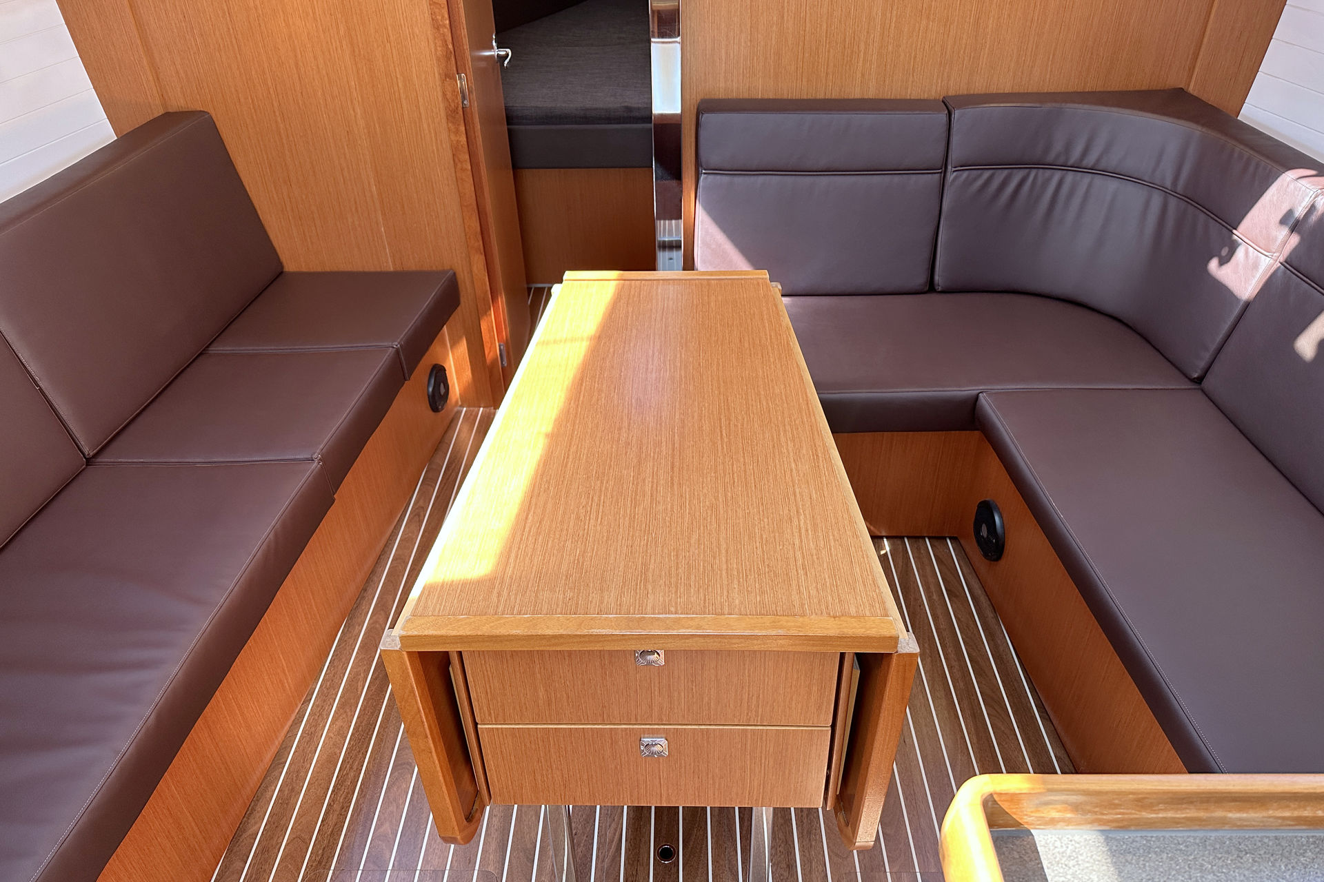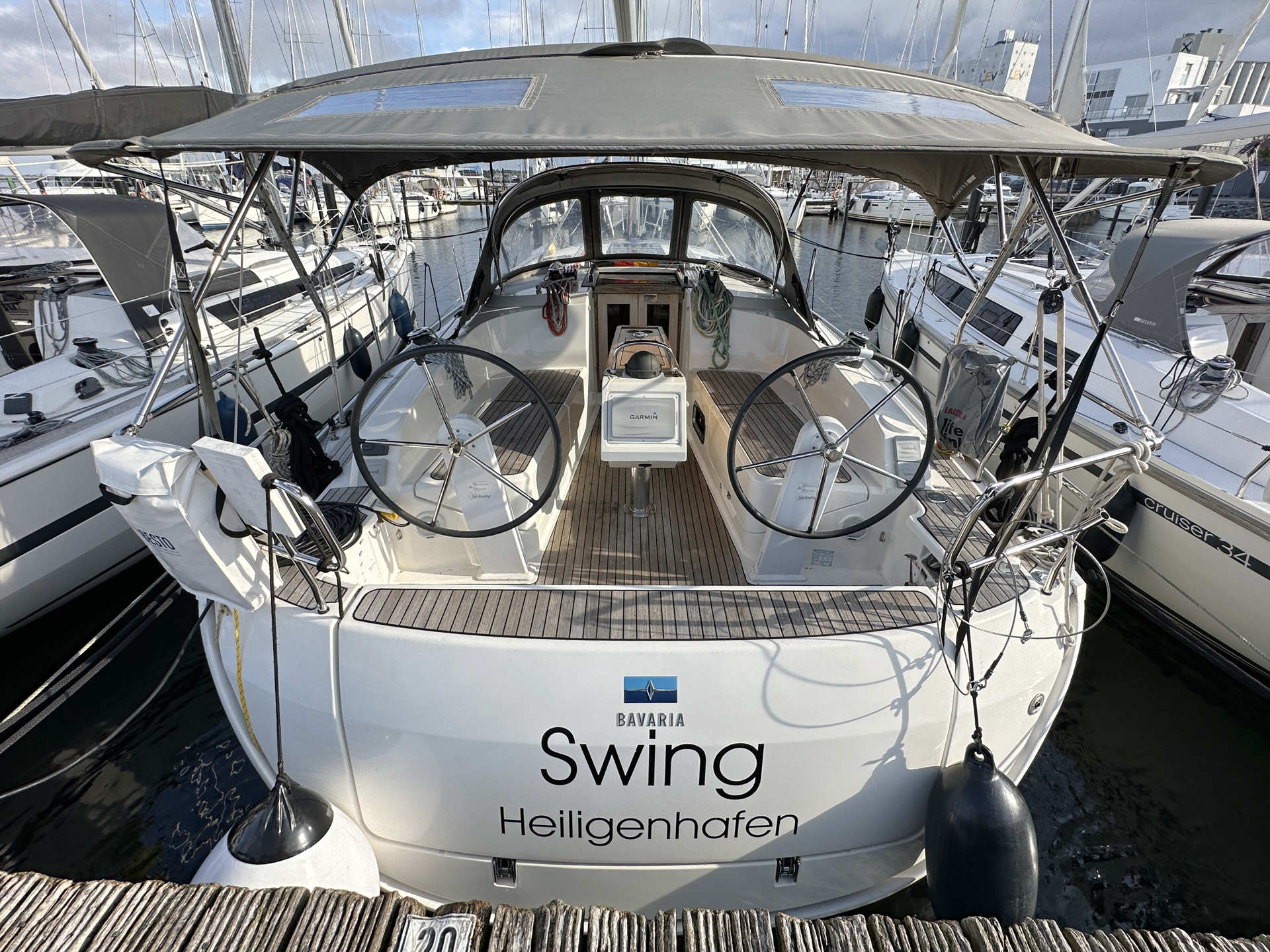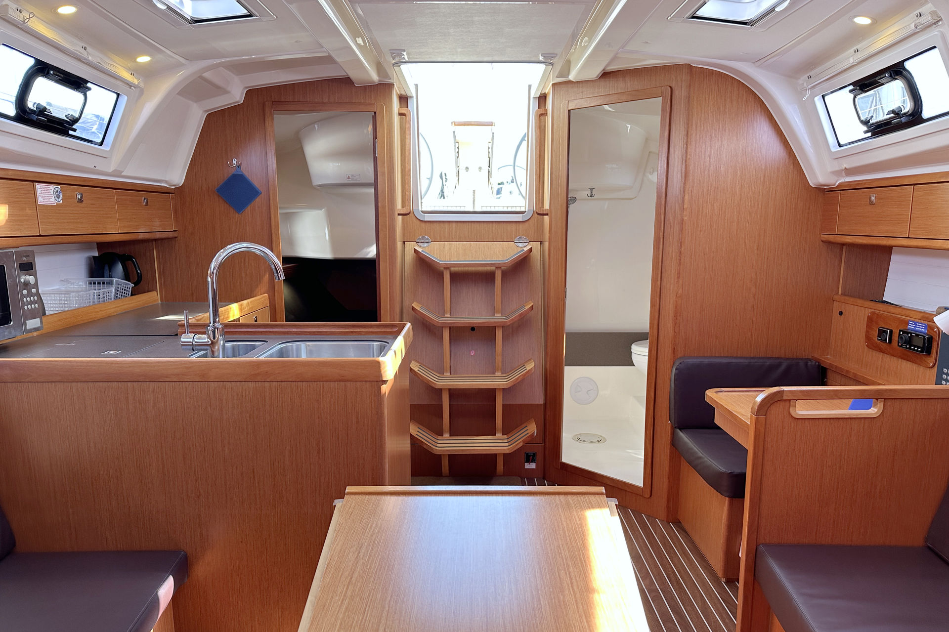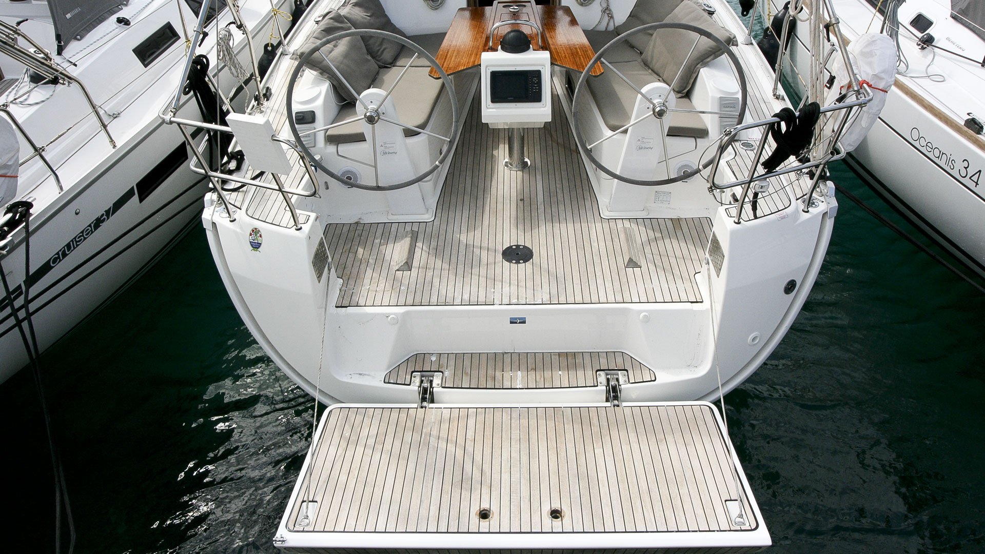 | Outside | Anker mit Kette, Biminitop, Bootshaken, Cockpitlautsprecher, Cockpittisch, Deckbürste, elektr. Ankerwinsch, Fender, Festmacherleinen, Sprayhood, Teak auf Badeplattform, Teak im Cockpit, Teakdeck, Wantenschneider |