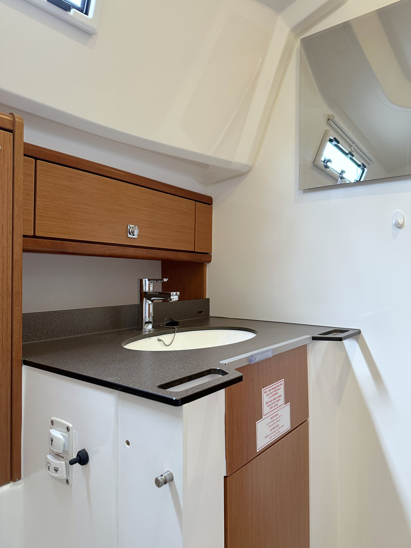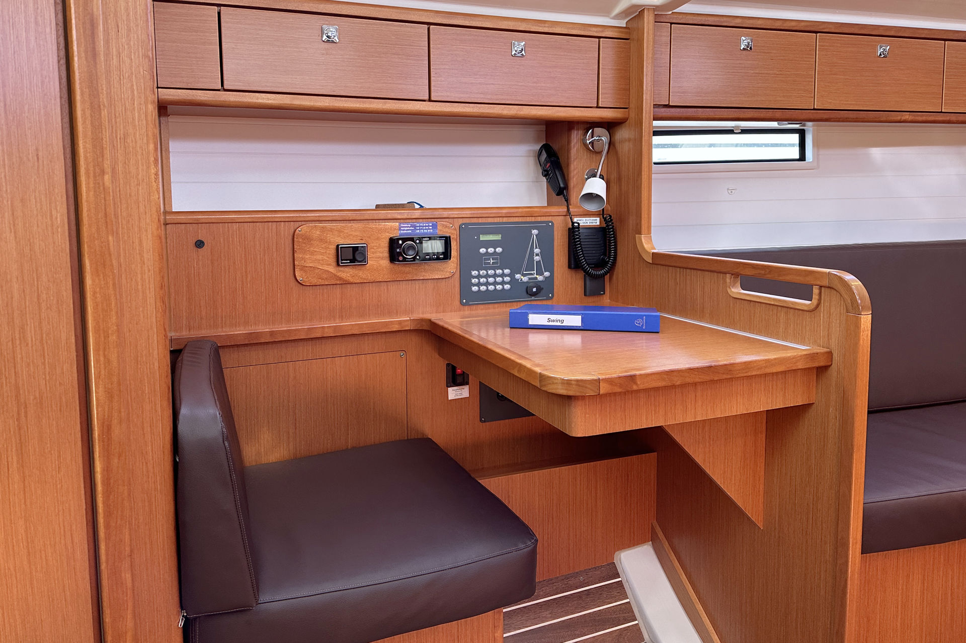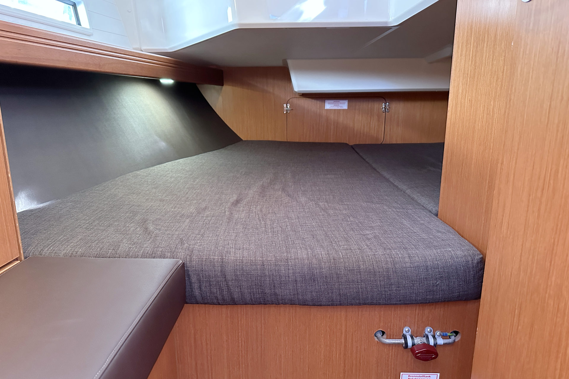| Safety | AIS Empfänger, Ankerball, Ankerlicht, Automatikwesten, Autopilot, Bilgepumpe, Bootsmannstuhl, Bordapotheke, Bordwerkzeug, Bugstrahlruder, Feuerlöscher, Flaggen, Handscheinwerfer, Lifebelts, Navigationslichter, Nebelhorn, Notsignale, Rettungsinsel, Rettungsring, UKW-Funk, Zweitanker |
