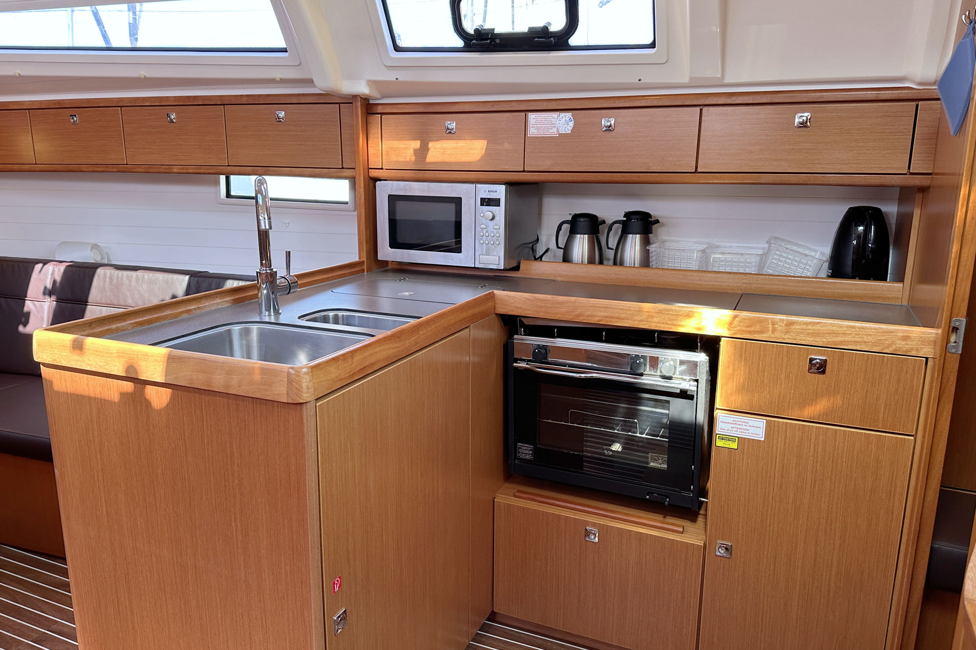 | Inside | 12V/220V-Steckdosen, Backofen, Borduhr, Diesel-Heizung, elektr. Druckwasserpumpe, elektrische Kühlbox, FUSION Sound System, Gasherd, Inverter 12V/220V, Ladegerät, Landstromkabel, Pantryausstattung, Safe für Wertsachen, Spülbecken, Tablet PC, TV mit DVBT, Warmwasser, WC (elektr.) |