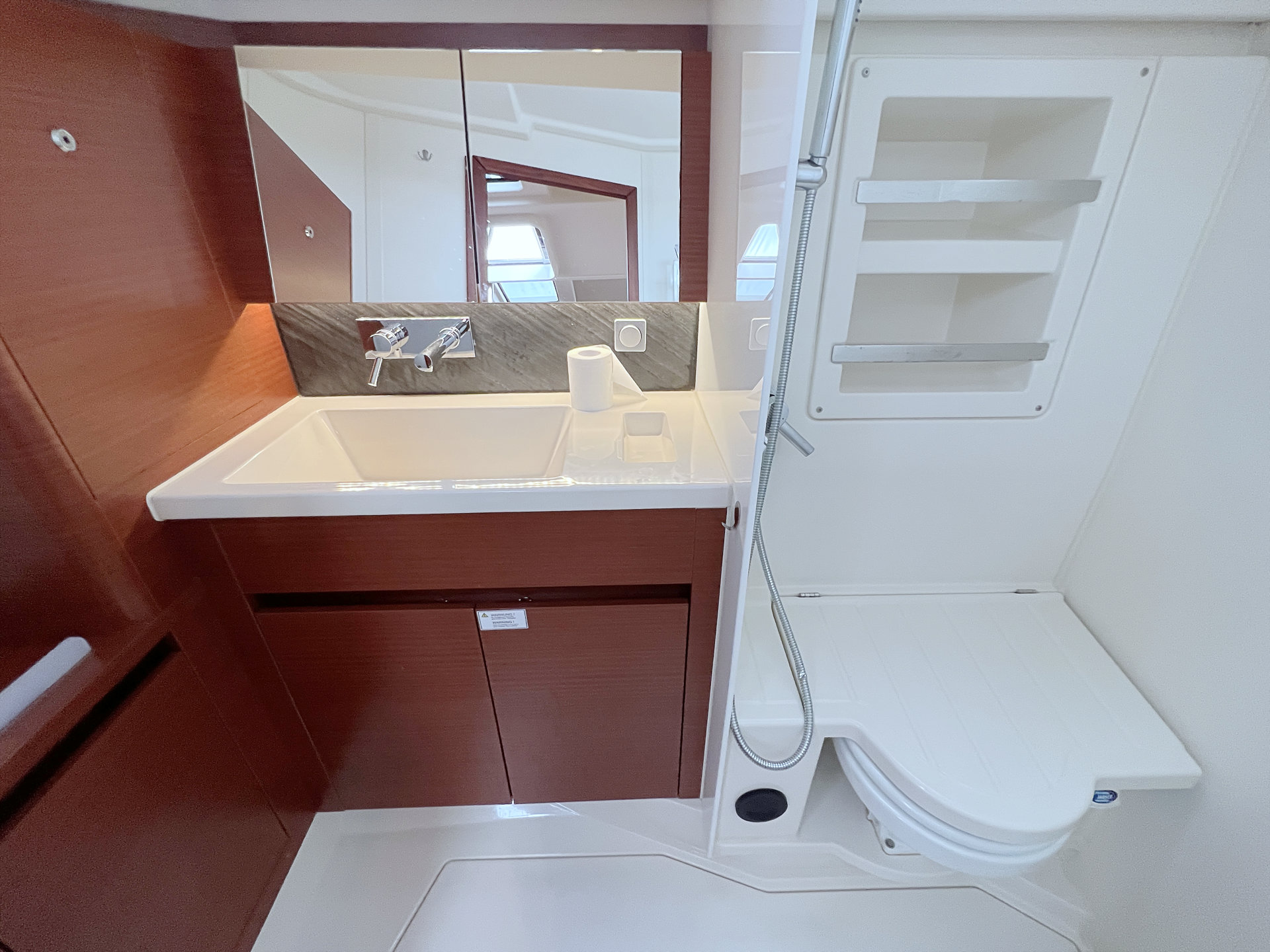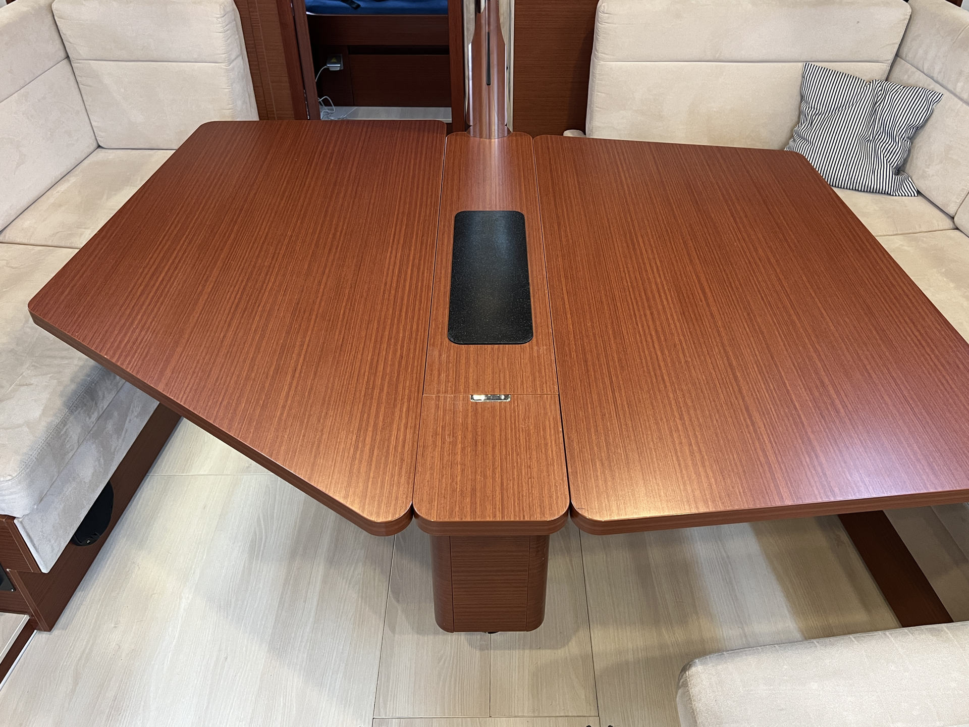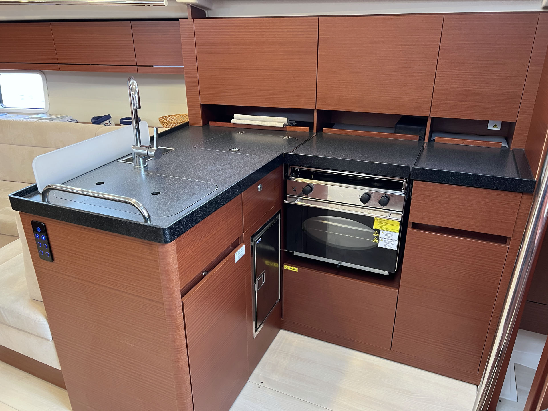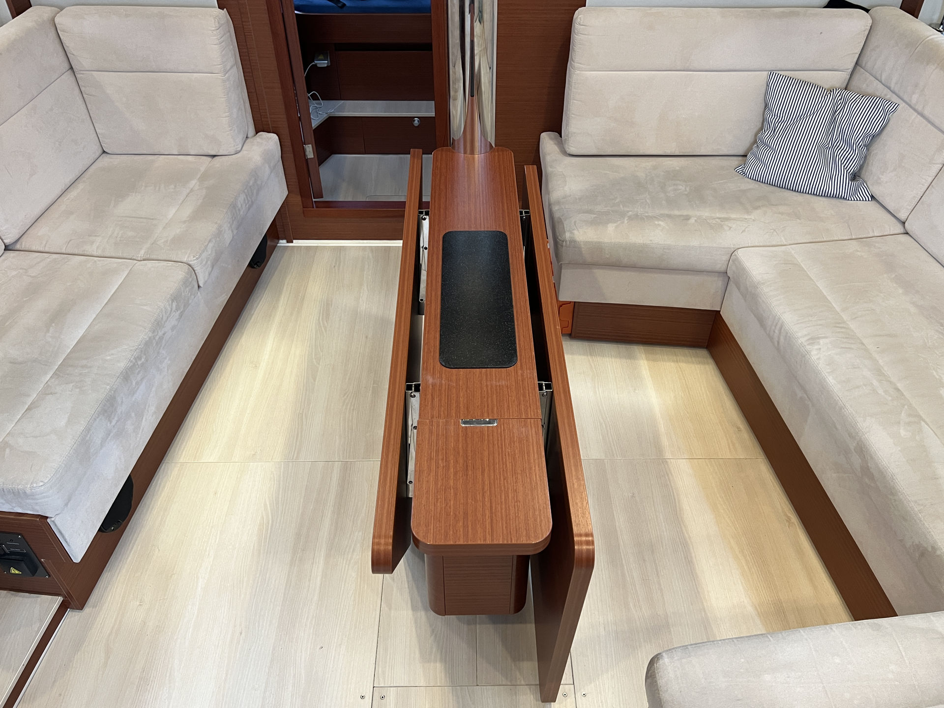 | Outside | Anker mit Kette, Badeplattform, Bootshaken, Bugkorb, Cockpitdusche warm/kalt, Cockpittisch, Deckbürste, elektr. Ankerwinsch, Fender, Fernsteuerung für elektr. Ankerwinsch, Festmacherleinen, Sprayhood |