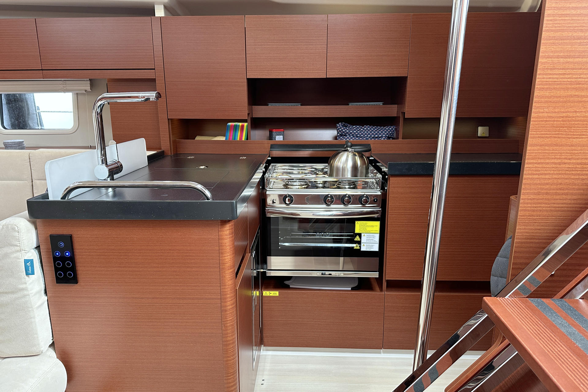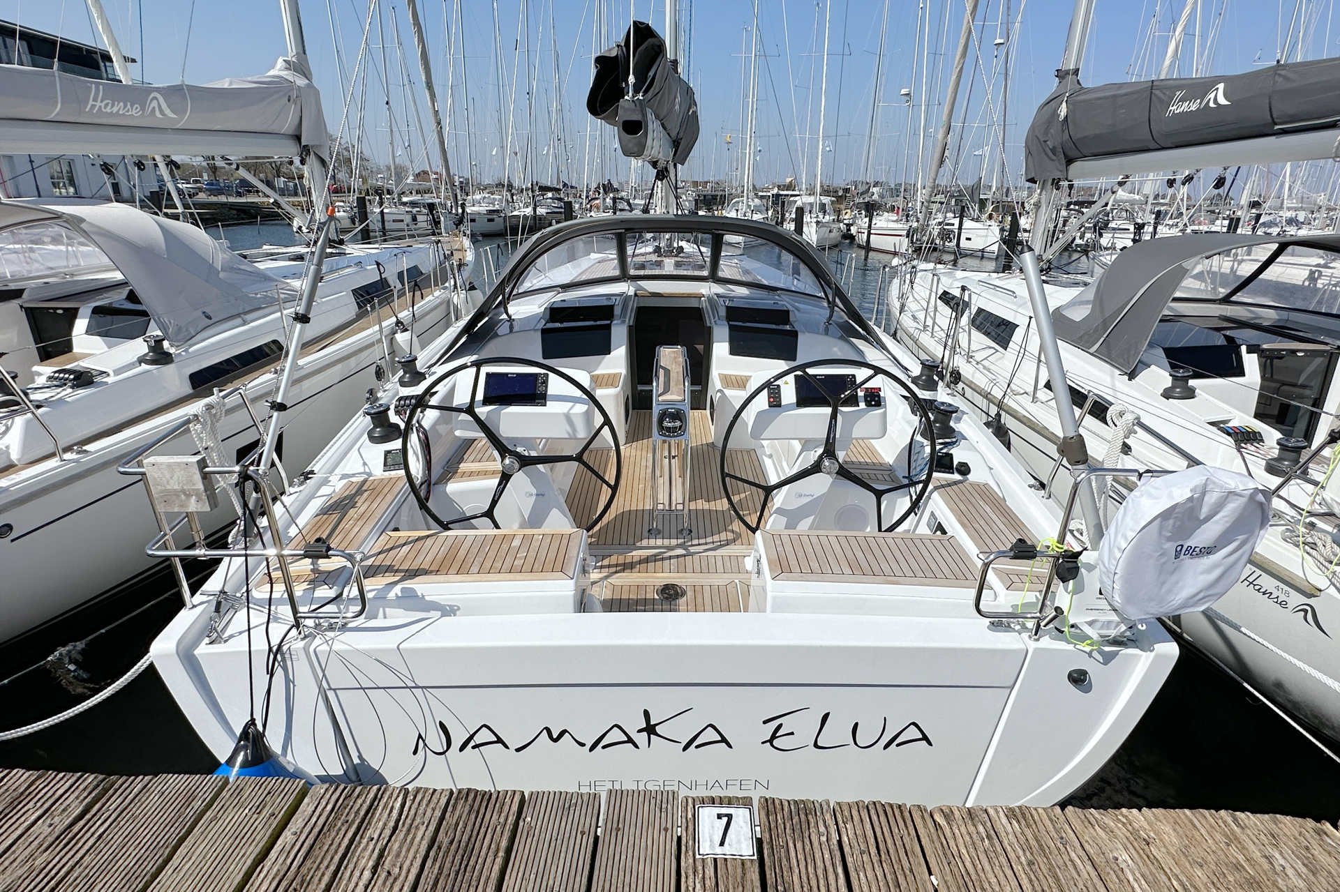 | Outside | Anker mit Bleileine, Badeplattform, Biminitop, Bootshaken, Cockpitlautsprecher, Cockpitpolster, Deckbürste, elektr. Ankerwinsch, Faltpropeller, Fender, Festmacherleinen, Seereling, Solaranlage, Sprayhood, Teak im Cockpit |
