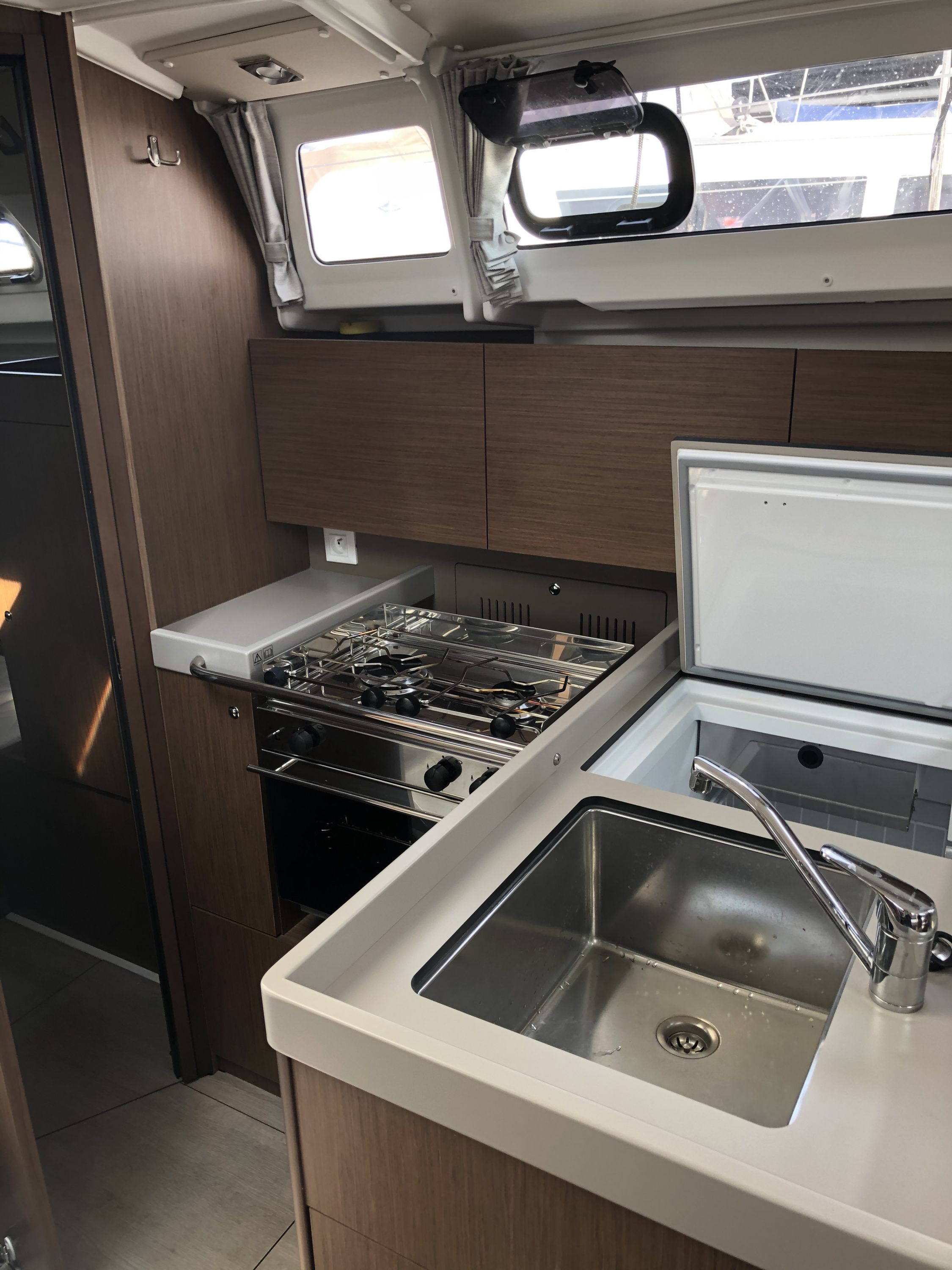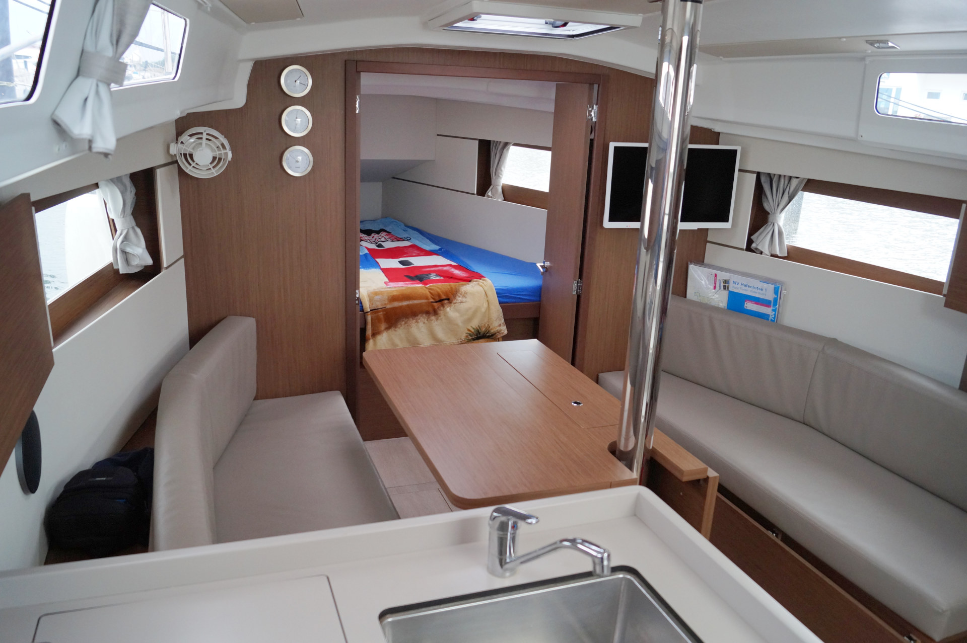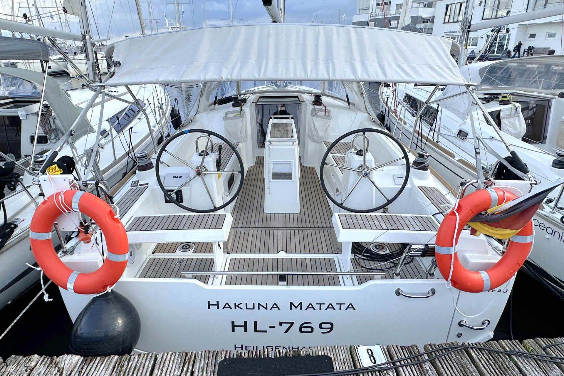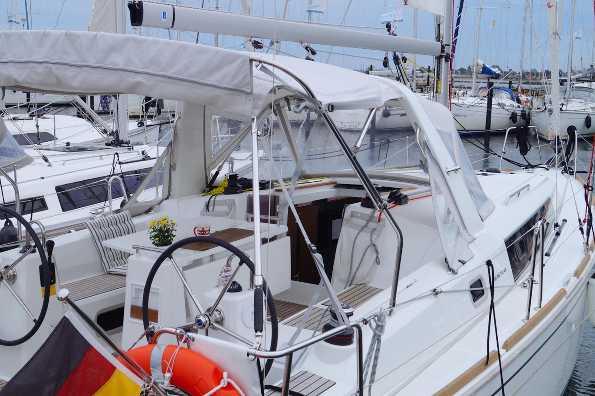 | Outside | Biminitop, Cockpitdusche warm/kalt, Cockpitlautsprecher, Cockpittisch, elektr. Ankerwinsch, Fernsteuerung für elektr. Ankerwinsch, Sprayhood, Teak im Cockpit |