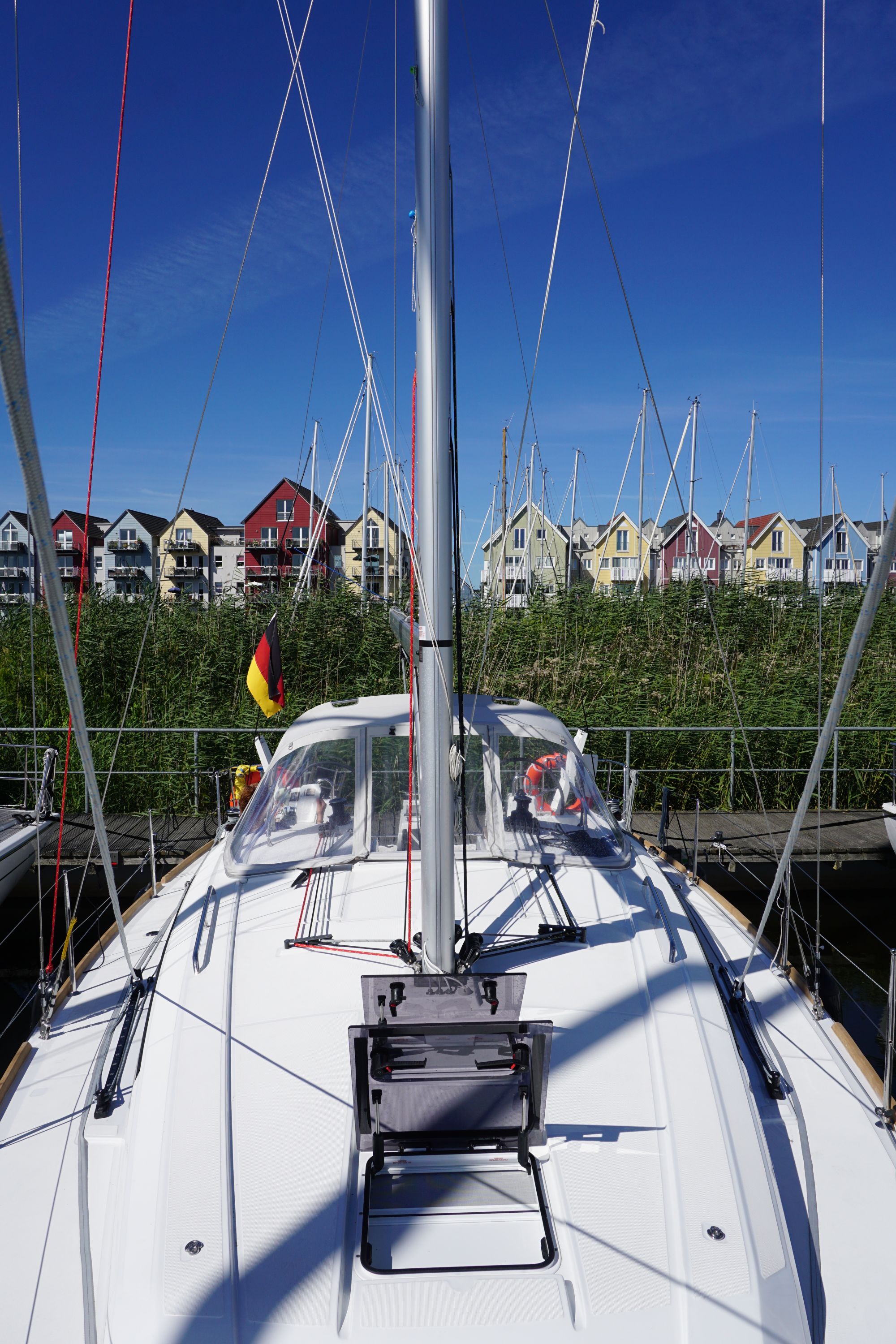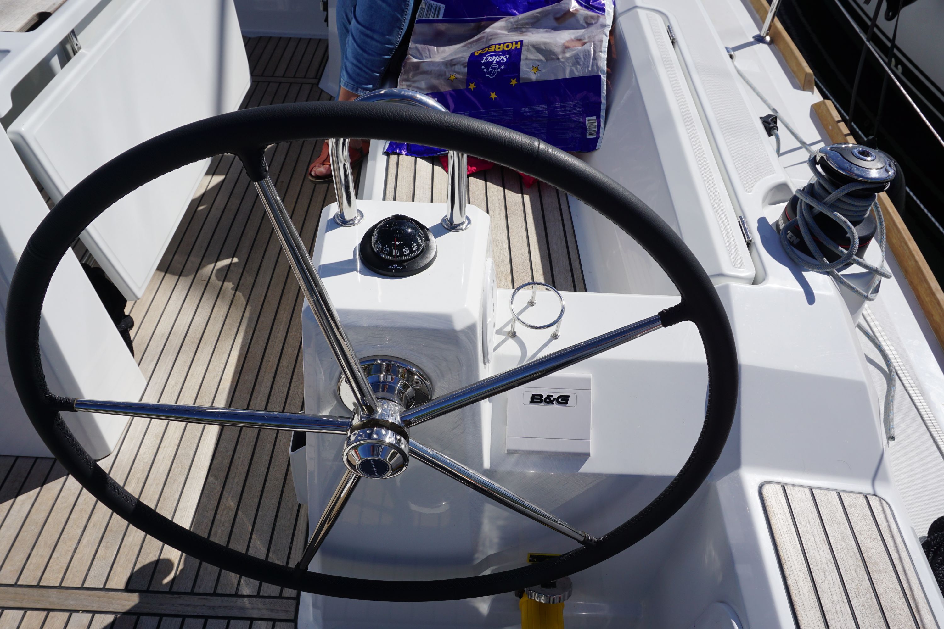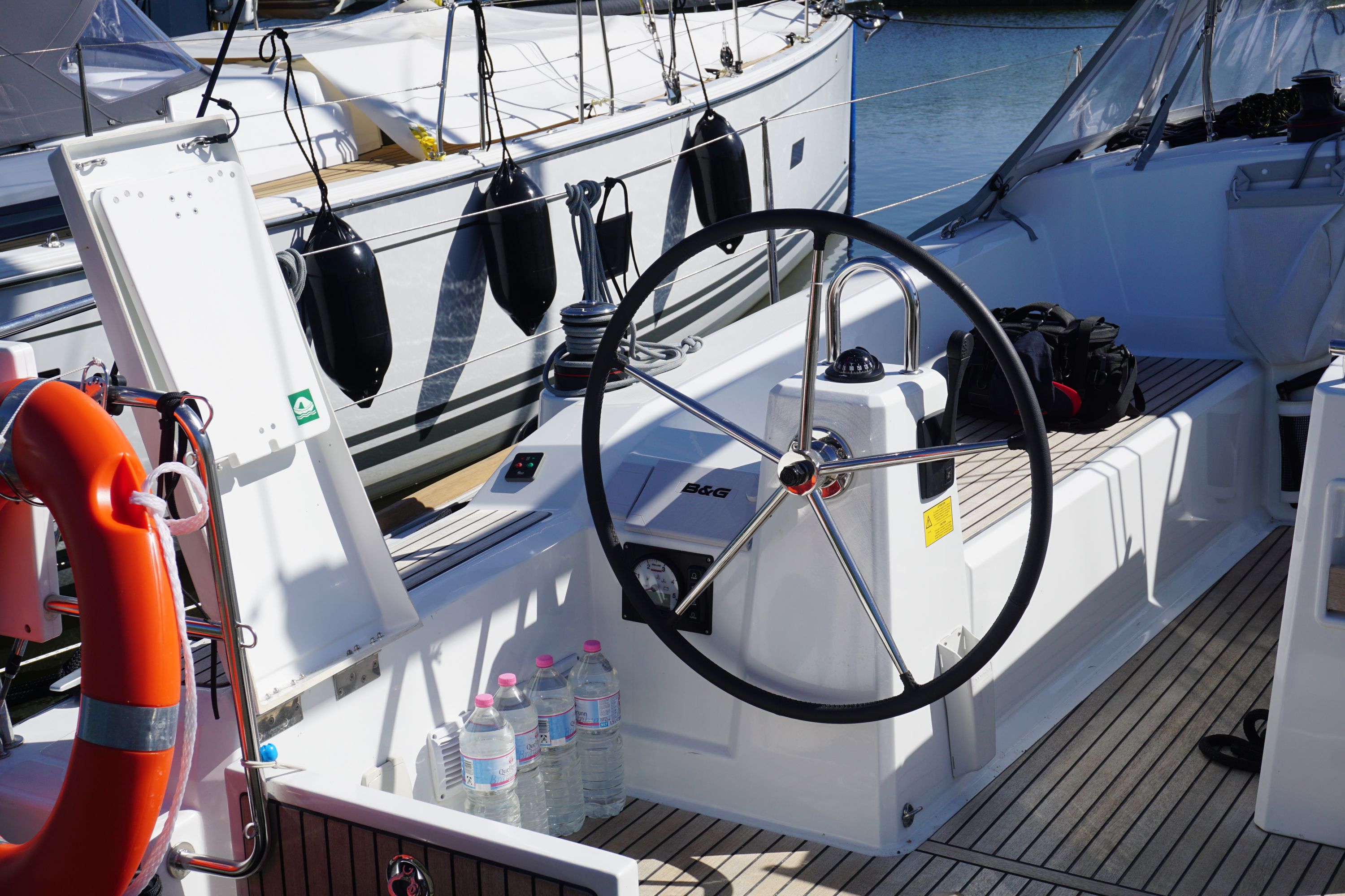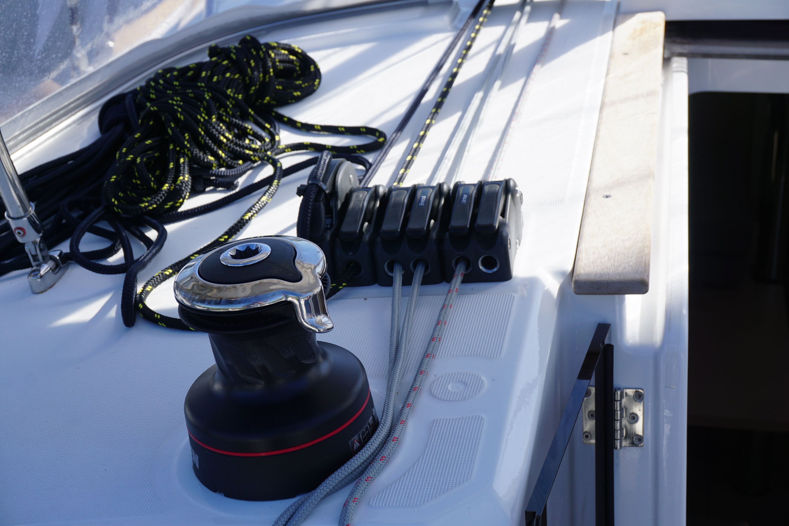 | Outside | Badeplattform, Biminitop, Bootshaken, Bugkorb, Cockpitdusche warm/kalt, Cockpitlautsprecher, Cockpittisch, Deckbürste, elektr. Ankerwinsch, Fender, Fernsteuerung für elektr. Ankerwinsch, Festmacherleinen, Seereling, Sprayhood, Teak im Cockpit, Wantenschneider |