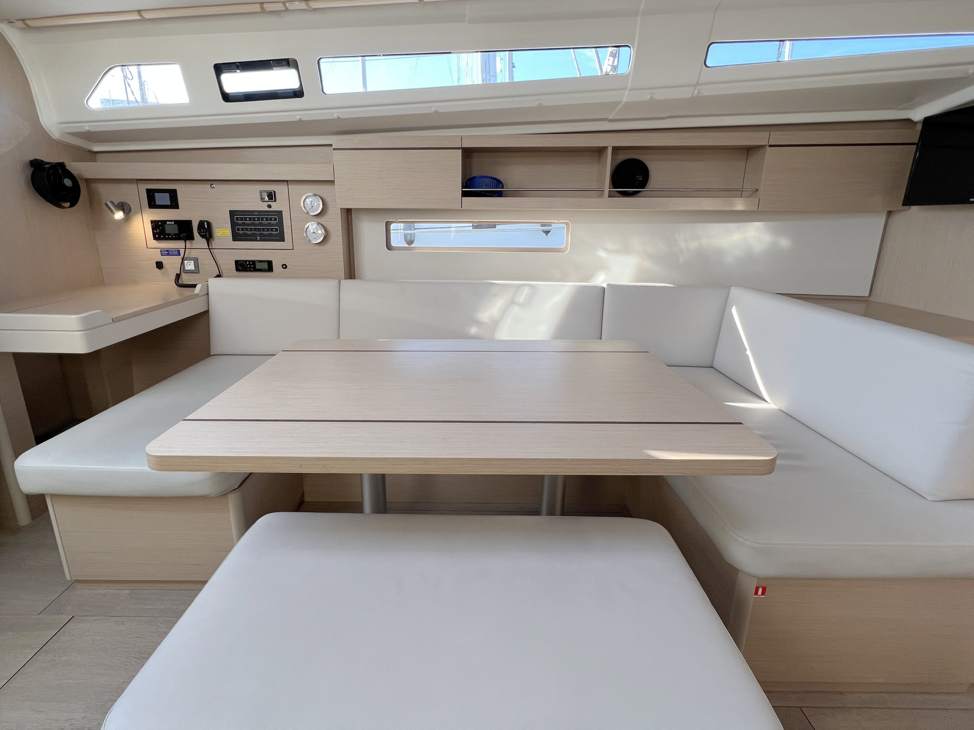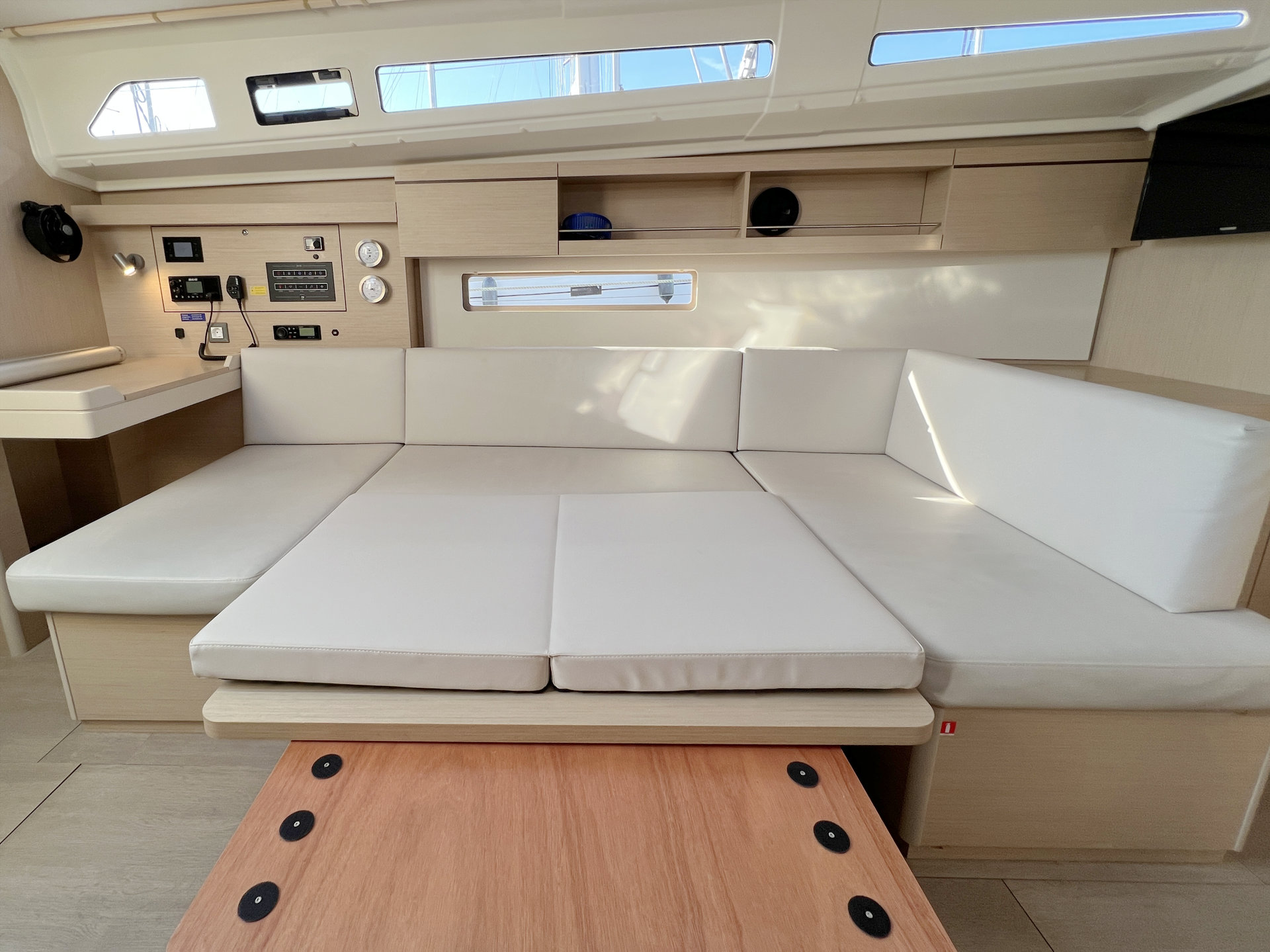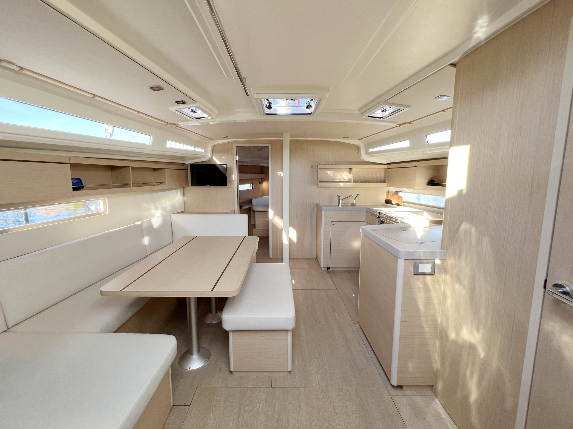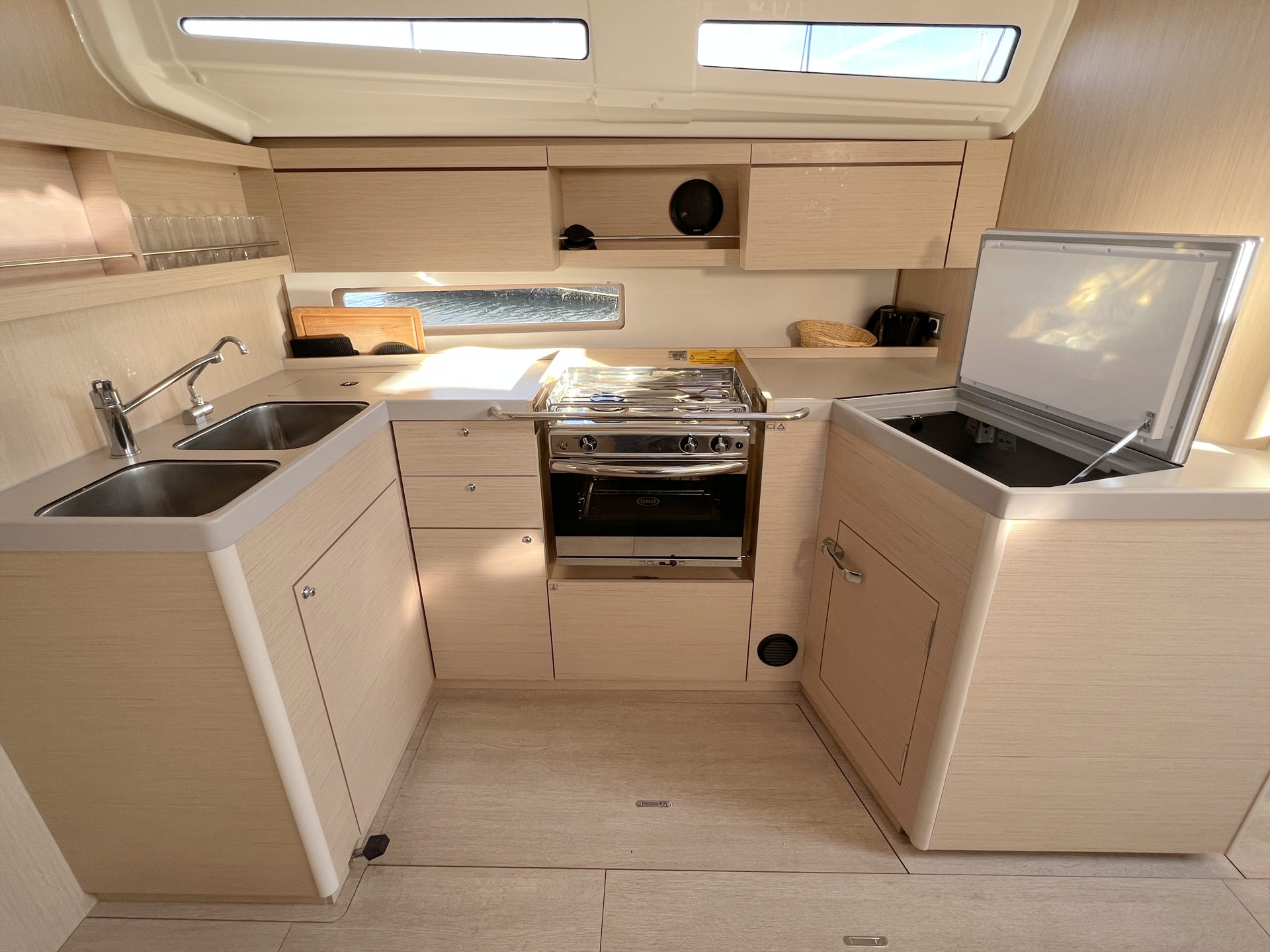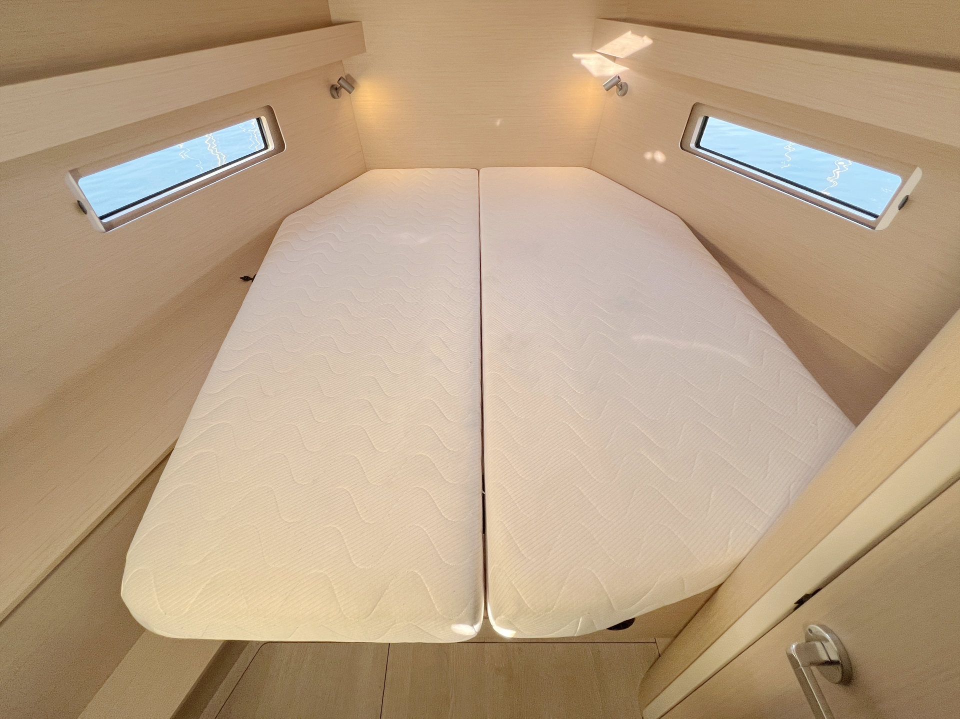 | Inside | 12V/220V-Steckdosen, Backofen, Diesel-Heizung, elektrische Kühlbox, Ladegerät, Pantryausstattung, Radio mit CD, Spülbecken, Tablet PC, TV + DVD, USB Steckdosen in den Kabinen, Ventilatoren in Salon und Kabinen, Warmwasser |