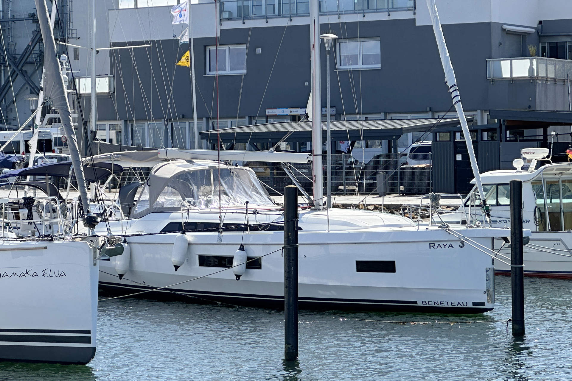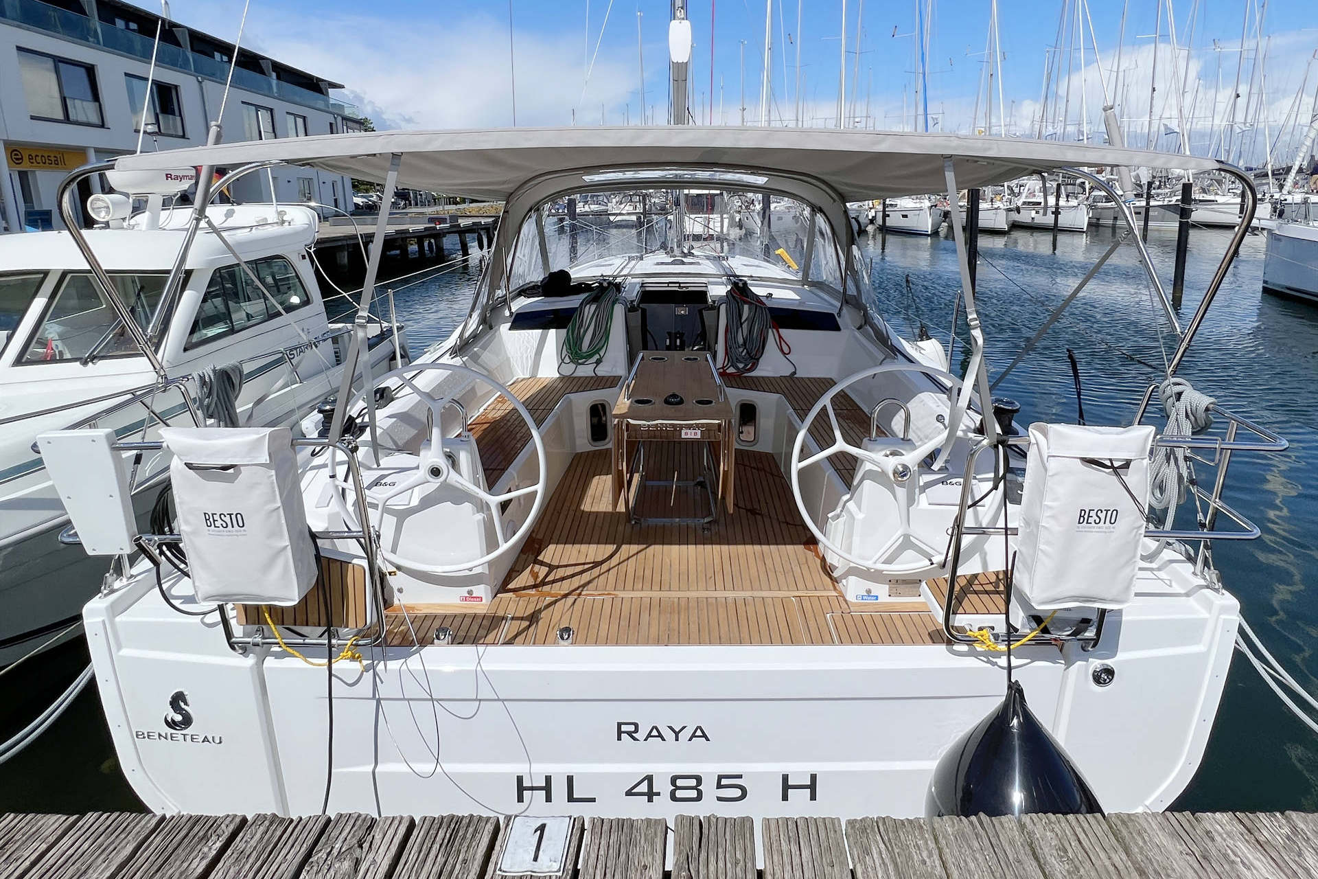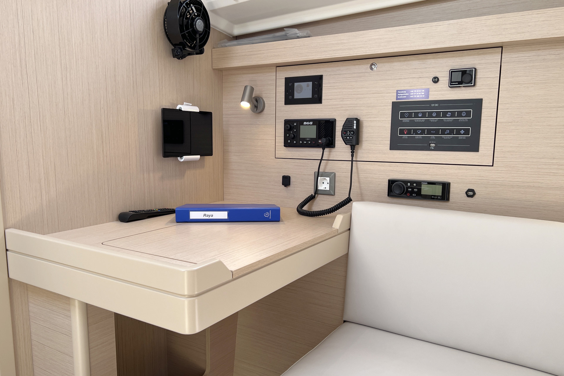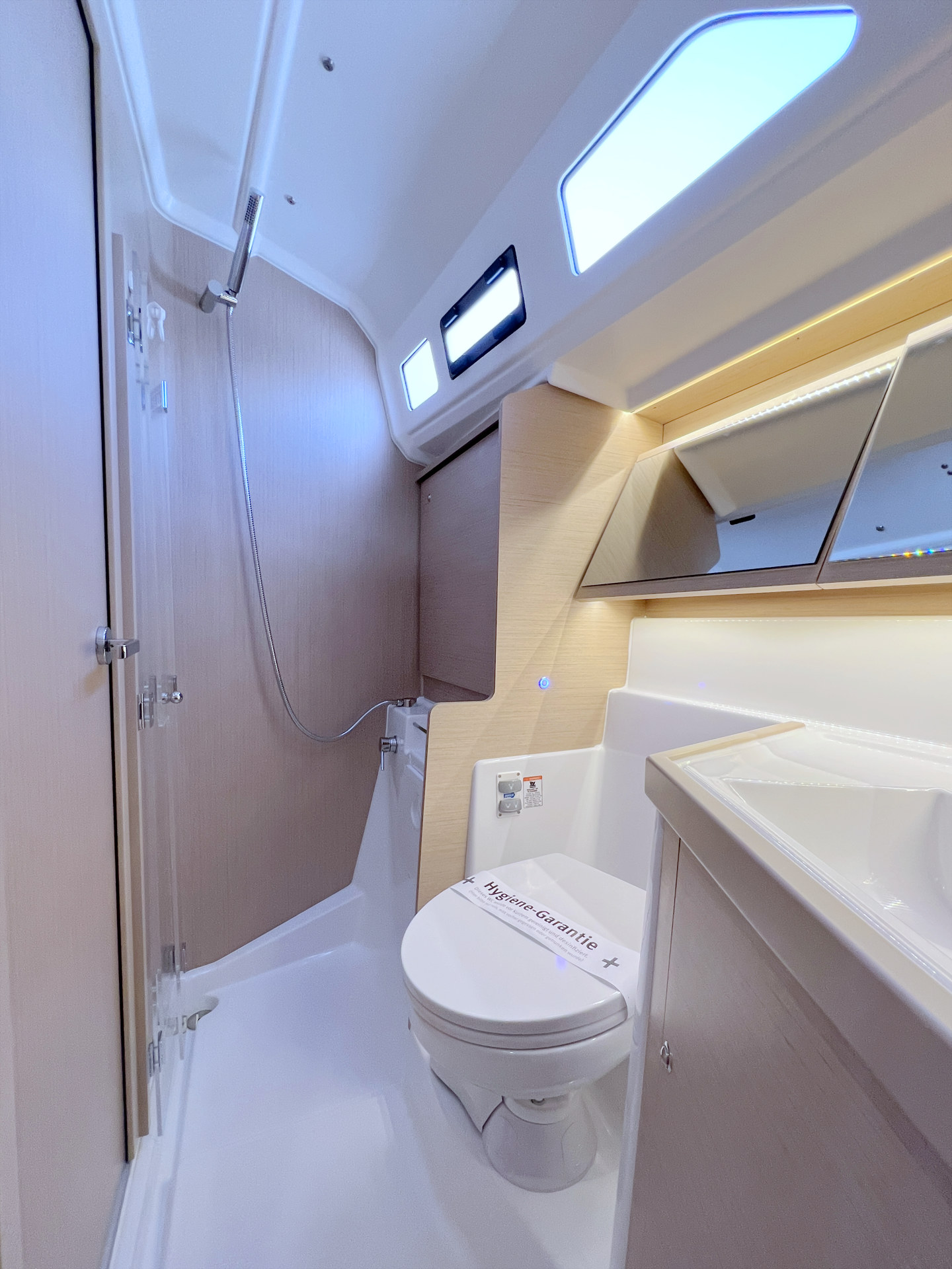 | Safety | AIS Empfänger, Ankerball, Ankerlicht, Automatikwesten, Autopilot, Bilgepumpe, Bootsmannstuhl, Bordapotheke, Bordwerkzeug, Bugstrahlruder, Feuerlöscher, Flaggen, Handscheinwerfer, Lifebelts, Navigationslichter, Nebelhorn, Notsignale, Rettungsinsel, Rettungsring, UKW-Funk, Zweitanker |