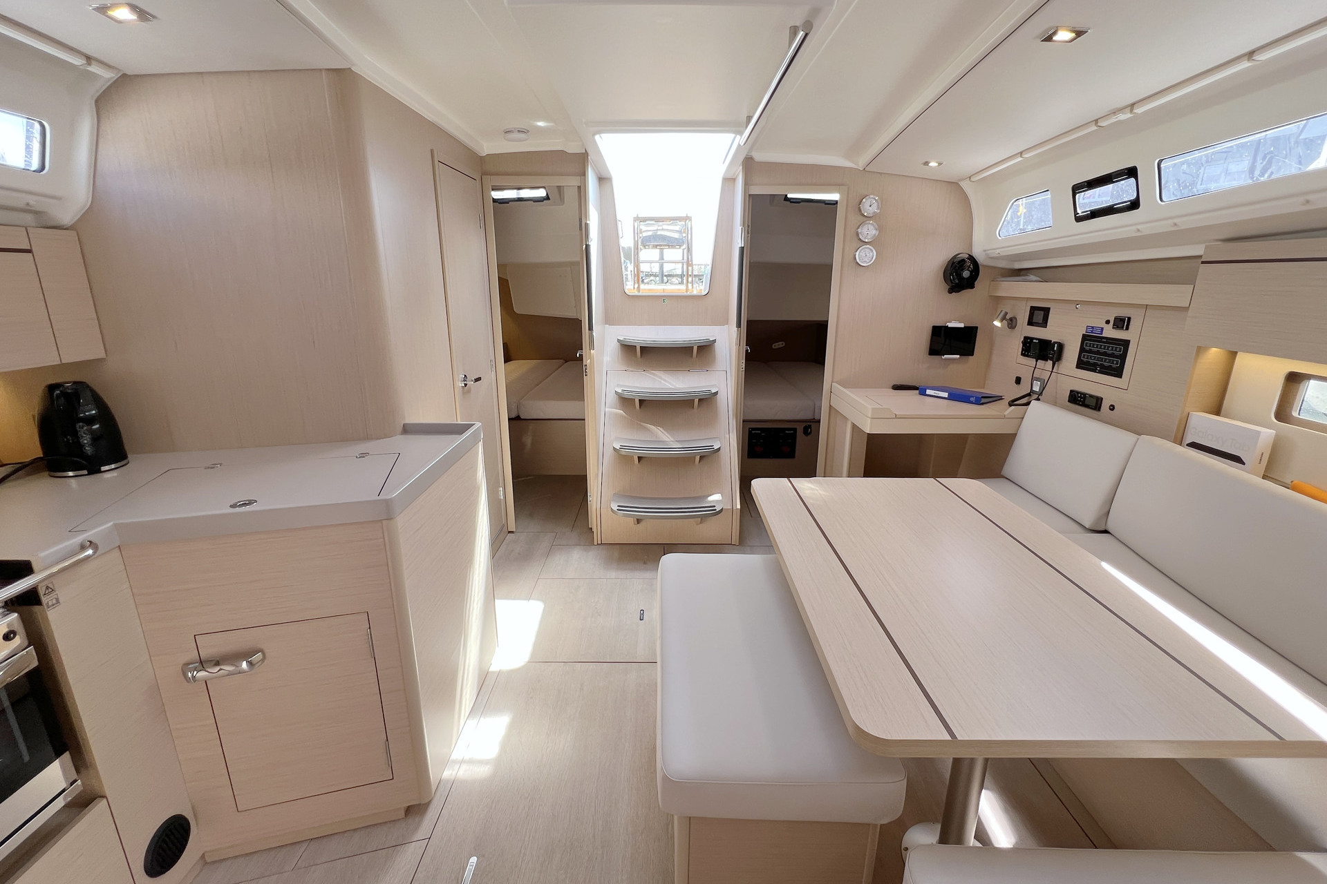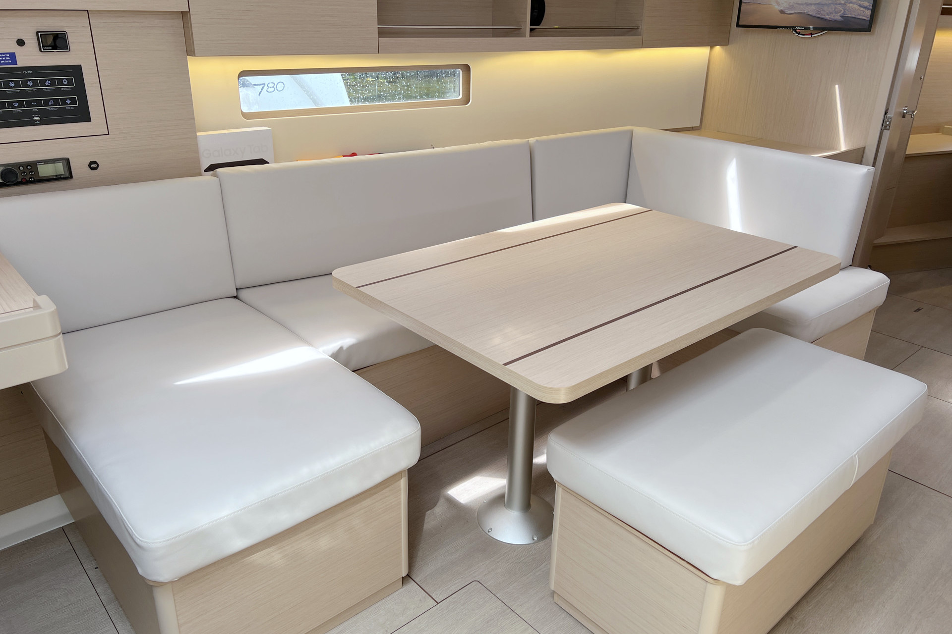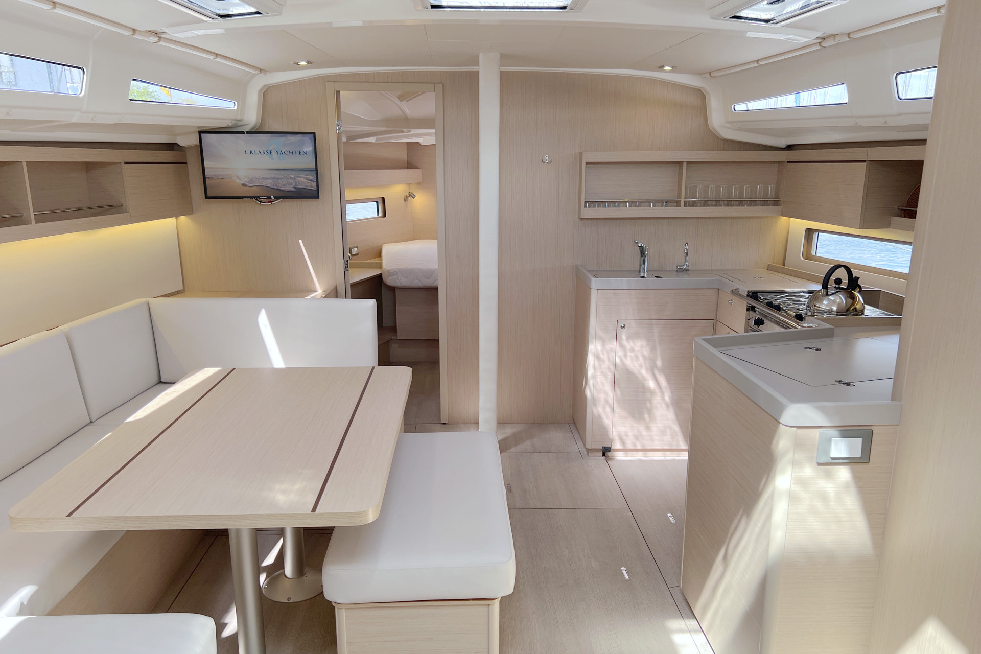 | Inside | 12V/220V-Steckdosen, Backofen, Borduhr, Diesel-Heizung, elektr. Druckwasserpumpe, elektrische Kühlbox, FUSION Sound System, Gasherd, Kühlschrank mit Gefrierfach, Ladegerät, Landstromkabel, Pantryausstattung, Salontisch absenkbar, Spülbecken, Tablet PC, TV mit DVBT, USB Steckdosen in den Kabinen, Ventilatoren in Salon und Kabinen, Warmwasser, WC (elektr.) |