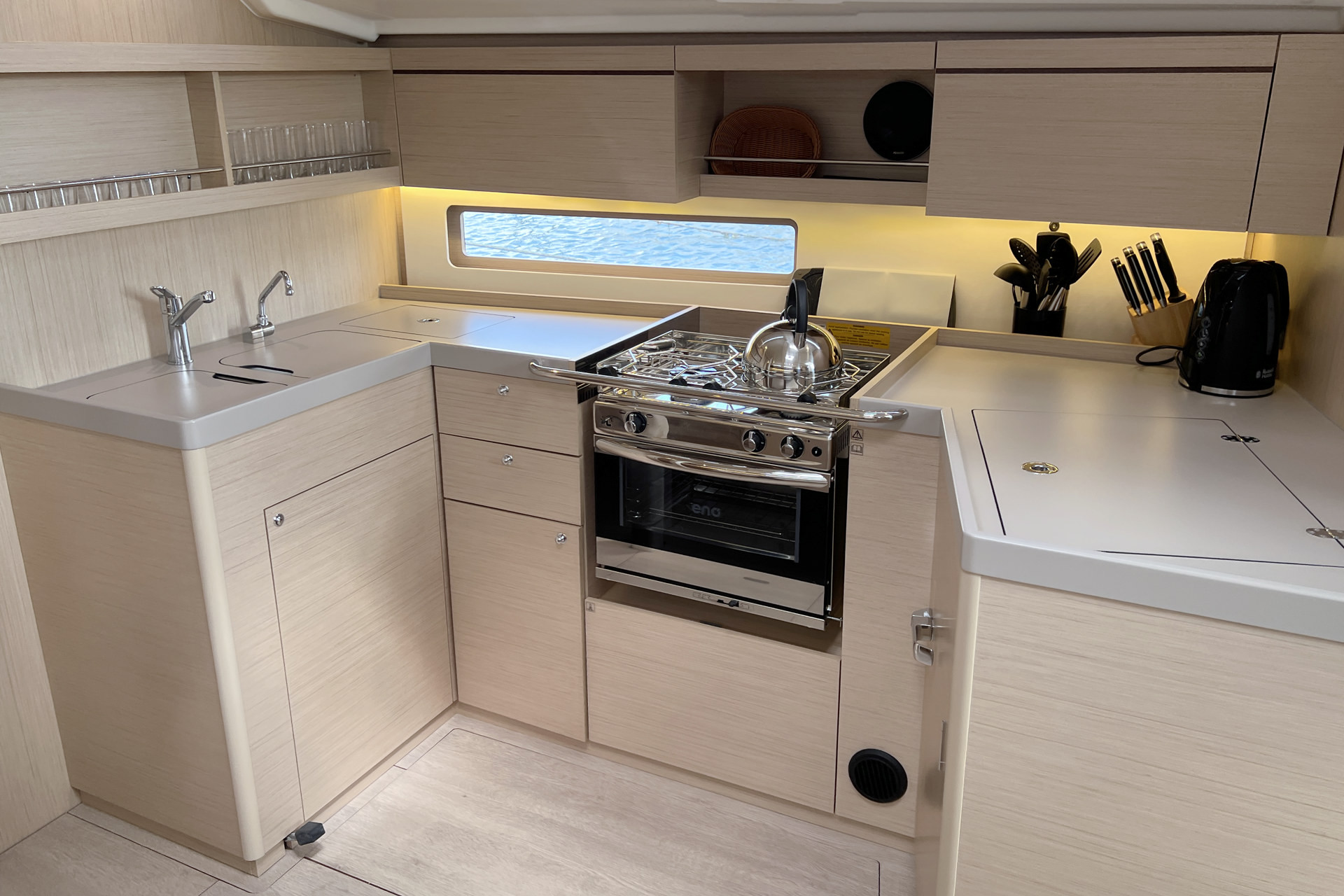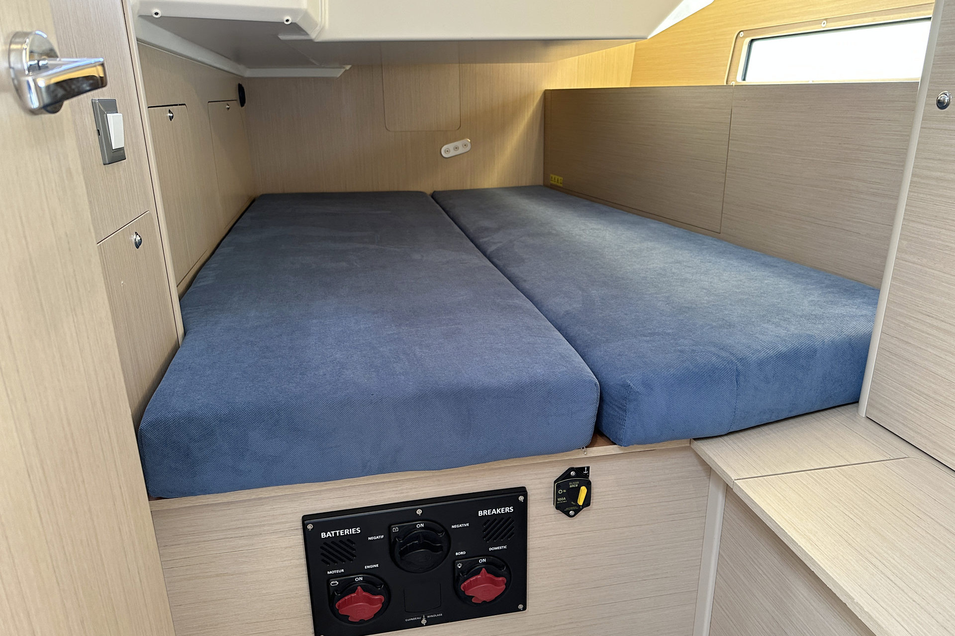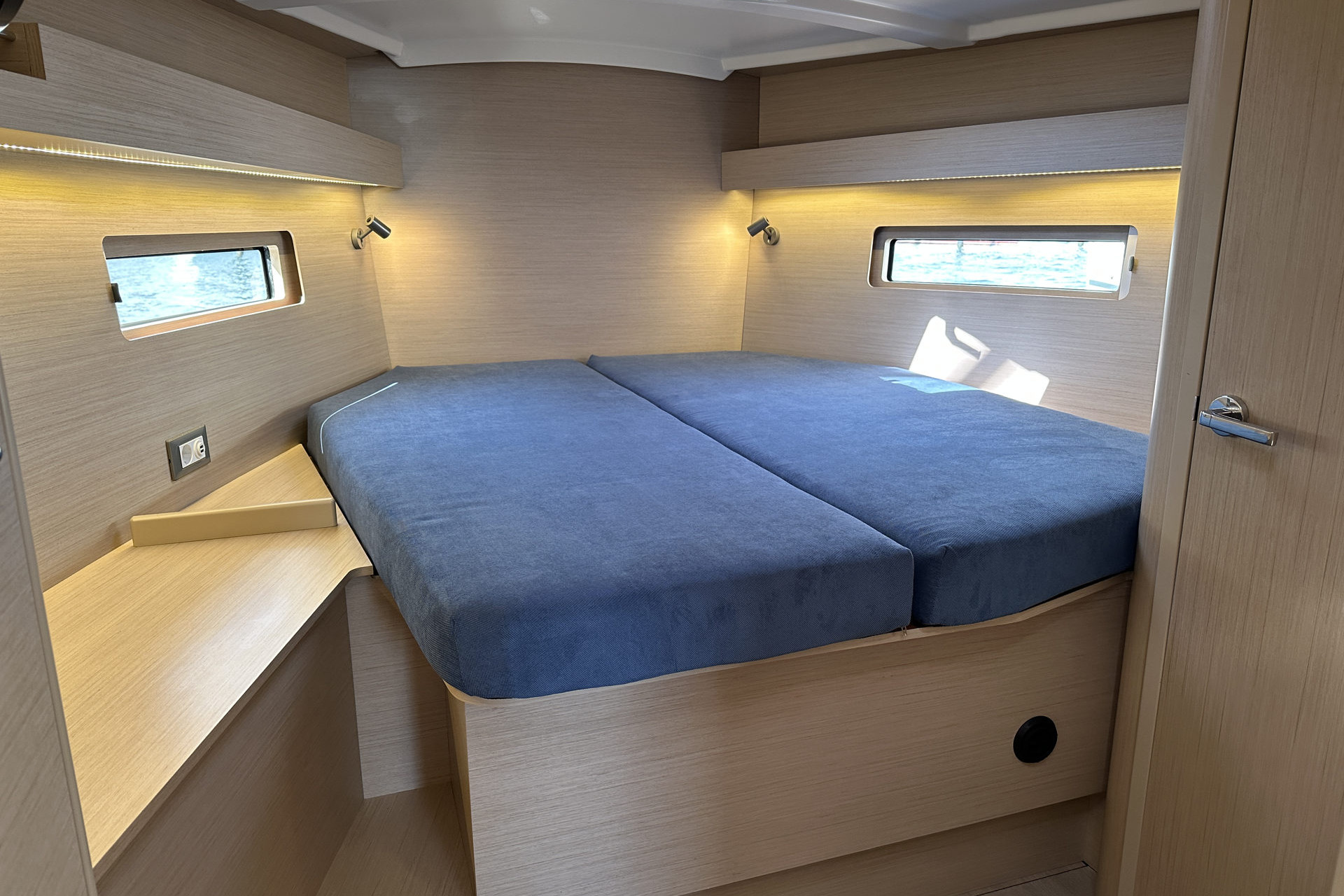 | Inside | 12V/220V-Steckdosen, Backofen, Borduhr, Diesel-Heizung, elektr. Druckwasserpumpe, elektrische Kühlbox, FUSION Sound System, Gasherd, Kühlschrank mit Gefrierfach, Ladegerät, Landstromkabel, Pantryausstattung, Salontisch absenkbar, Spülbecken, Tablet PC, TV mit DVBT, USB Steckdosen in den Kabinen, Ventilatoren in Salon und Kabinen, Warmwasser, WC (elektr.) |