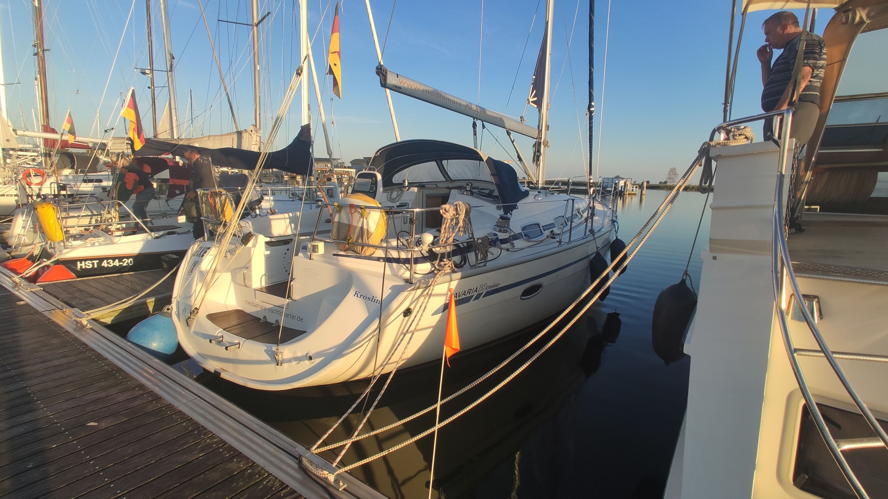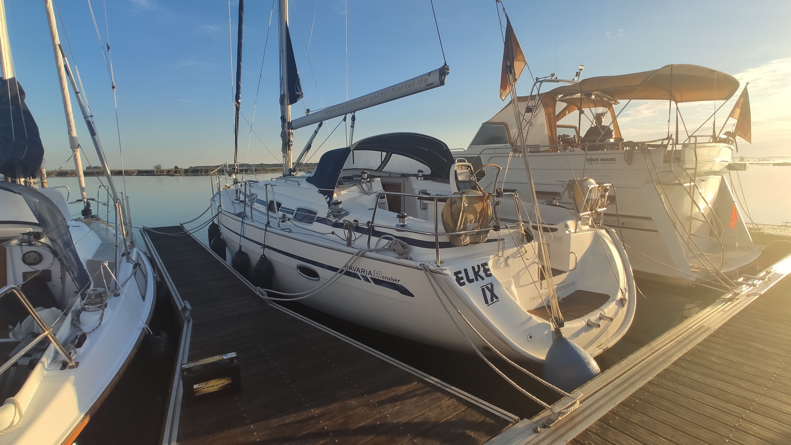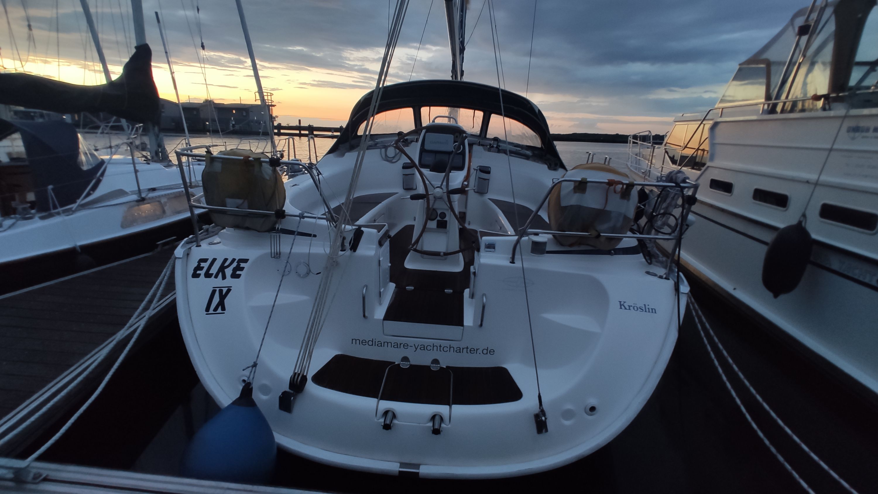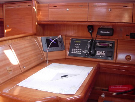 | Navigation | Barometer, Echolot, Fernglas, GPS mit Kartenplotter im Cockpit, Hafenhandbücher, Handpeilkompass, Radar, Seekarten, Steuerkompass, Sumlog, Windmesser |