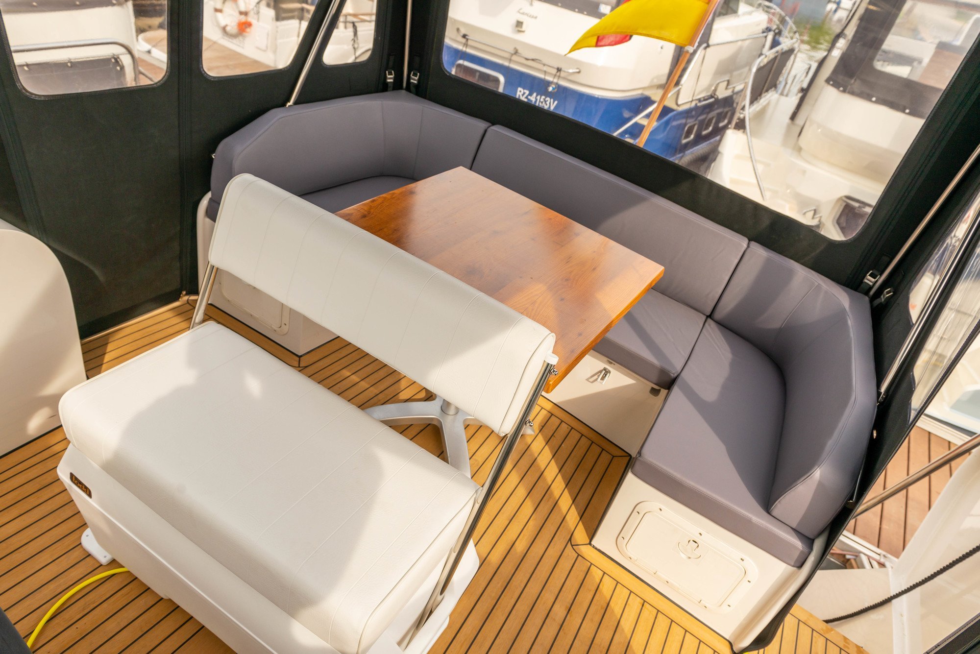 | Outside | Anker mit Kette, Ankerwinsch, Badeleiter, Badeplattform, Flybridgepersenning, Hafenpersenning |