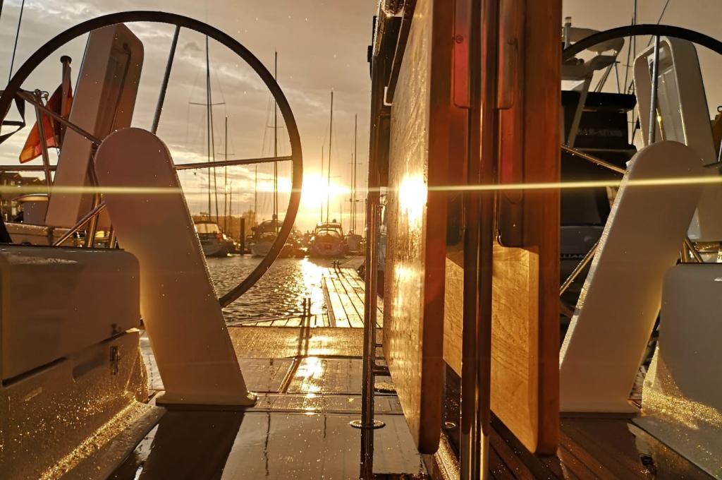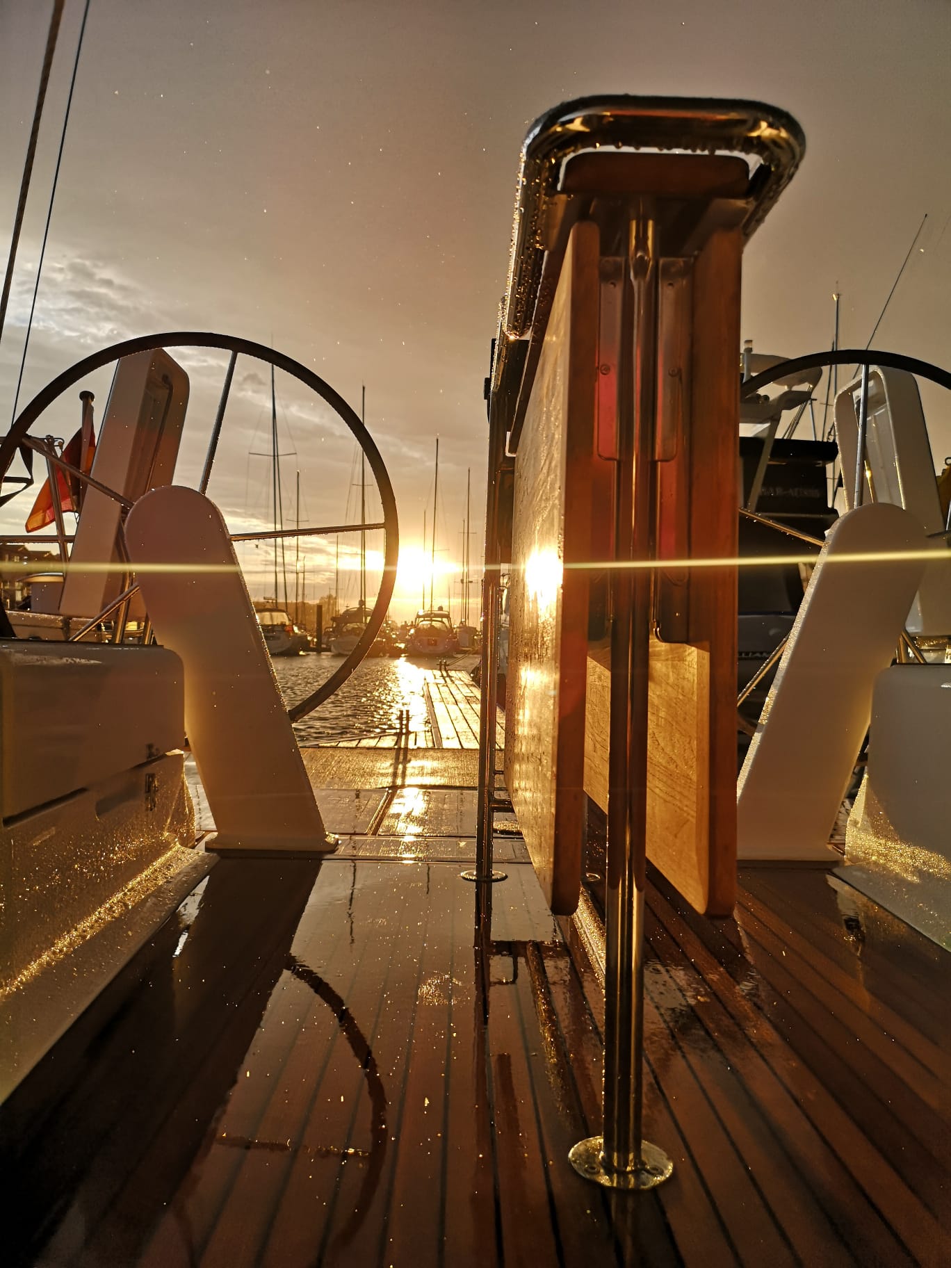 | Outside | 220 V-Landanschluss, Bootshaken, CQR-Anker, elektr. Ankerwinsch, Fallwinschen, Fender, Festmacherleinen, Genuawinschen, selbstholend, Heckanker, Sprayhood, Windex |