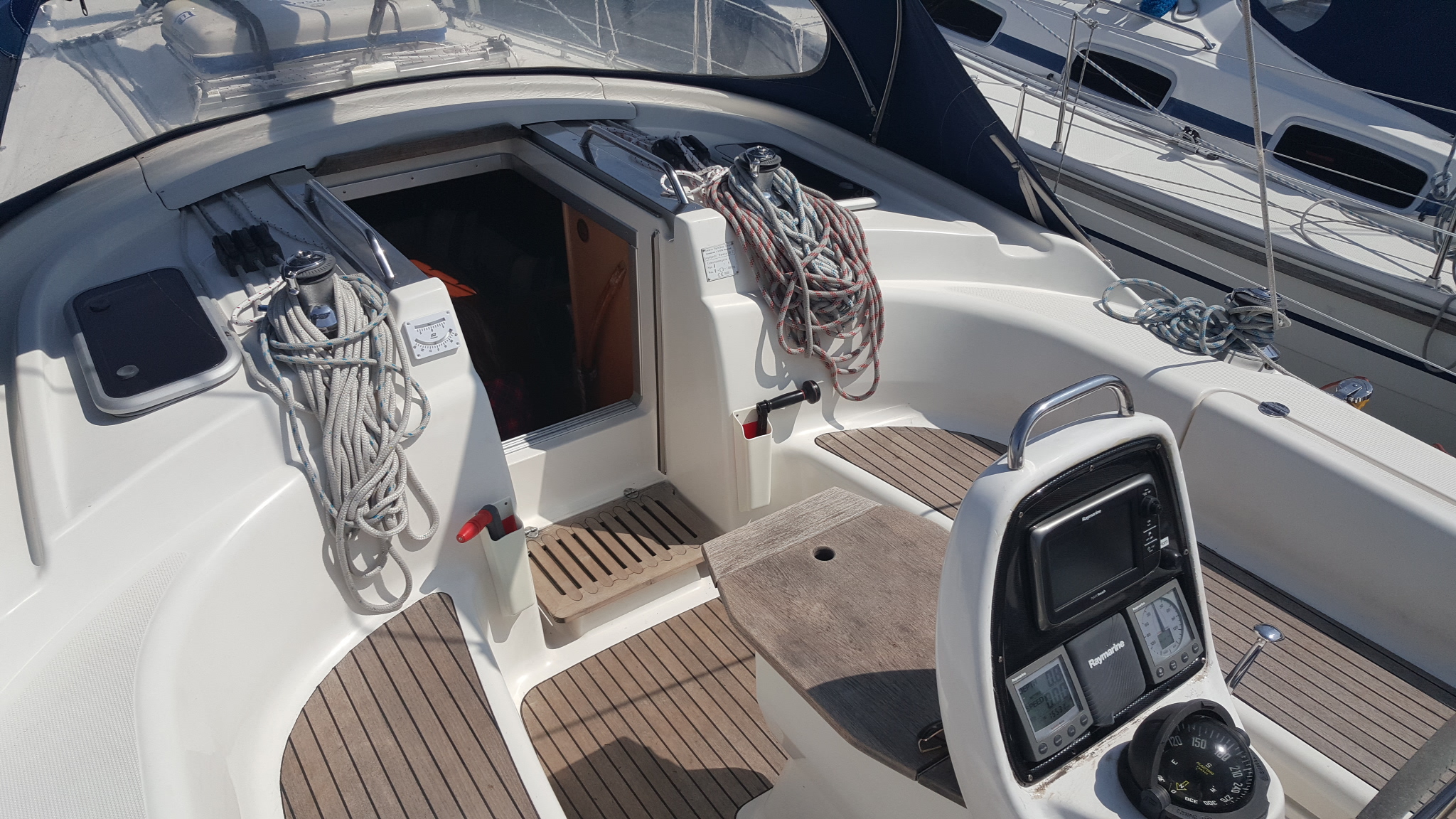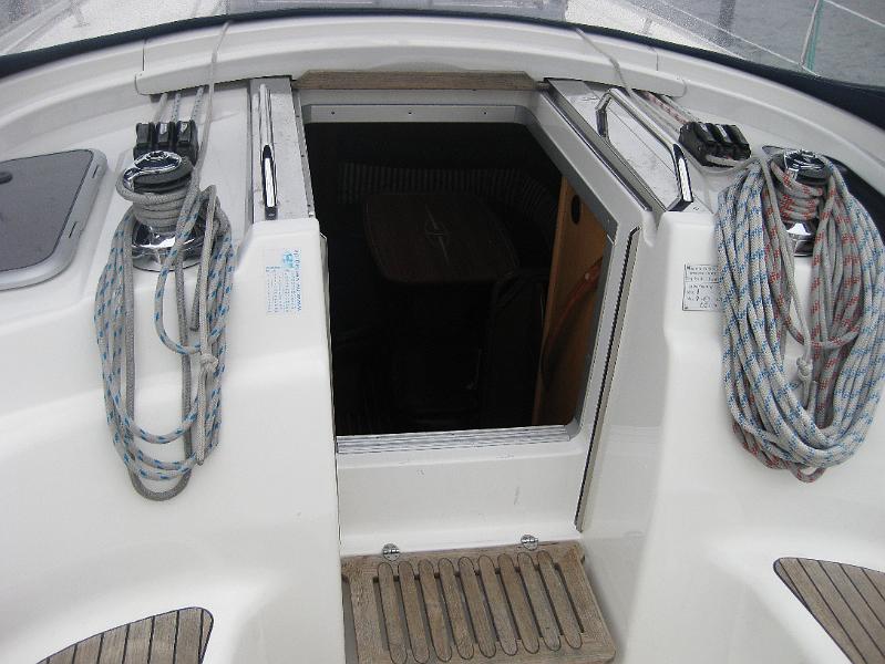 | Outside | 220 V-Landanschluss, Anker mit Kette, Badeleiter, Badeplattform, Bootshaken, Cockpitlautsprecher, Cockpitpolster, Cockpittisch, Deckbeleuchtung, elektr. Ankerwinsch, Fender, Festmacherleinen, Heckanker, Heckdusche, Seereling, Sprayhood, Teak im Cockpit, Wantenschneider, Windex, Winschen |