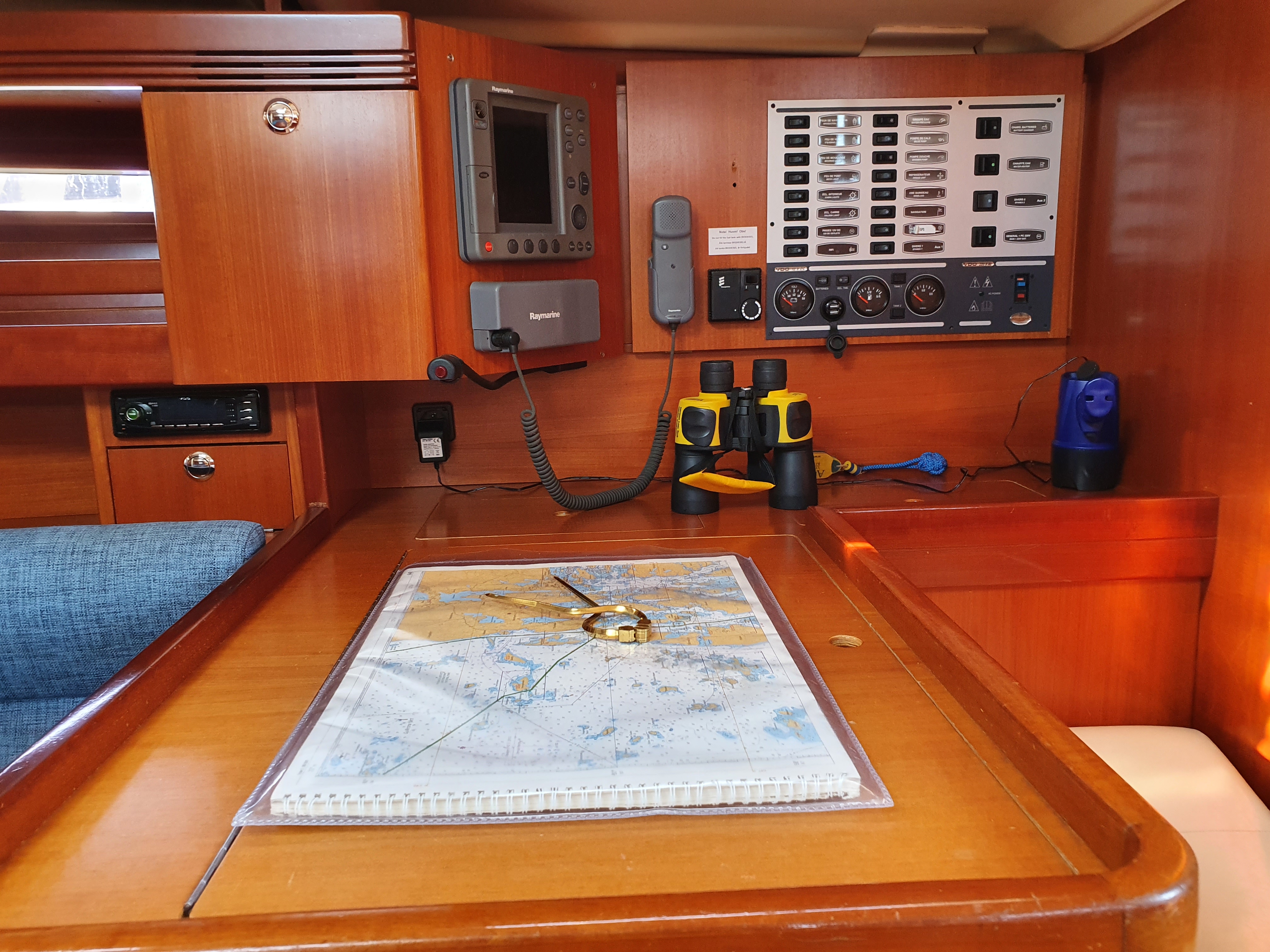 | Navigation | Echolot, elektr. Seekarten, Fernglas, GPS mit Farbkartenplotter, Hafenhandbücher, Kompass, Seekarten, Sumlog |