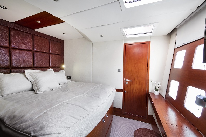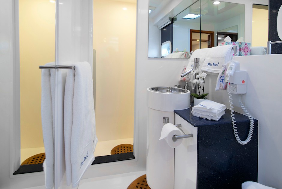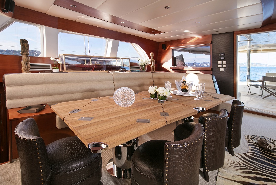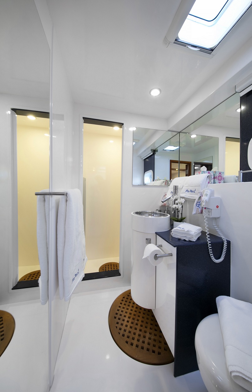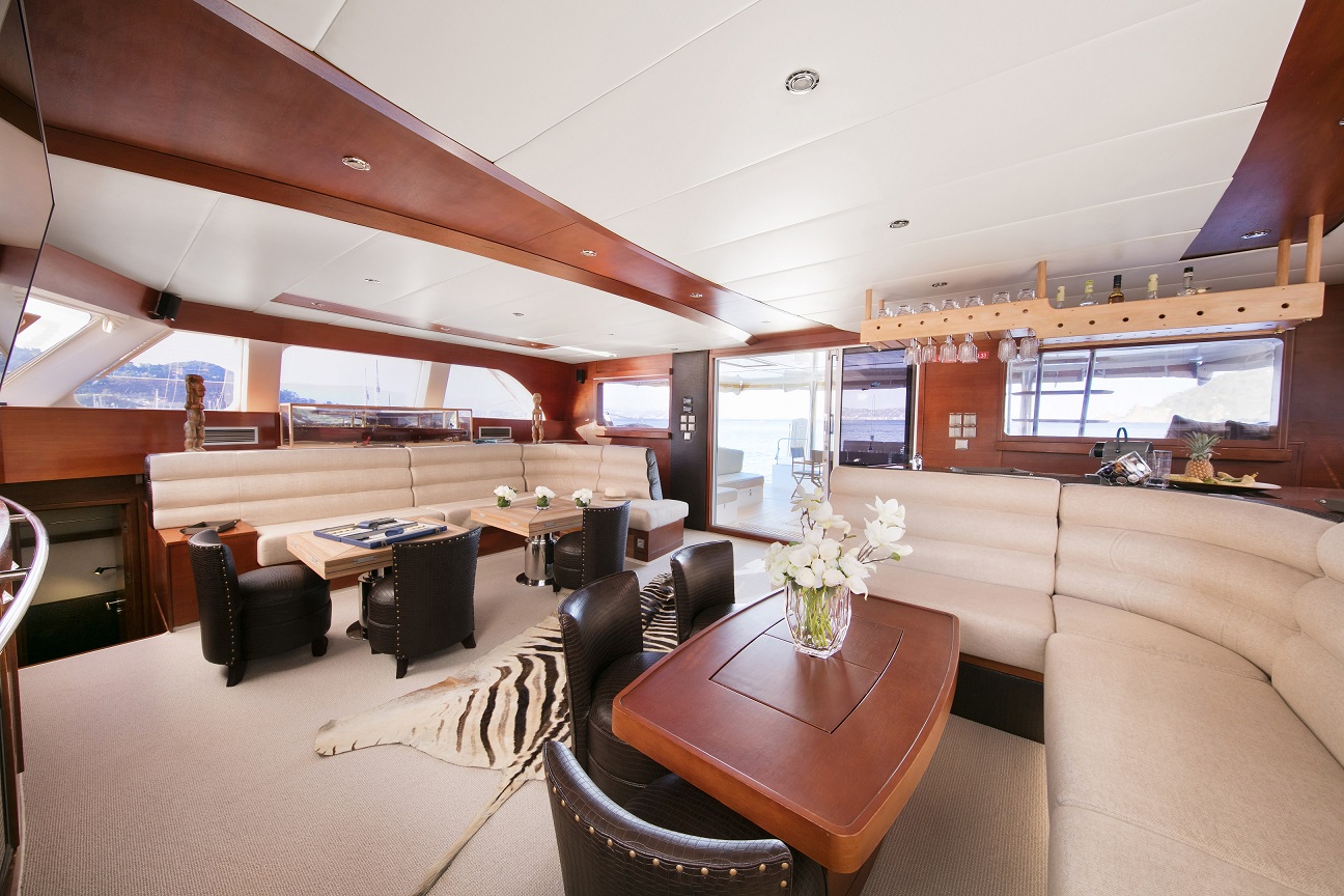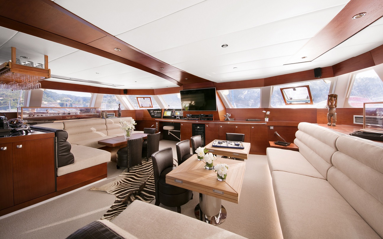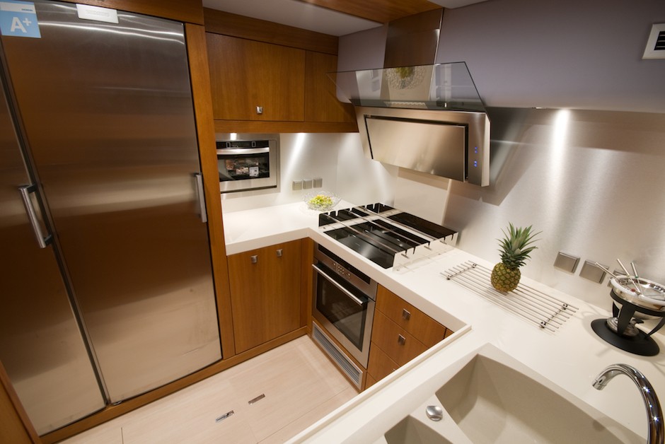 | Inside | Dusche, Eiswürfelmaschine, Gasherd mit Backofen, Gefrierschrank, Generator, Geschirrspüler, Inverter 12V/220V, Klimaanlage (ohne Landstrombedarf), Kühlschrank, Mikrowelle, Pantryausstattung, TV, Warmwasser, Watermaker, WC (elektr.), Weinkühlschrank |
