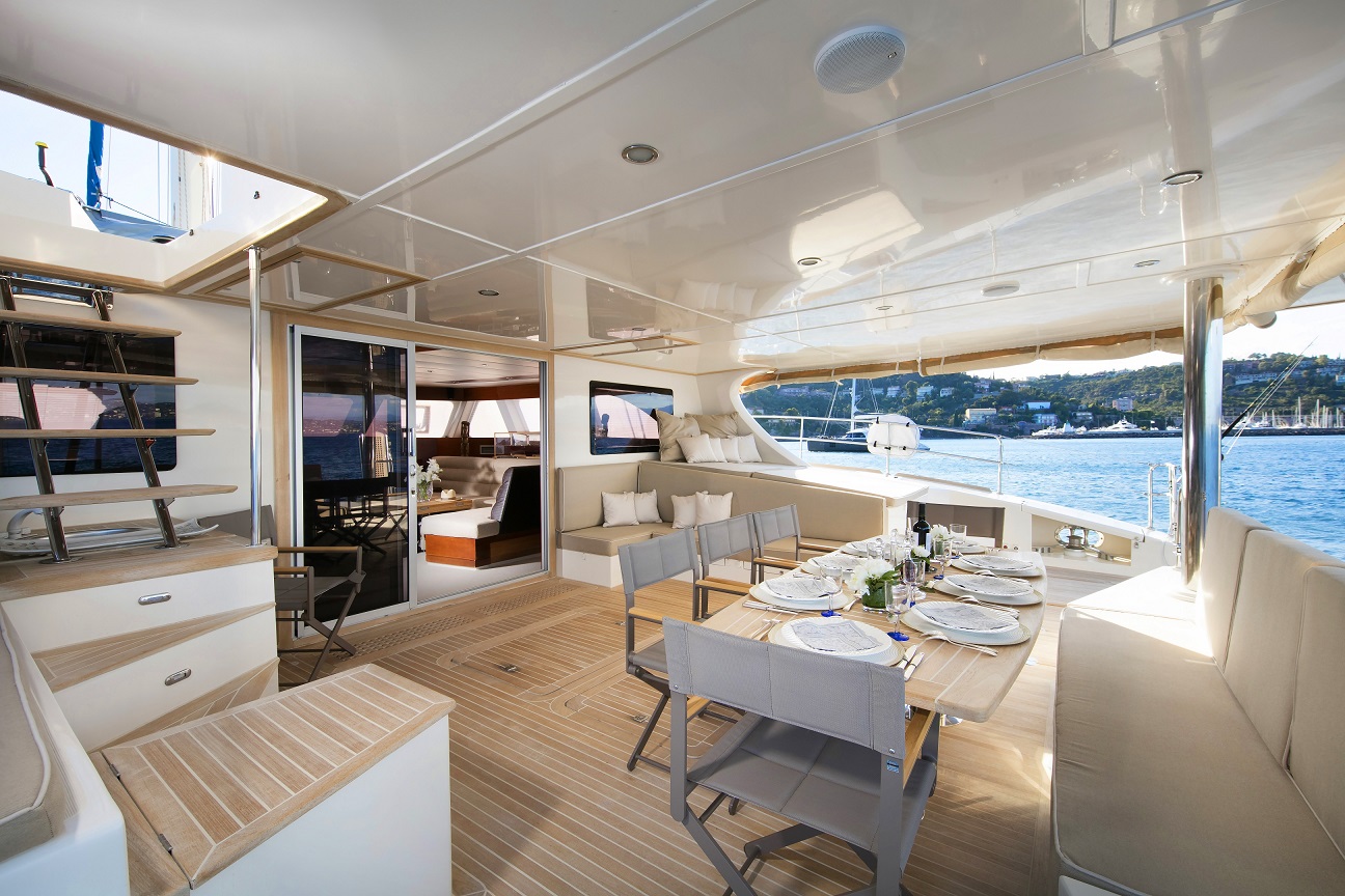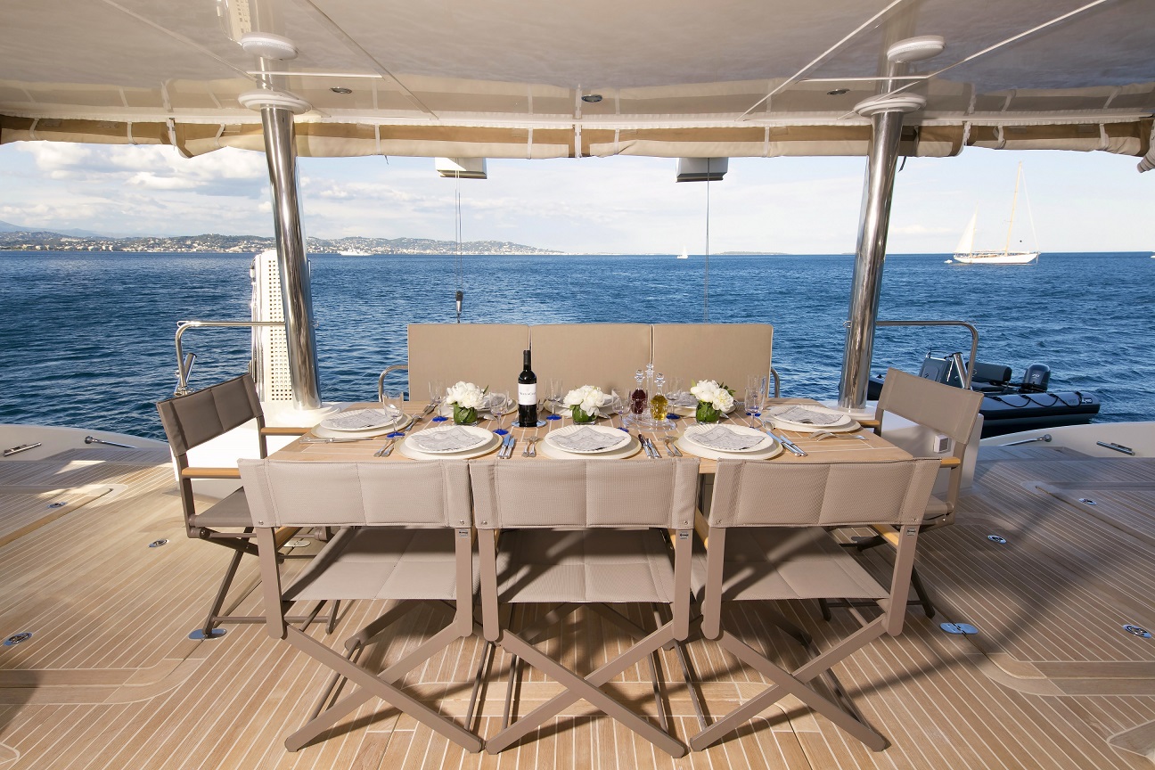 | Outside | Badeleiter, Badeplattform, Biminitop, Cockpitdusche, Cockpitpolster, Cockpittisch, Davits, elektr. Ankerwinsch, elektr. Winsch, Flybridge, Gangway, Grill, Schnorchelausrüstung |