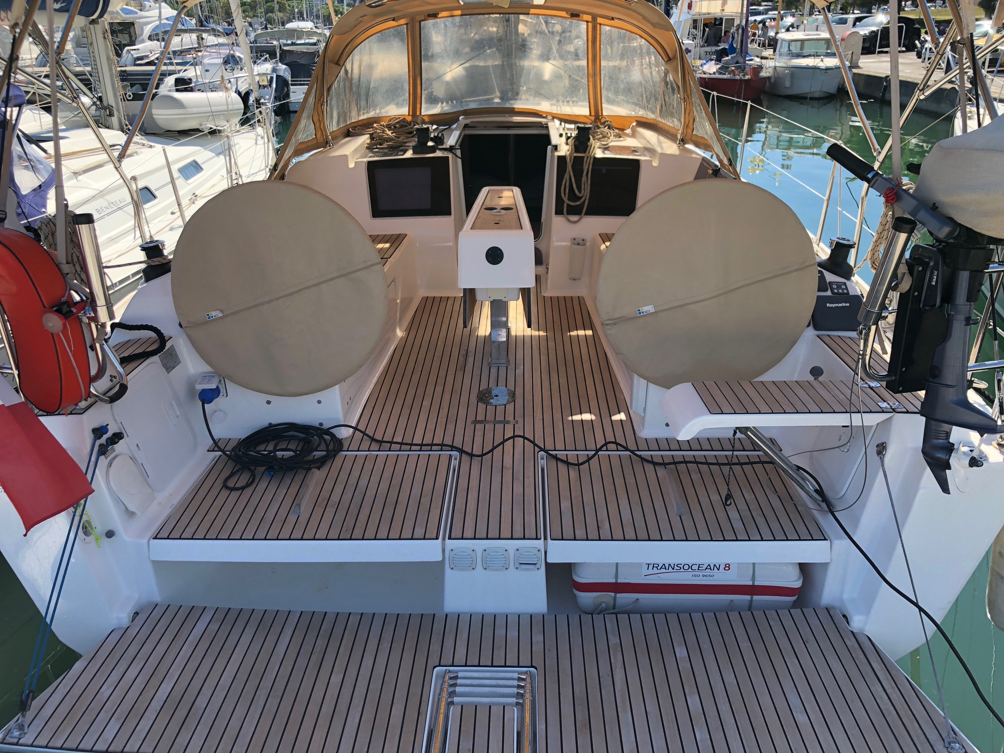 Outside 220 V-Landanschluss, Außendusche, Biminitop, Cockpittisch, elektr. Ankerwinsch