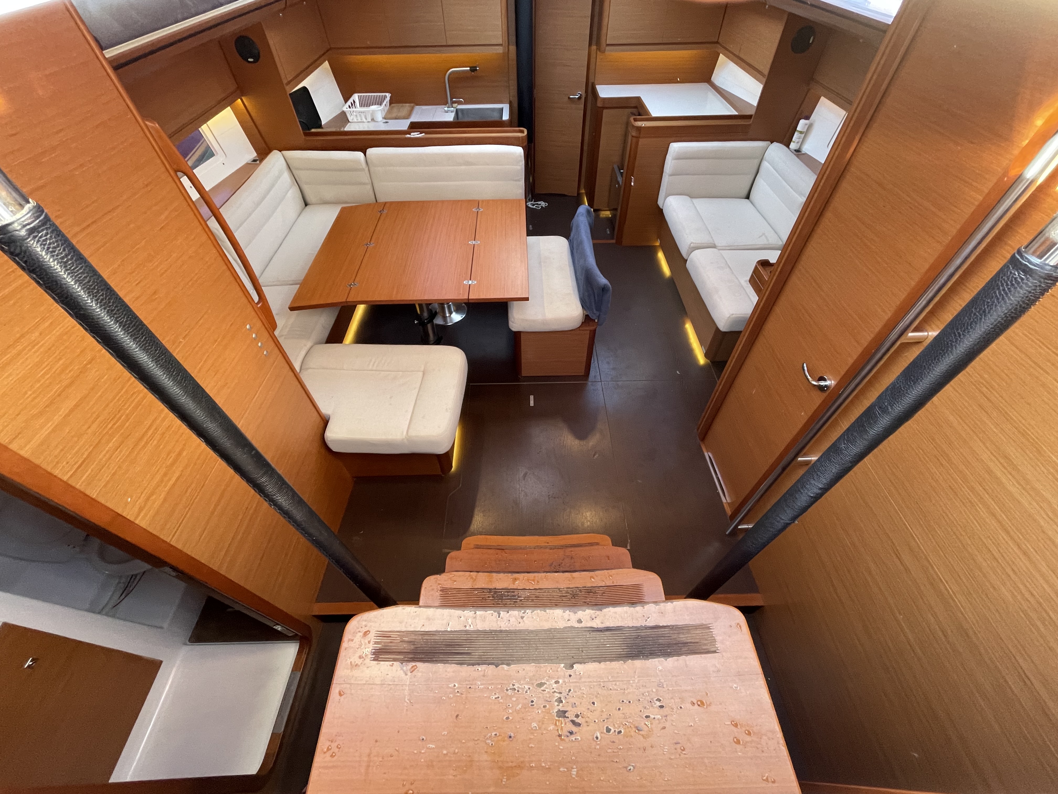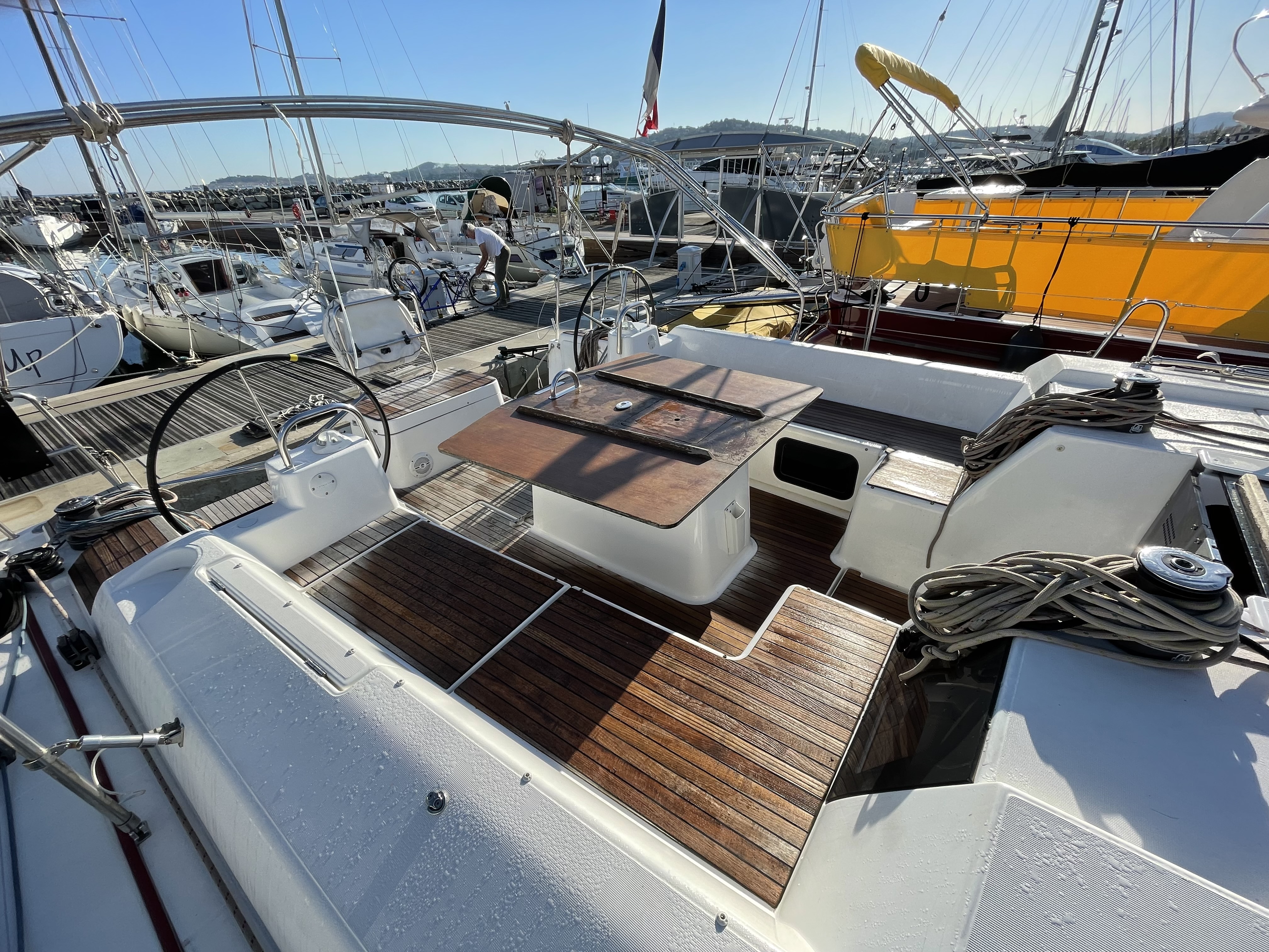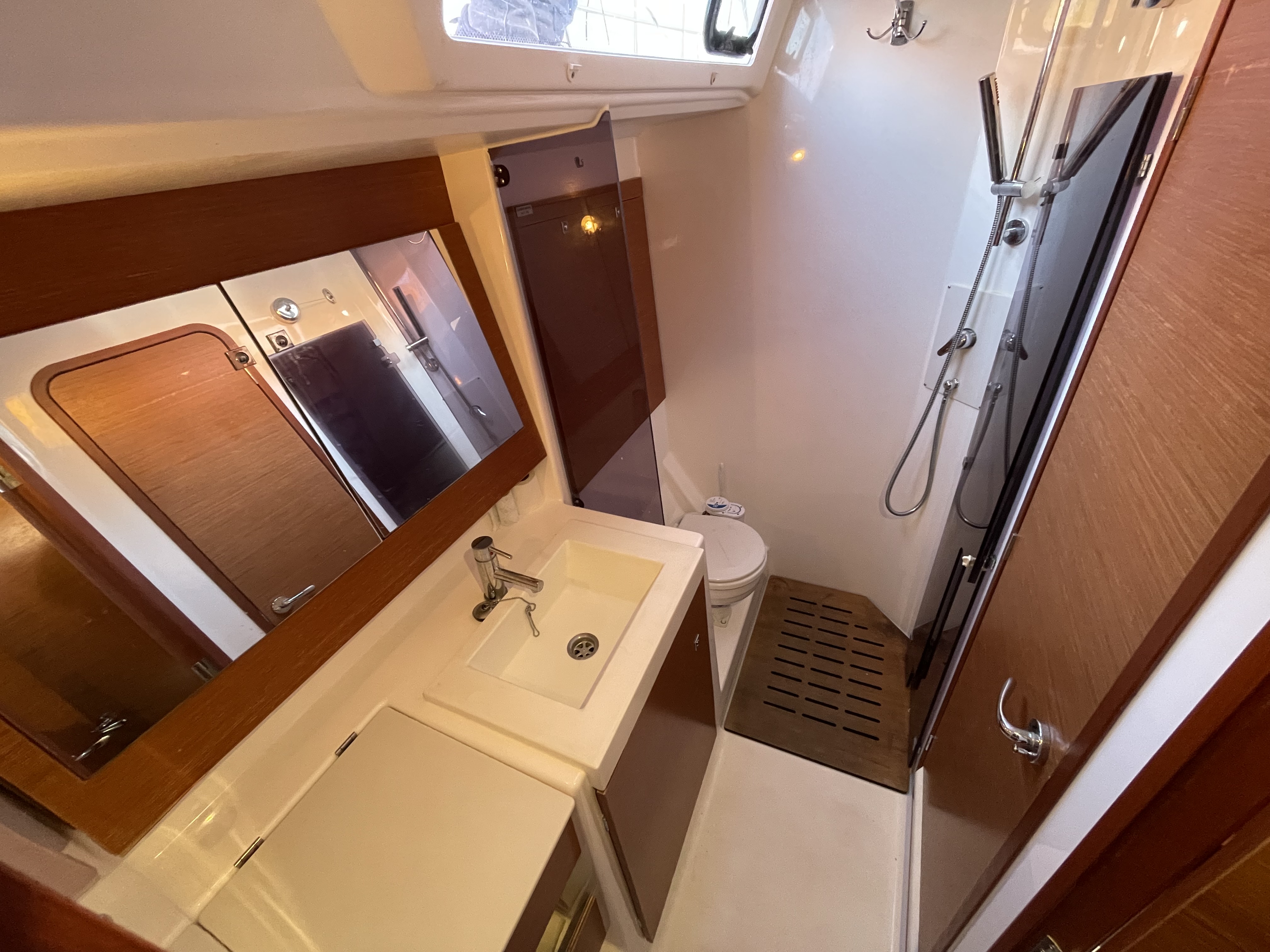 | Outside | Biminitop, Cockpittisch, elektr. Ankerwinsch, Gangway, Solaranlage, Sprayhood, Teakdeck |
