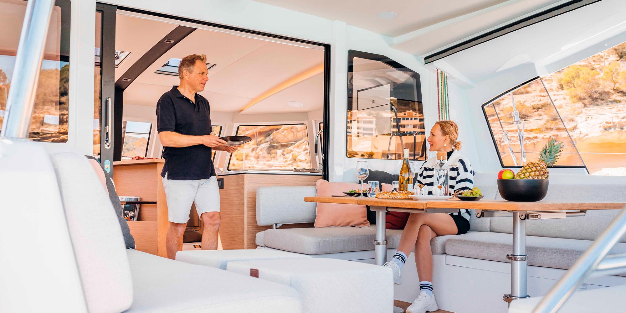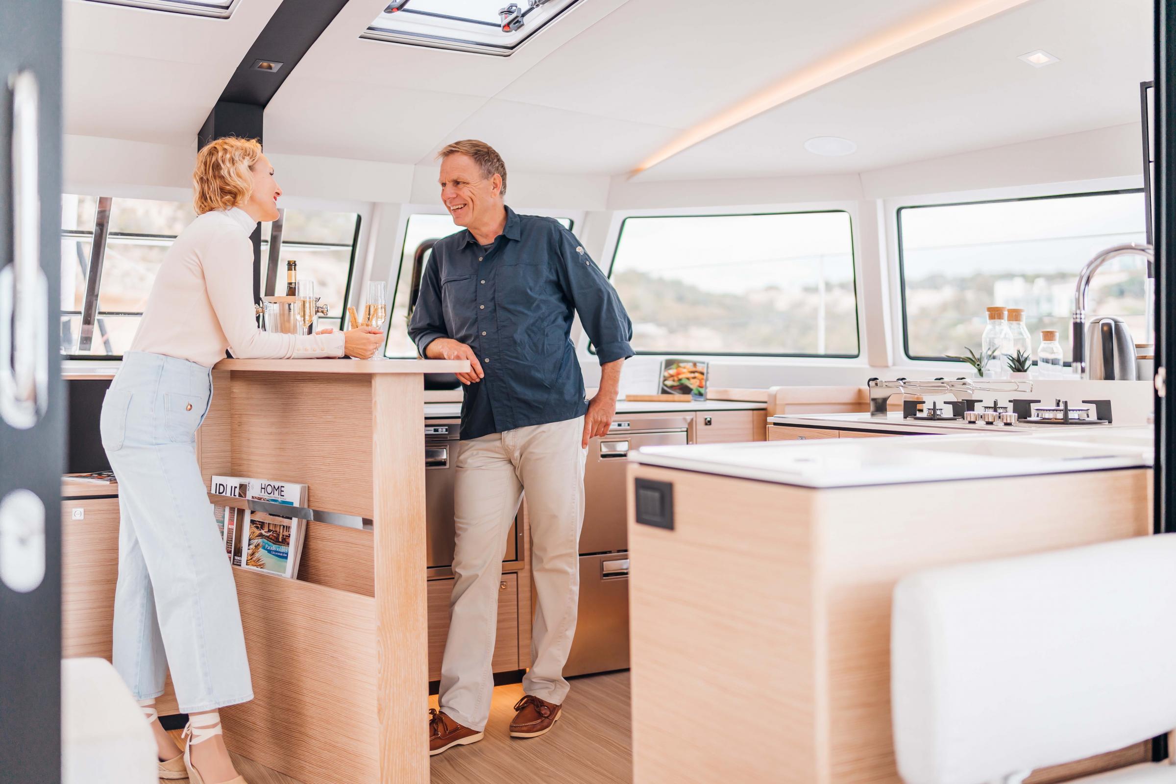 | Inside | Gasherd mit Backofen, Gefrierschrank, Generator, Heizung, Klimaanlage (ohne Landstrombedarf), Kühlschrank, Mikrowelle, Radio mit Bluetooth, Ventilator, Warmwasser, Waschmaschine, Watermaker, WC (elektr.) |