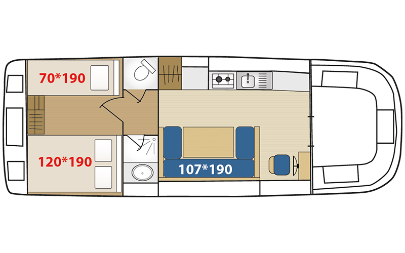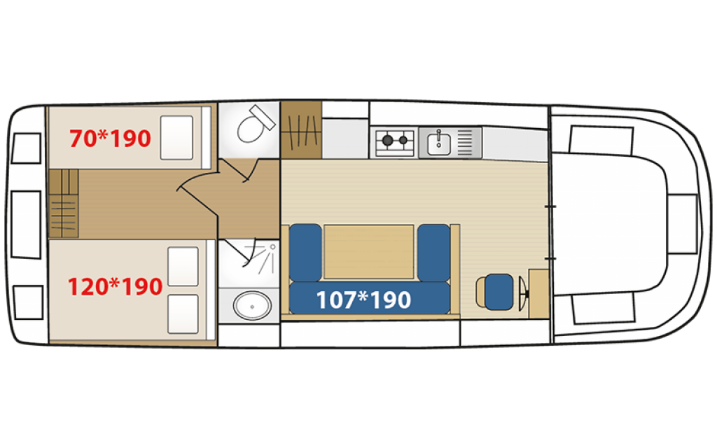 | Inside | Backofen, Dusche, Gasherd, Geschirr, Heizung, Kühlschrank, Pantryausstattung, Spülbecken, WC |