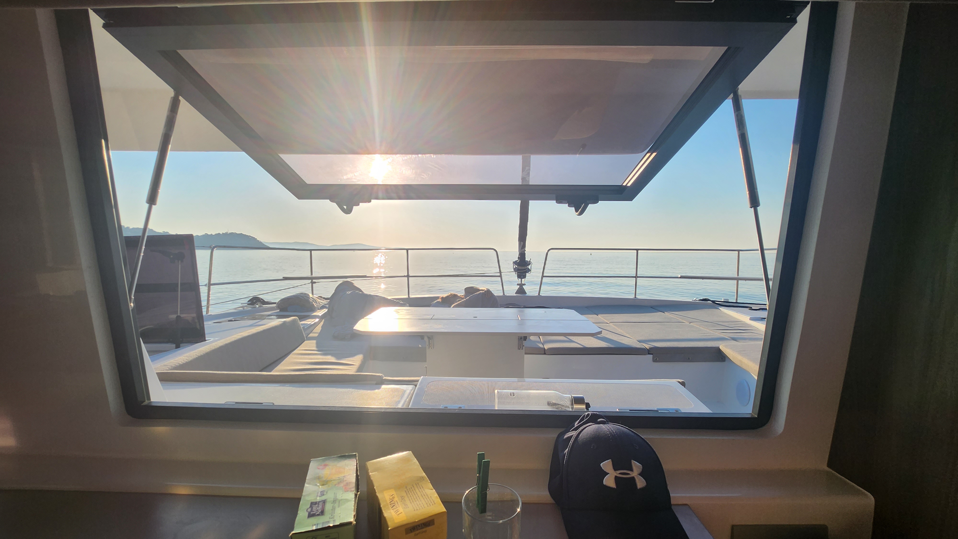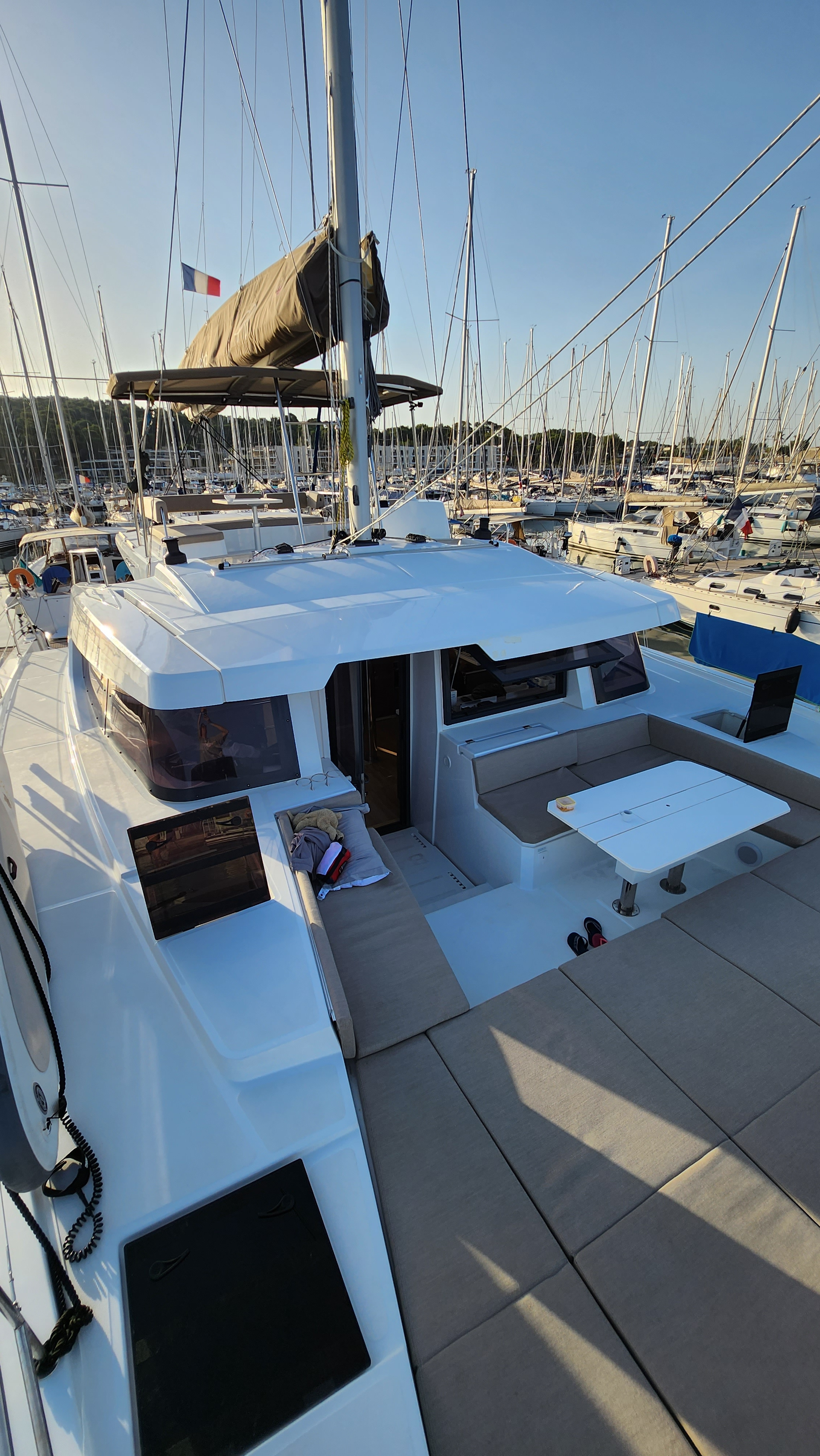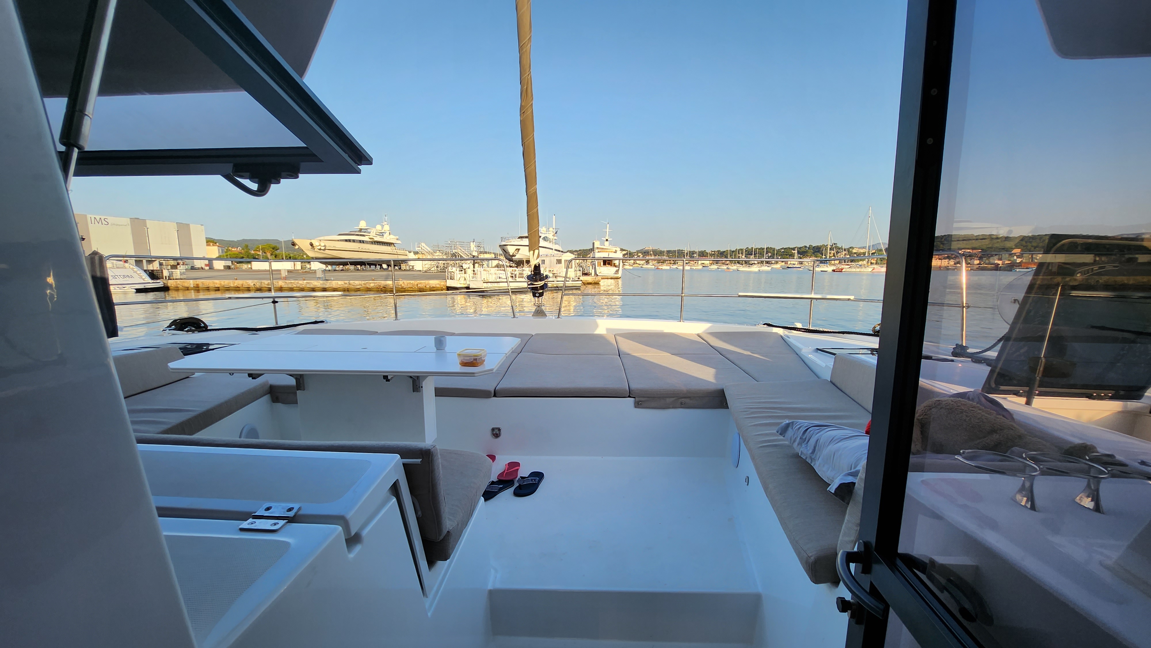 Outside Badeleiter, Cockpitdusche, Cockpittisch, Davits, elektr. Ankerwinsch, elektr. Winsch, Solaranlage