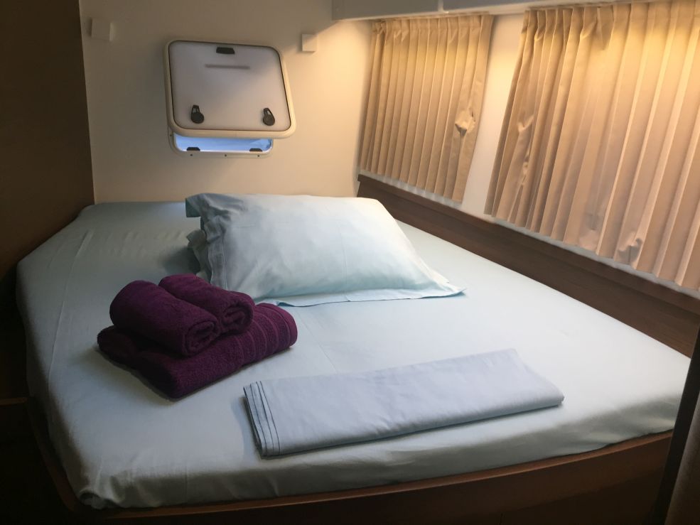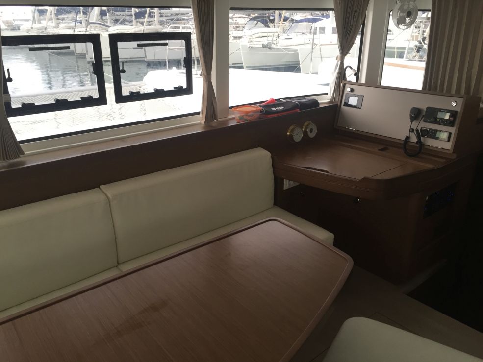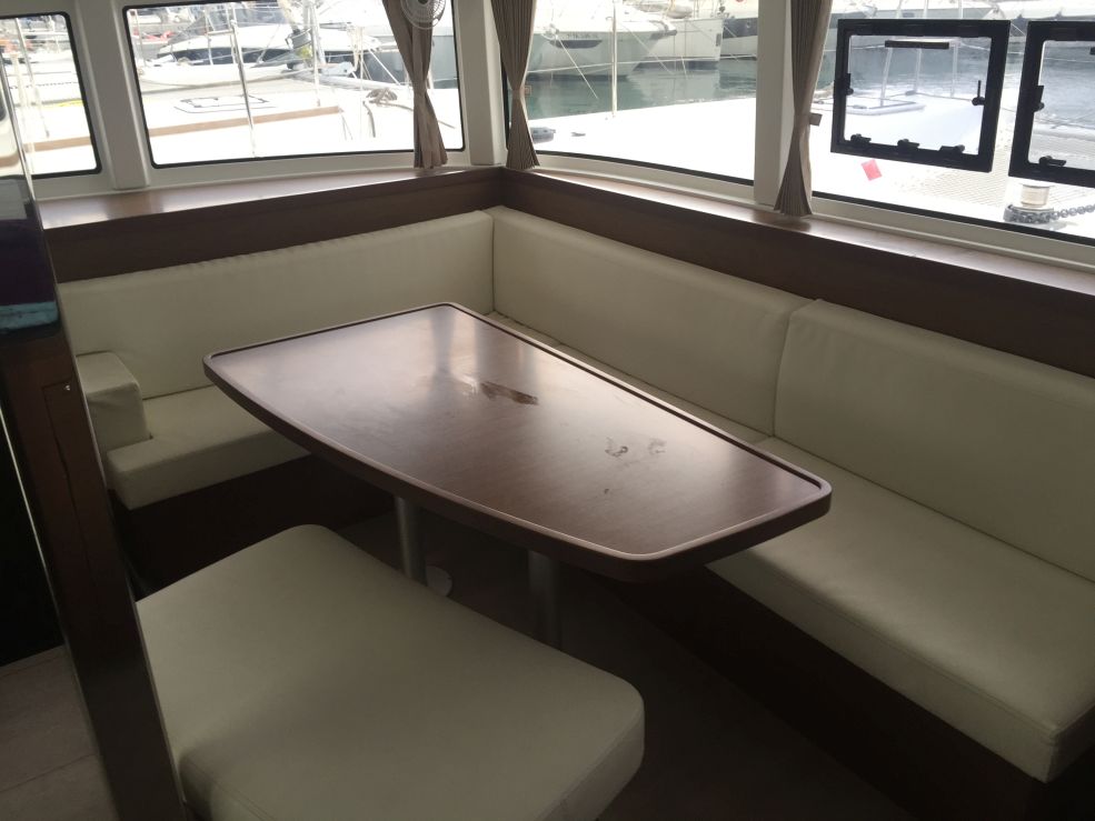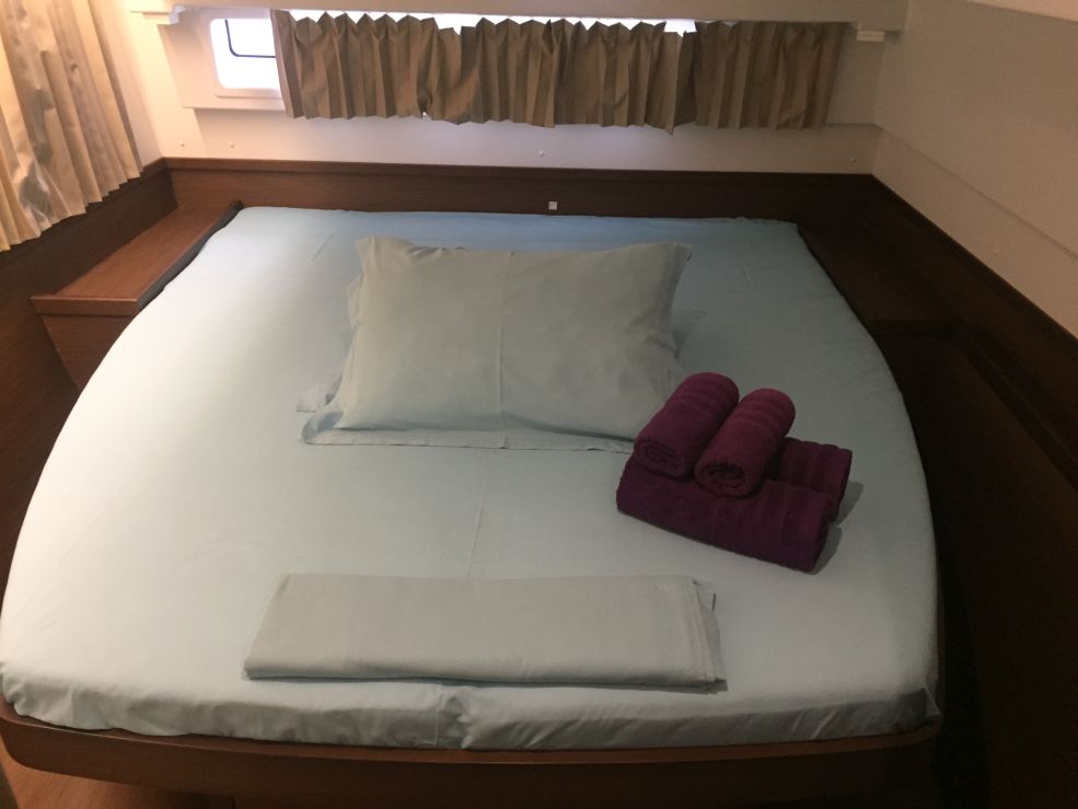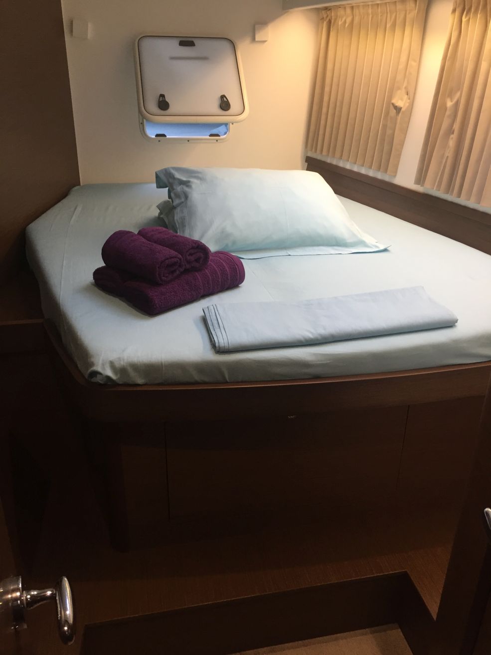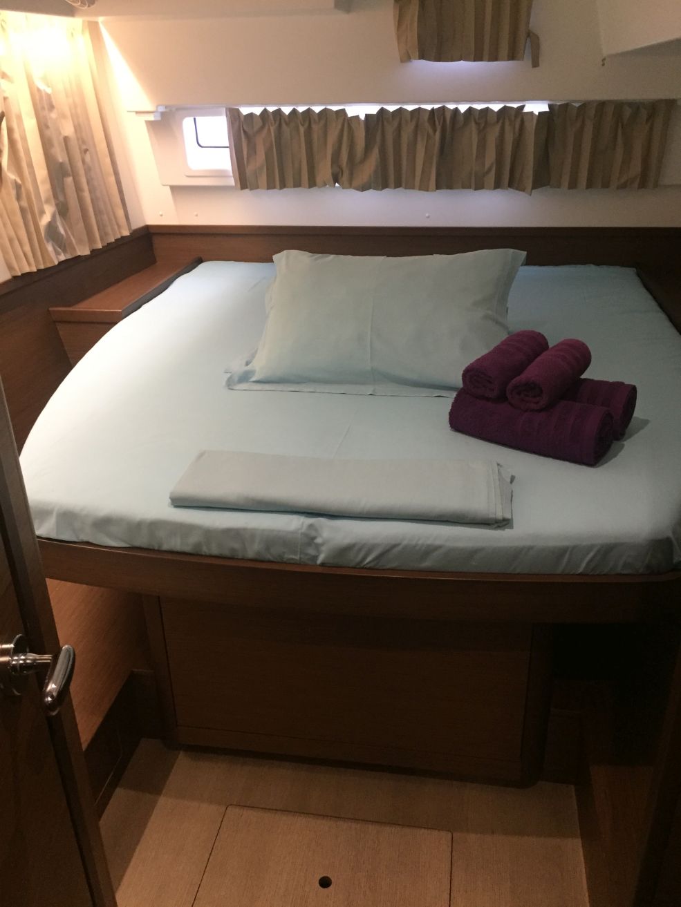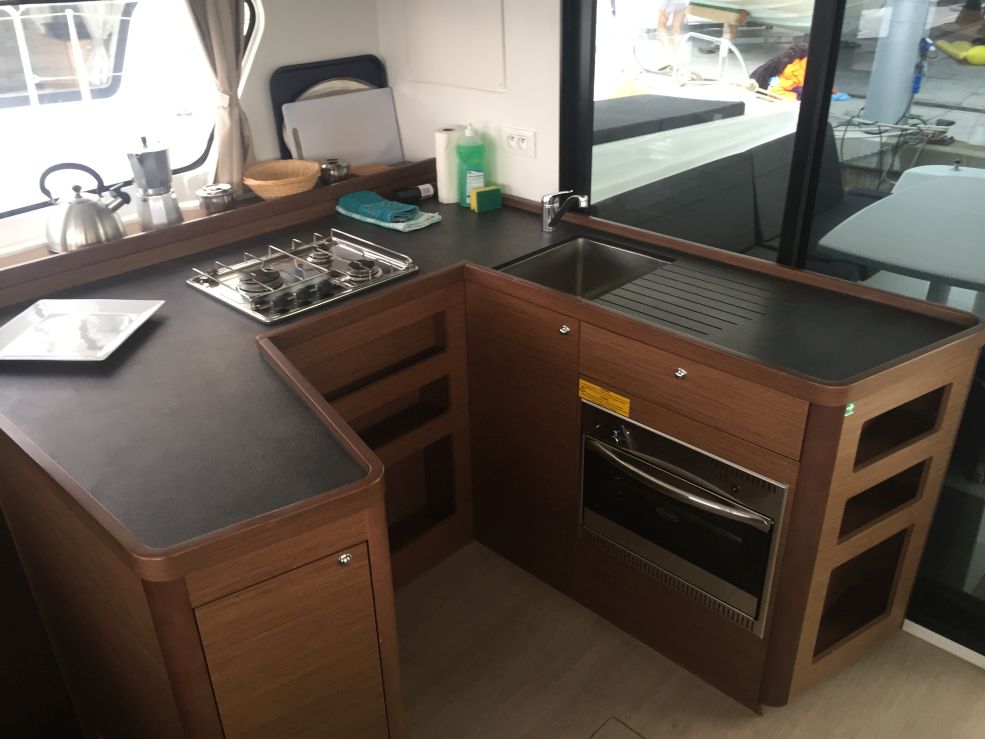 | Inside | 2. Kühlschrank, 220V Steckdosen, Backofen, FUSION Sound System, Gasherd, Inverter 12V/220V, Kühlschrank, Ladegerät, Radio, Salontisch absenkbar, USB Steckdosen in den Kabinen, Ventilatoren in Salon und Kabinen, WC (elektr.) |