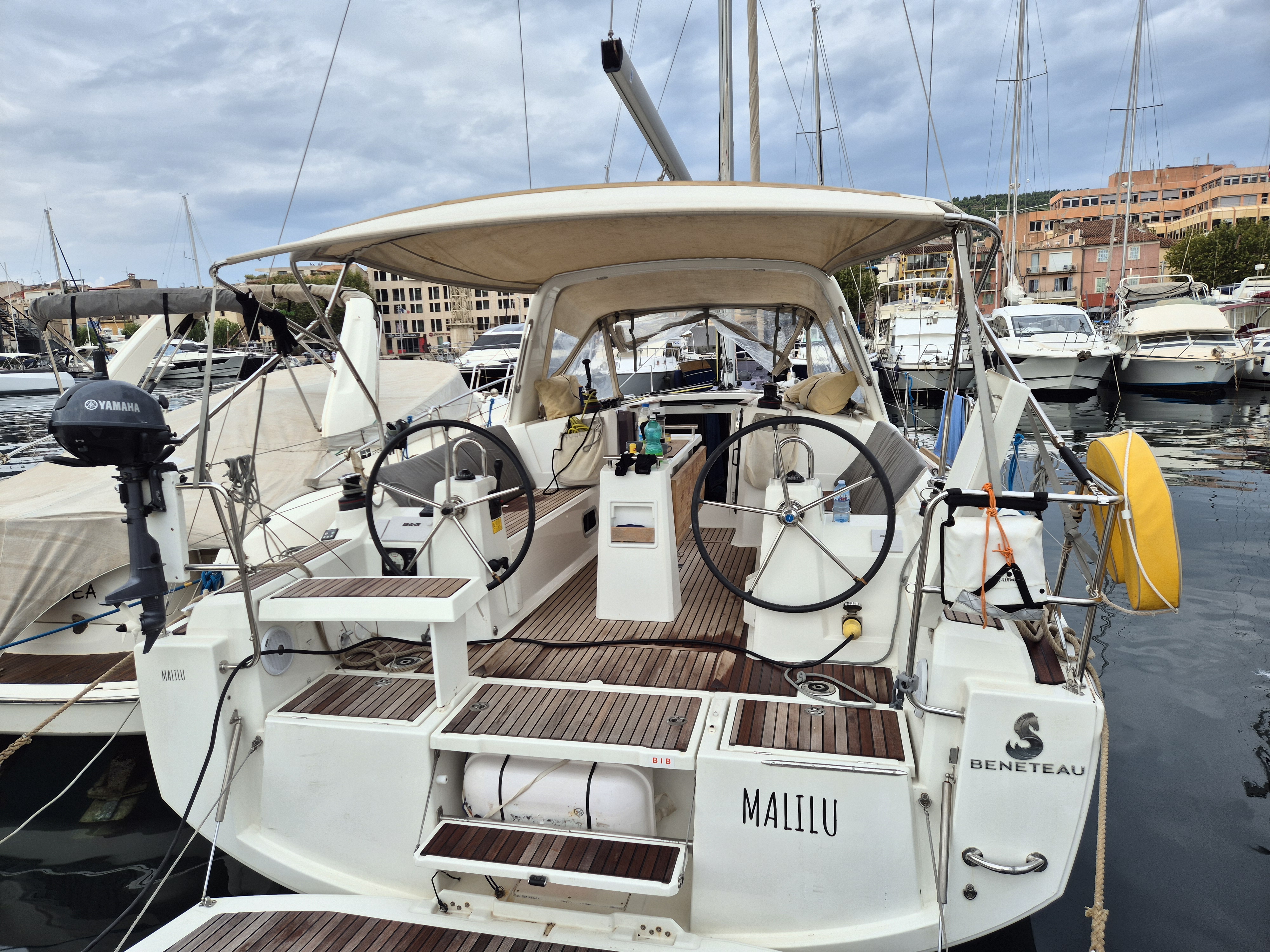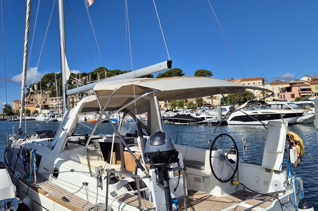 | Outside | Biminitop, Cockpitdusche, Cockpittisch, elektr. Ankerwinsch, Sprayhood, Teak im Cockpit |