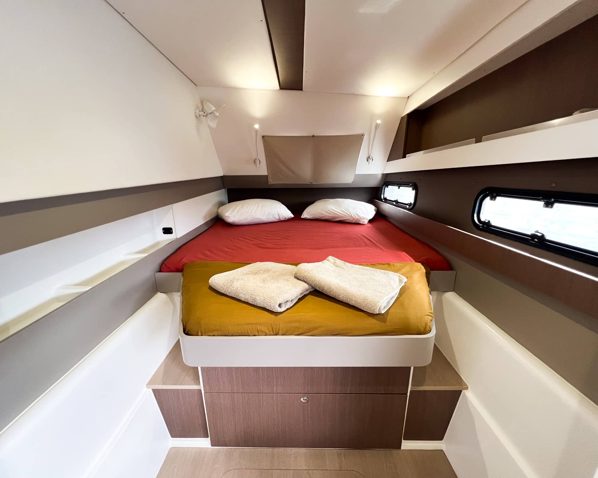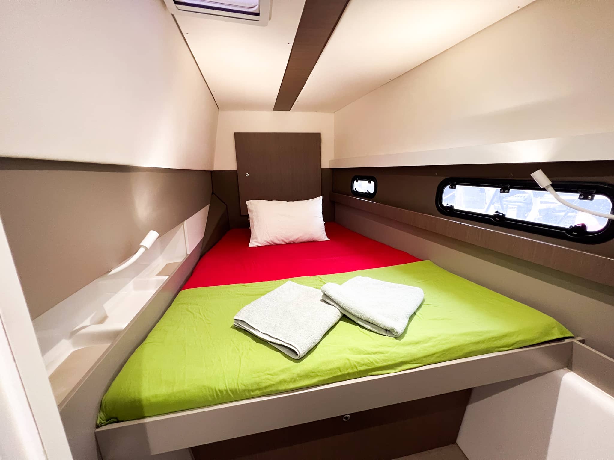 | Safety | AIS Empfänger, Autopilot, Bordapotheke, Bordwerkzeug, elektr. Bilgepumpe, Epirb, Feuerlöscher, Handbilgepumpe, Navigationslichter, Nebelhorn, Notpinne, Notsignale, Radarreflektor, Rettungsinsel, Rettungskragen, Rettungswesten, Schwimmleine, Sicherheitsgurt, Taschenlampe, UKW-Funk, Zweitanker |