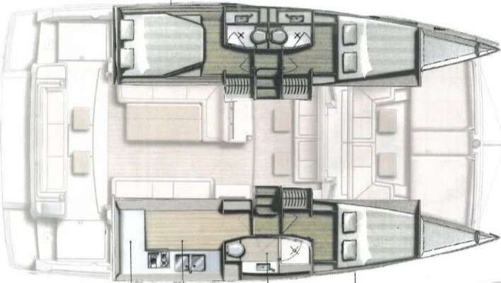 | Outside | Anker mit Kette, Biminitop, Cockpitdusche, Cockpitpolster, Cockpittisch, Davits, Grill, Solaranlage, Unterwasserbeleuchtung, Windex, Winschen |