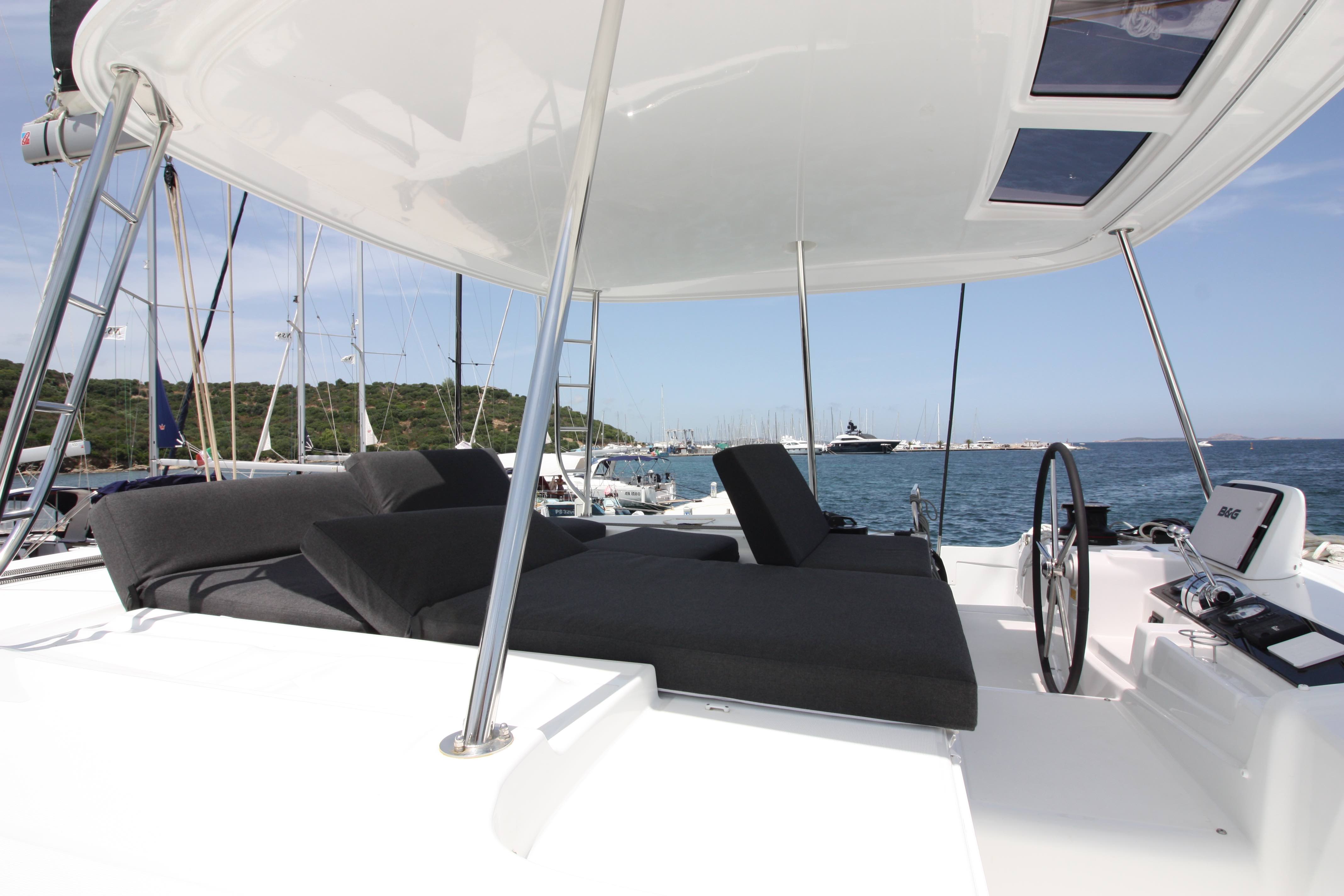 | Outside | Biminitop, Cockpitdusche, Cockpitlautsprecher, Cockpitpolster, Deckpolster, elektr. Ankerwinsch, elektr. Winsch, Teak im Cockpit |