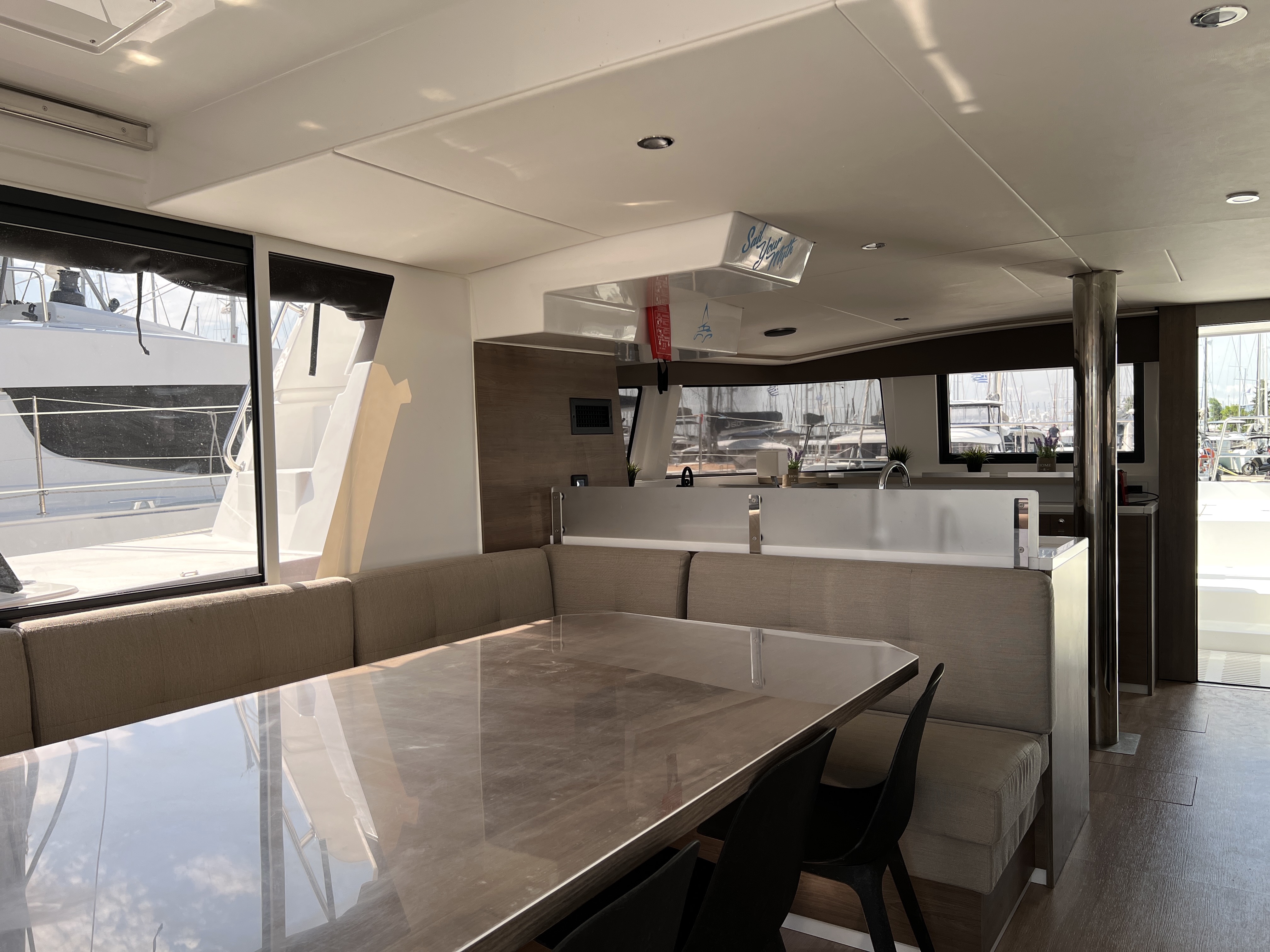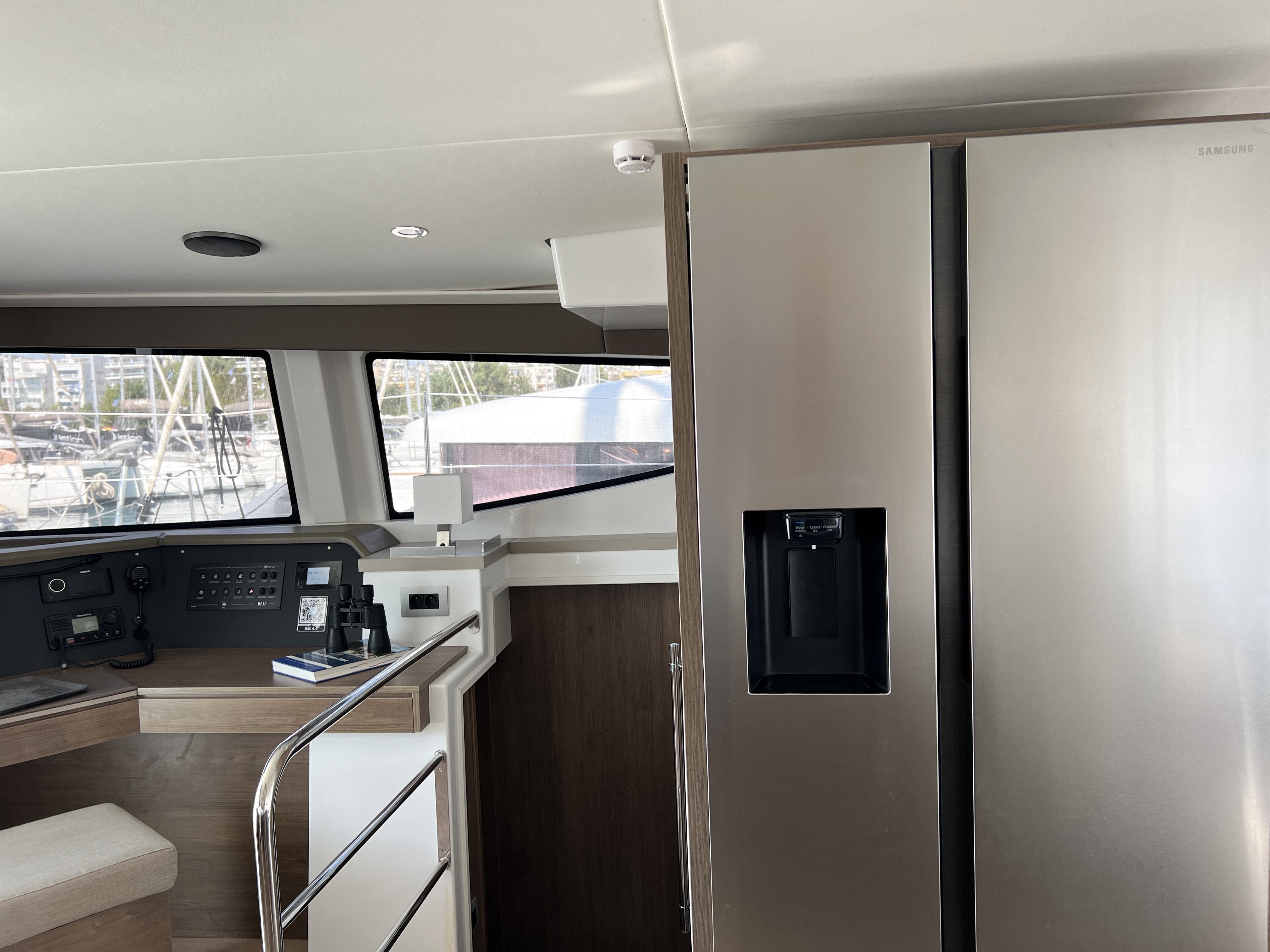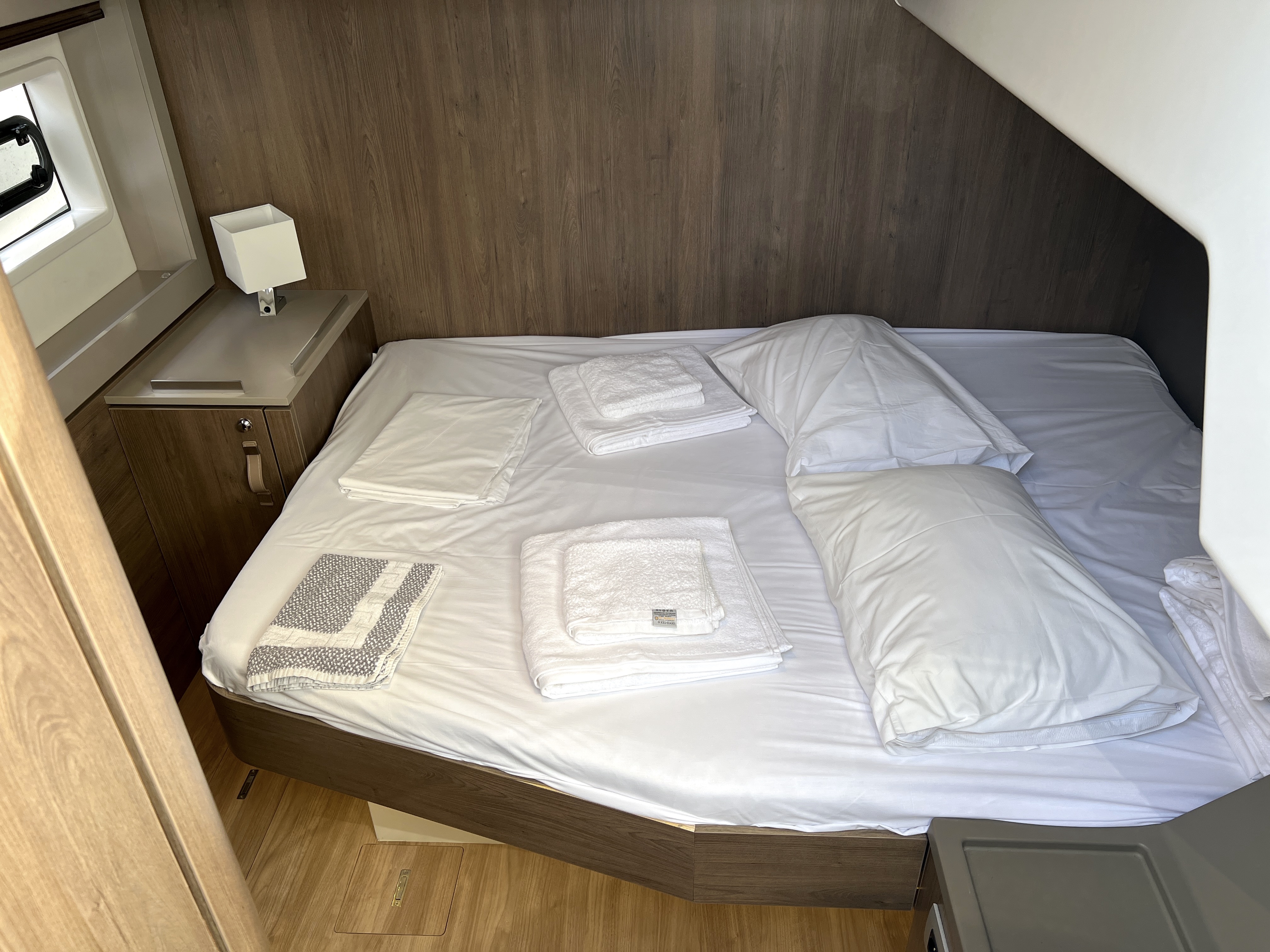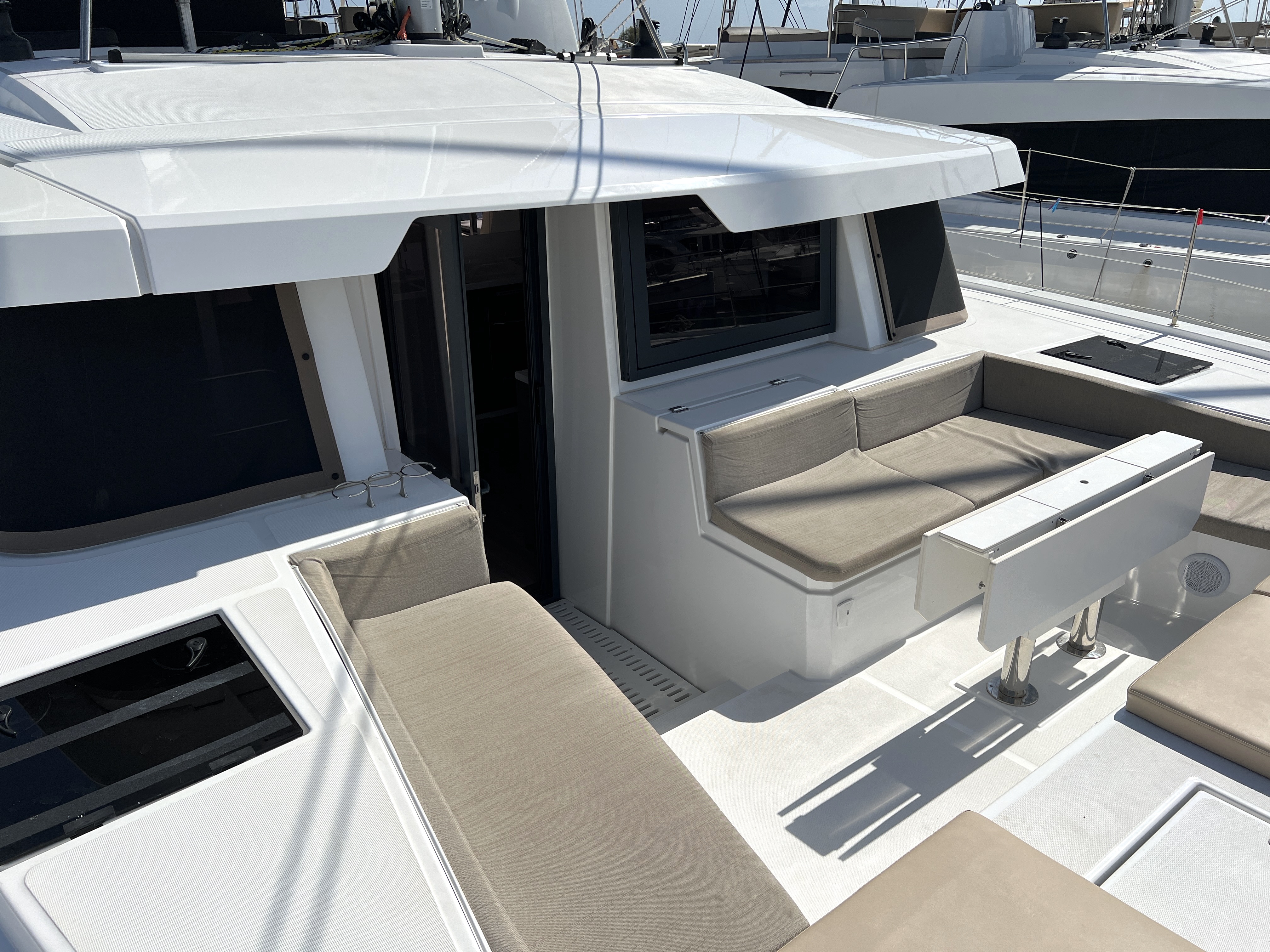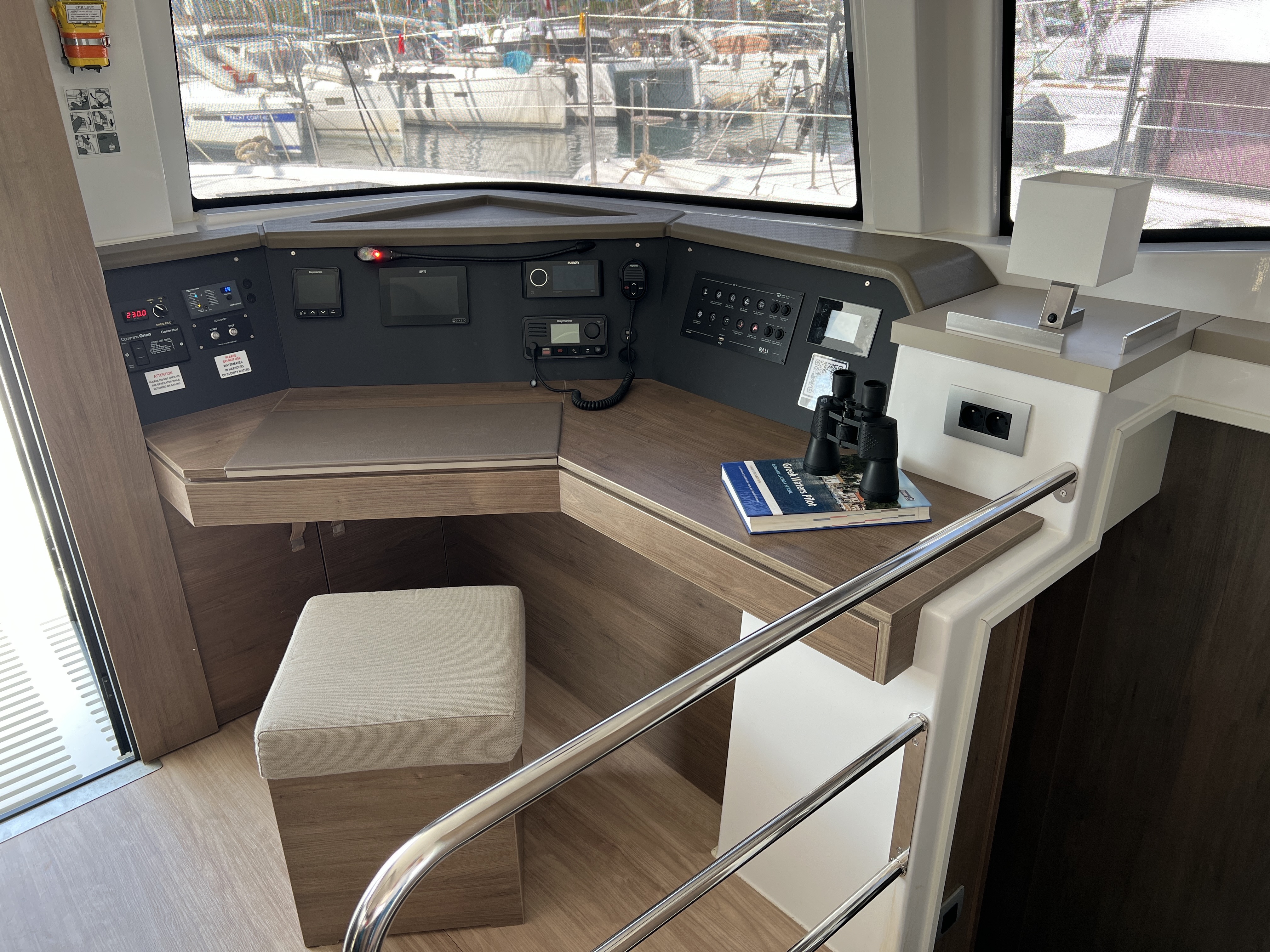 | Inside | 220V Steckdosen, FUSION Sound System, Gasherd mit Backofen, Gefrierschrank, Generator, Heizung, Inverter 12V/220V, Klimaanlage (ohne Landstrombedarf), Kühlschrank, Nespresso-Maschine, Pantryausstattung, Ventilatoren in Kabinen, Warmwasser, Watermaker, WC (elektr.) |
