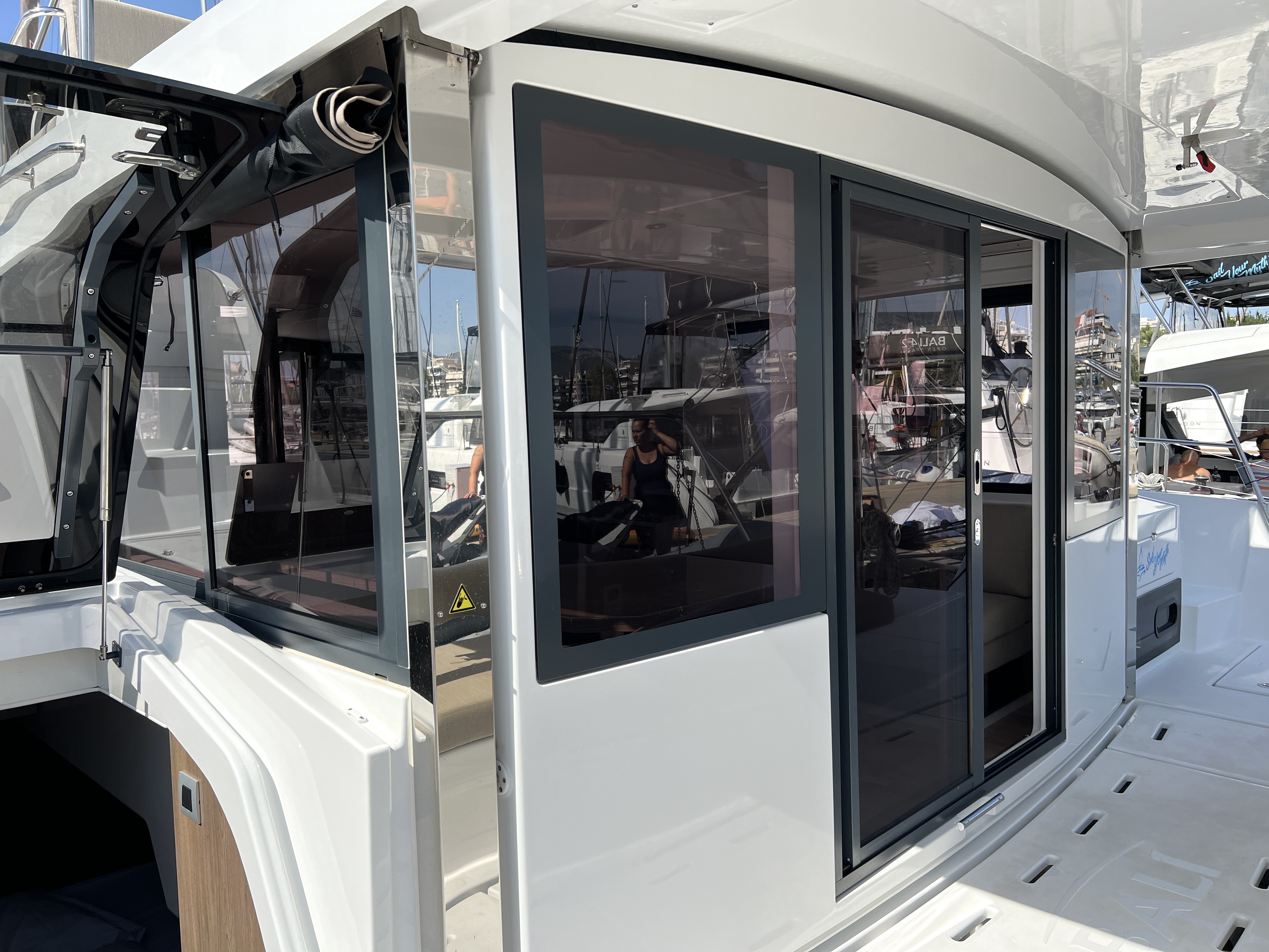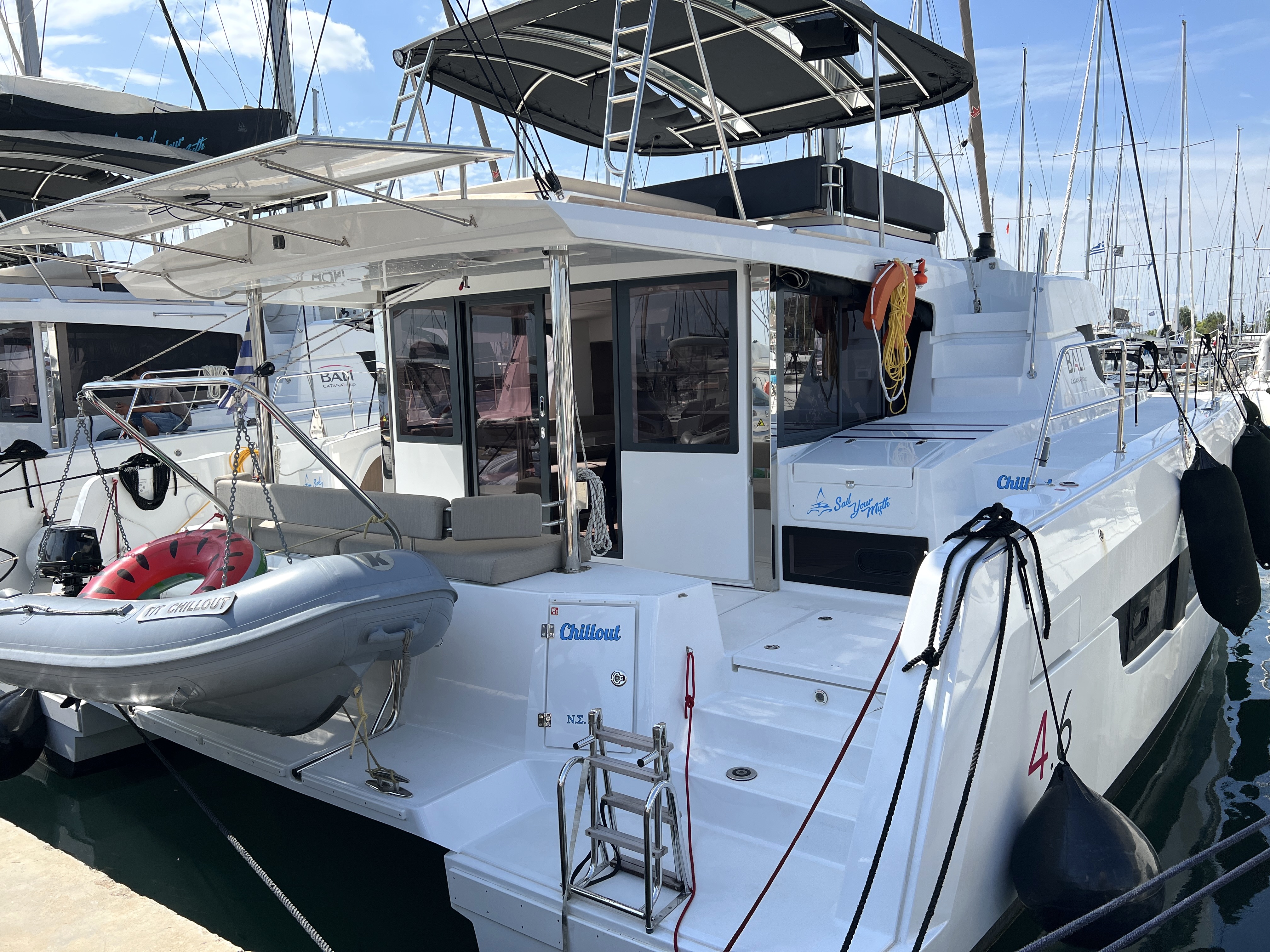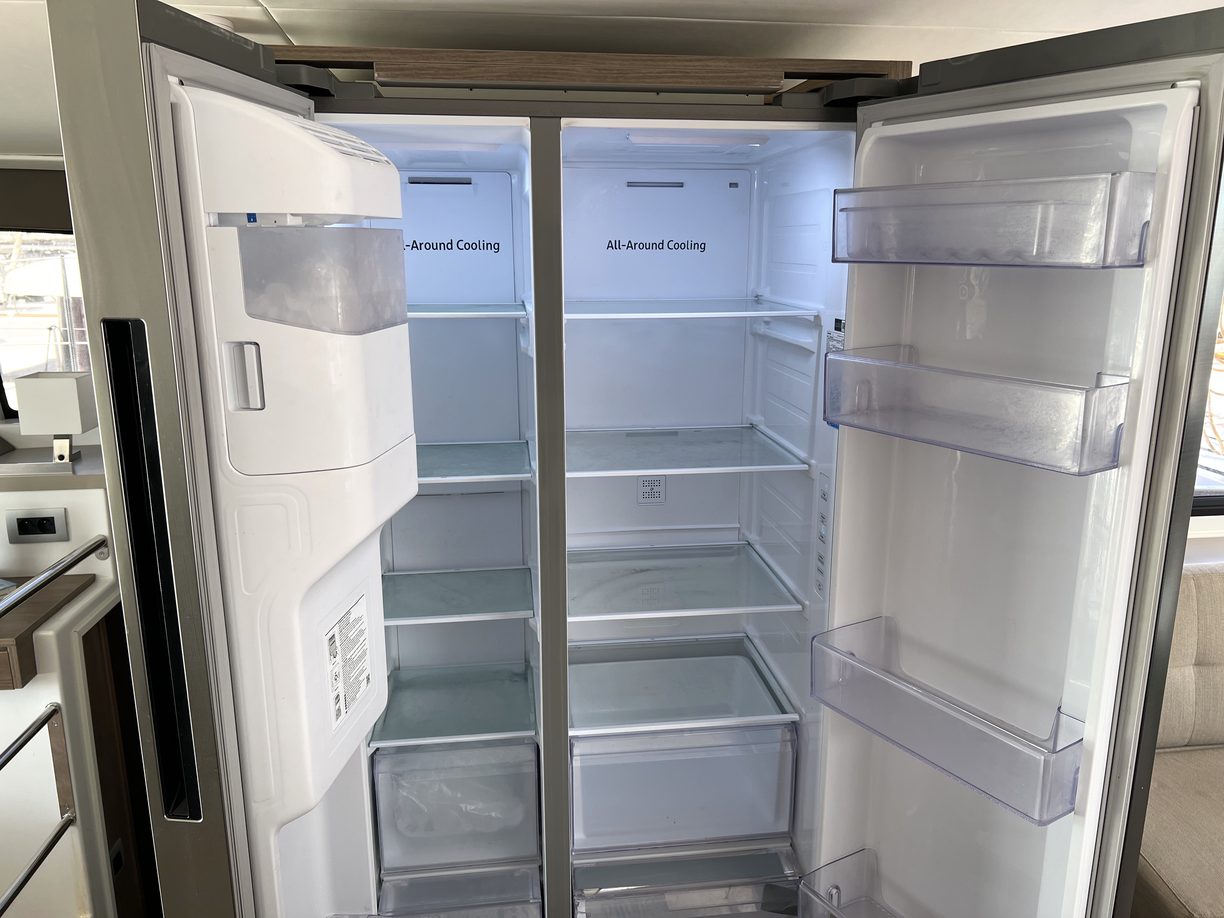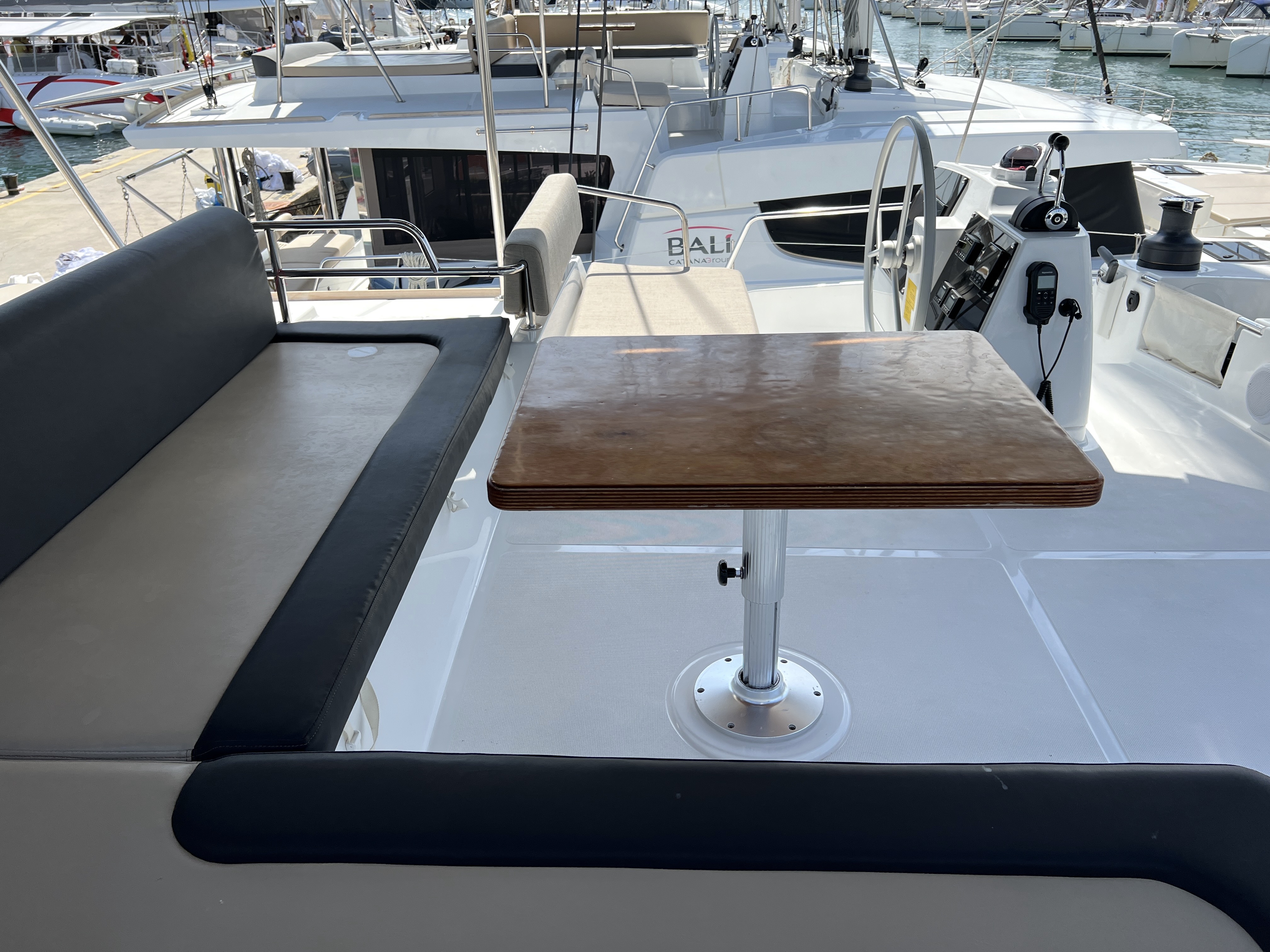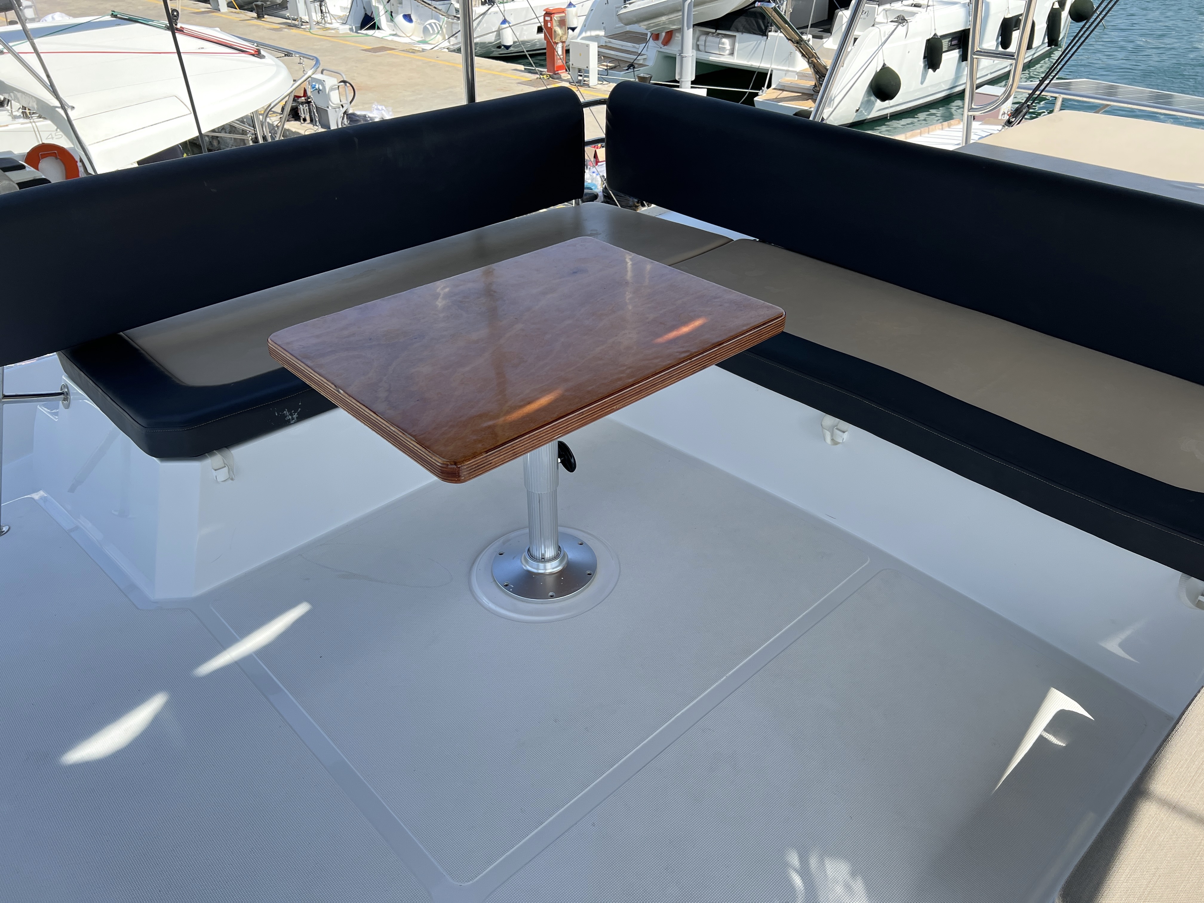 | Inside | 220V Steckdosen, FUSION Sound System, Gasherd mit Backofen, Gefrierschrank, Generator, Heizung, Inverter 12V/220V, Klimaanlage (ohne Landstrombedarf), Kühlschrank, Nespresso-Maschine, Pantryausstattung, Ventilatoren in Kabinen, Warmwasser, Watermaker, WC (elektr.) |