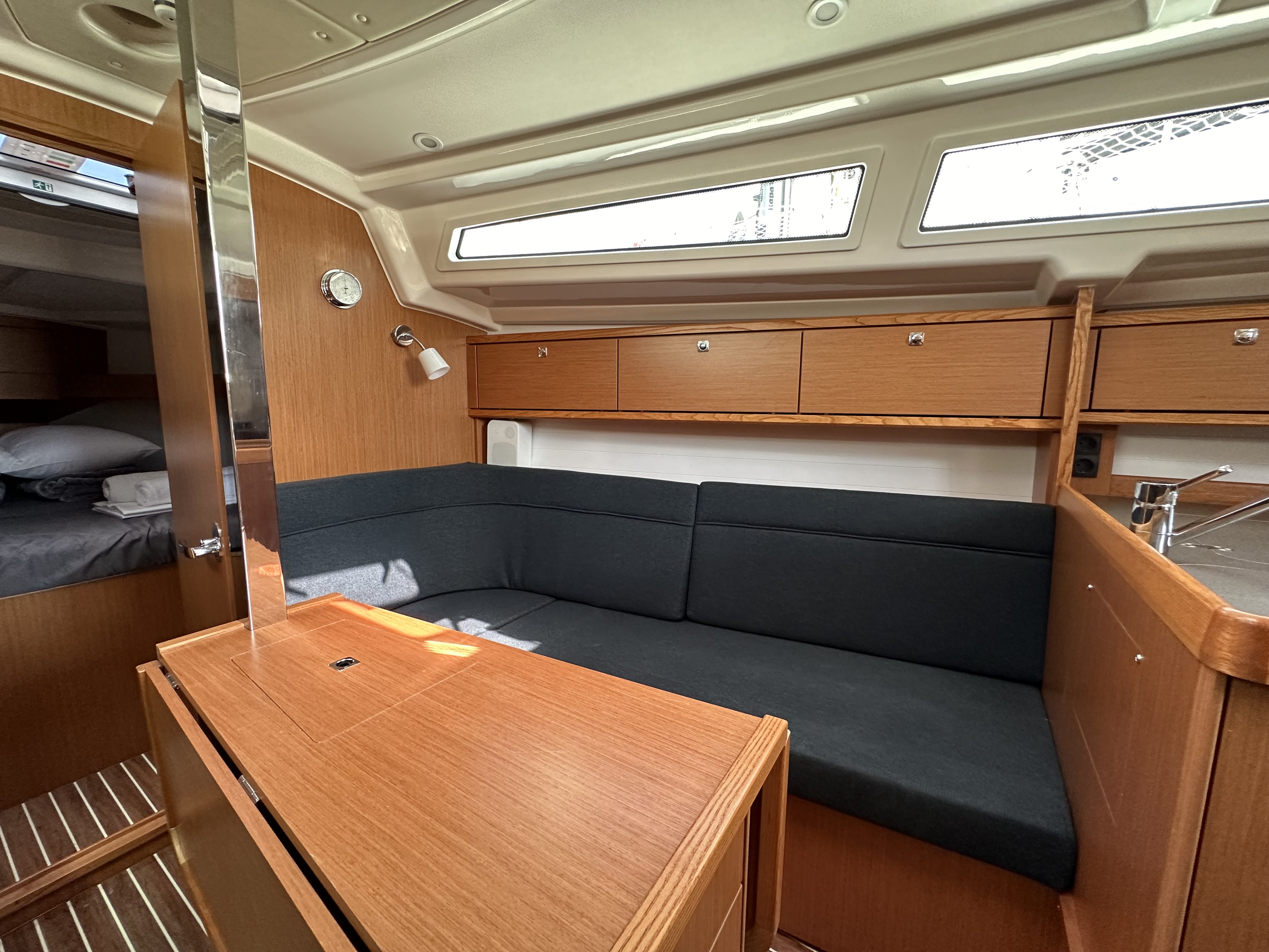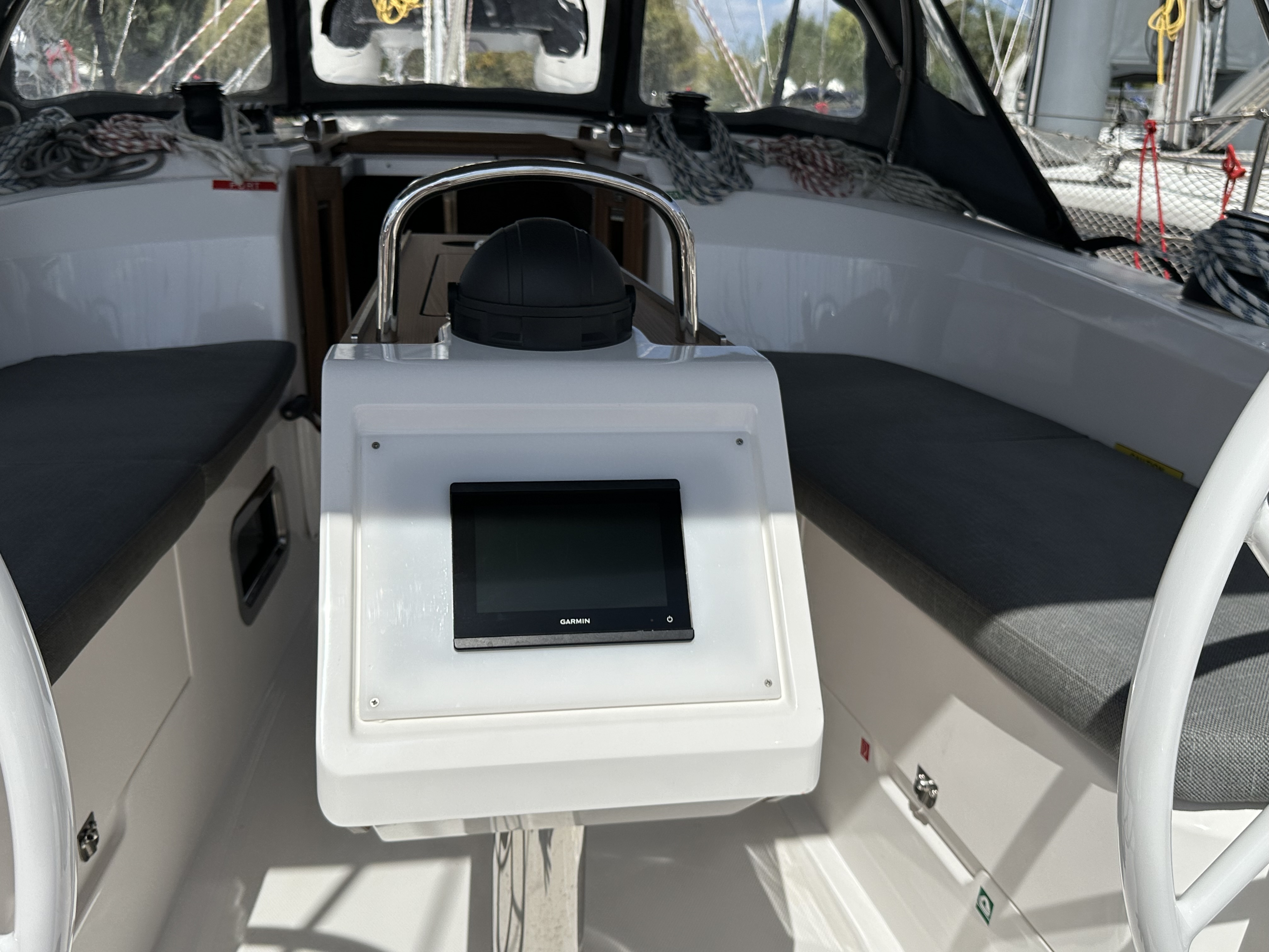 | Outside | Anker mit Kette, Badeleiter, Badeplattform, Biminitop, Bootshaken, Cockpitdusche, Cockpitlautsprecher, Cockpitpolster, elektr. Ankerwinsch, Festmacherleinen, Gangway, Solaranlage, Sprayhood, Wantenschneider |