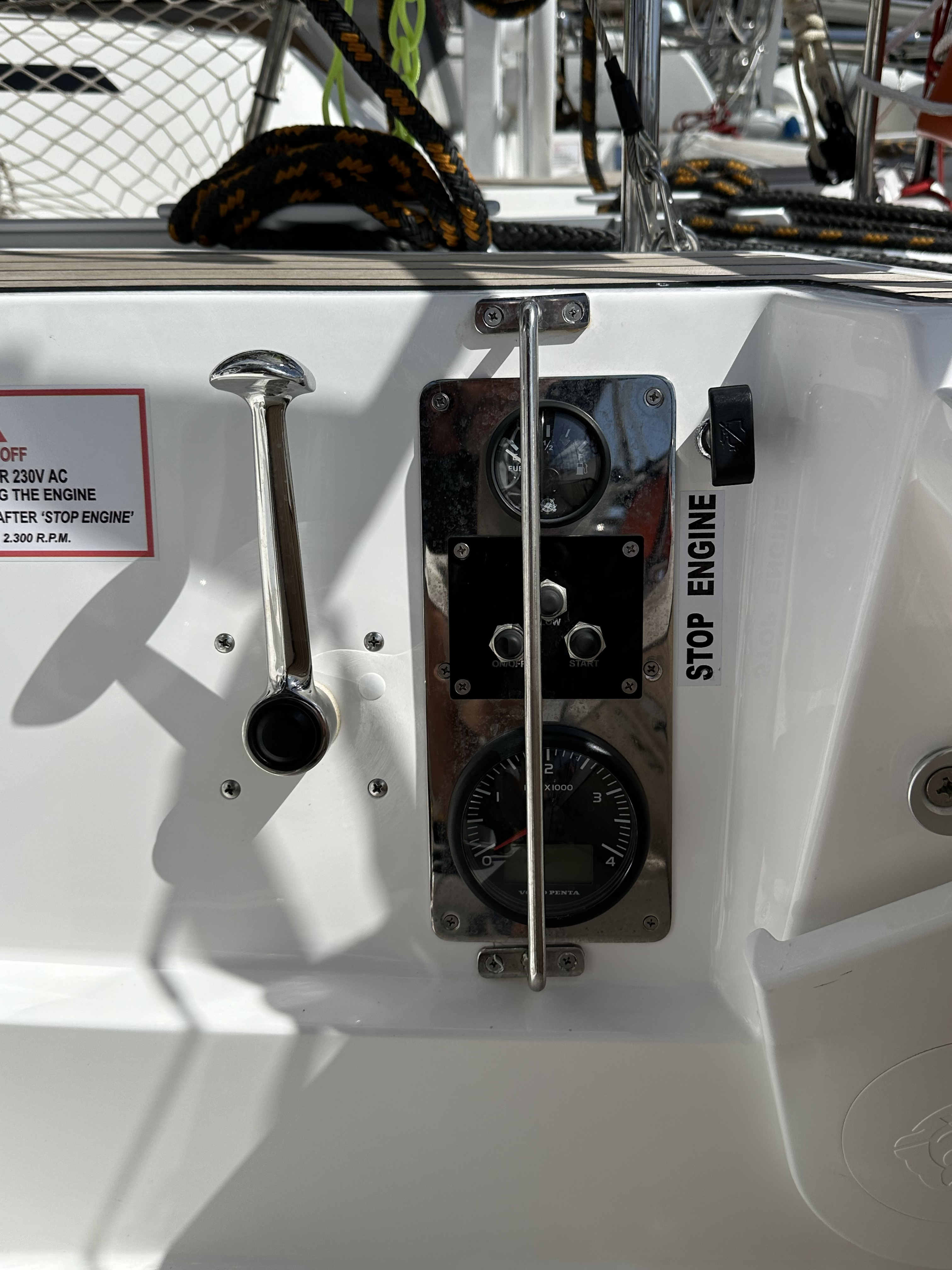 | Safety | Autopilot, Bootsmannstuhl, Bordapotheke, Bordwerkzeug, Bugstrahlruder, elektr. Bilgepumpe, Feststoffschwimmwesten, Feuerlöscher, Flaggen, Lifebelts, Motor-Ersatzteile, Nebelhorn, Notsignale, Reparaturset für Beiboot, Reserve-Motoröl, Rettungsinsel, Rettungskragen, Schwimmleine, Taschenlampe, UKW-Funk, Zweitanker |