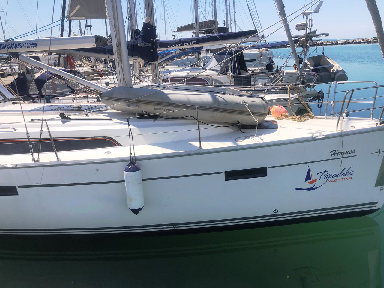 Outside Anker mit Kette, Badeleiter, Biminitop, Bootshaken, Cockpitpolster, Deckbürste, Delta-Anker, Dieselkanister , elektr. Winsch, Fender, Festmacherleinen, Gangway, Genuawinschen, Kunststoff-Eimer (Pütz), Solaranlage, Sprayhood, Vorhängeschloss, Wasserschlauch, Winschen