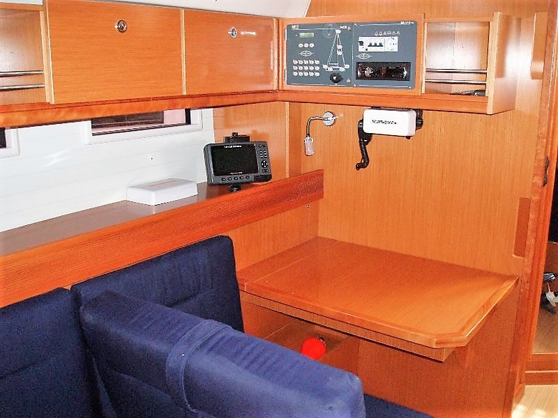 | Navigation | Echolot, GPS mit Kartenplotter im Cockpit, Hafenhandbücher, Navigationsbesteck, Seekarten, Sumlog, Windmesser |