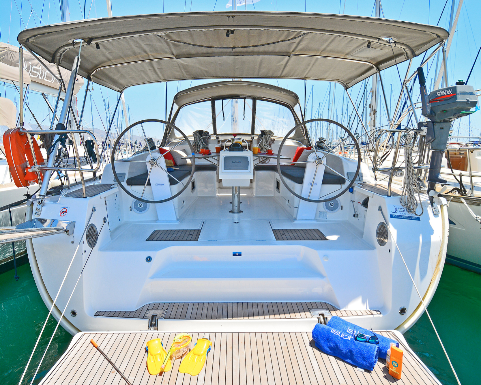 | Outside | 220 V-Landanschluss, Anker mit Kette, Badeleiter, Badeplattform, Biminitop, Bootshaken, Cockpitpolster, Cockpittisch, elektr. Ankerwinsch, Gangway, Schnorchelausrüstung, Solaranlage, Sprayhood, Wantenschneider, Wasserschlauch, Winschen |