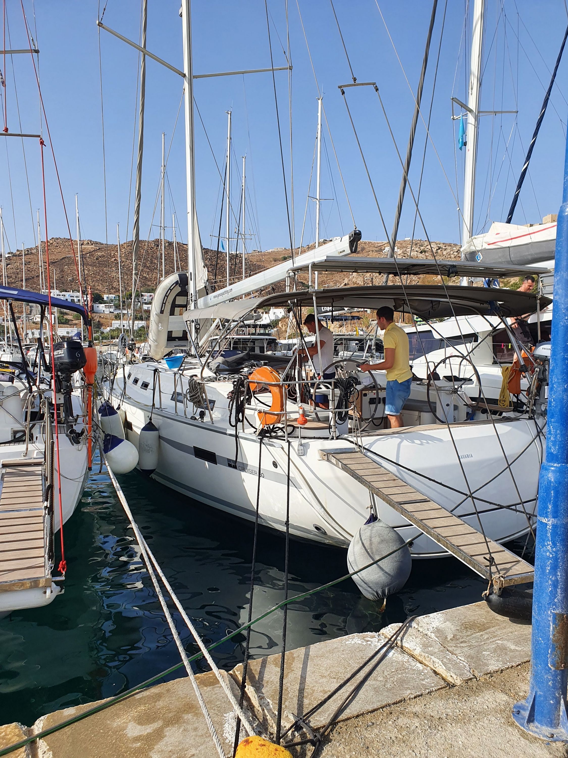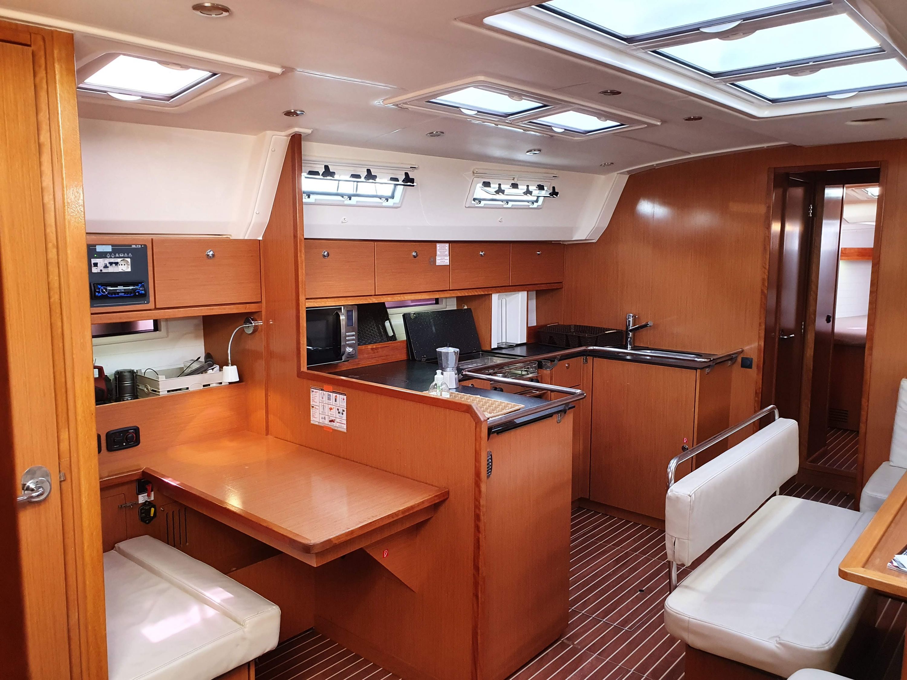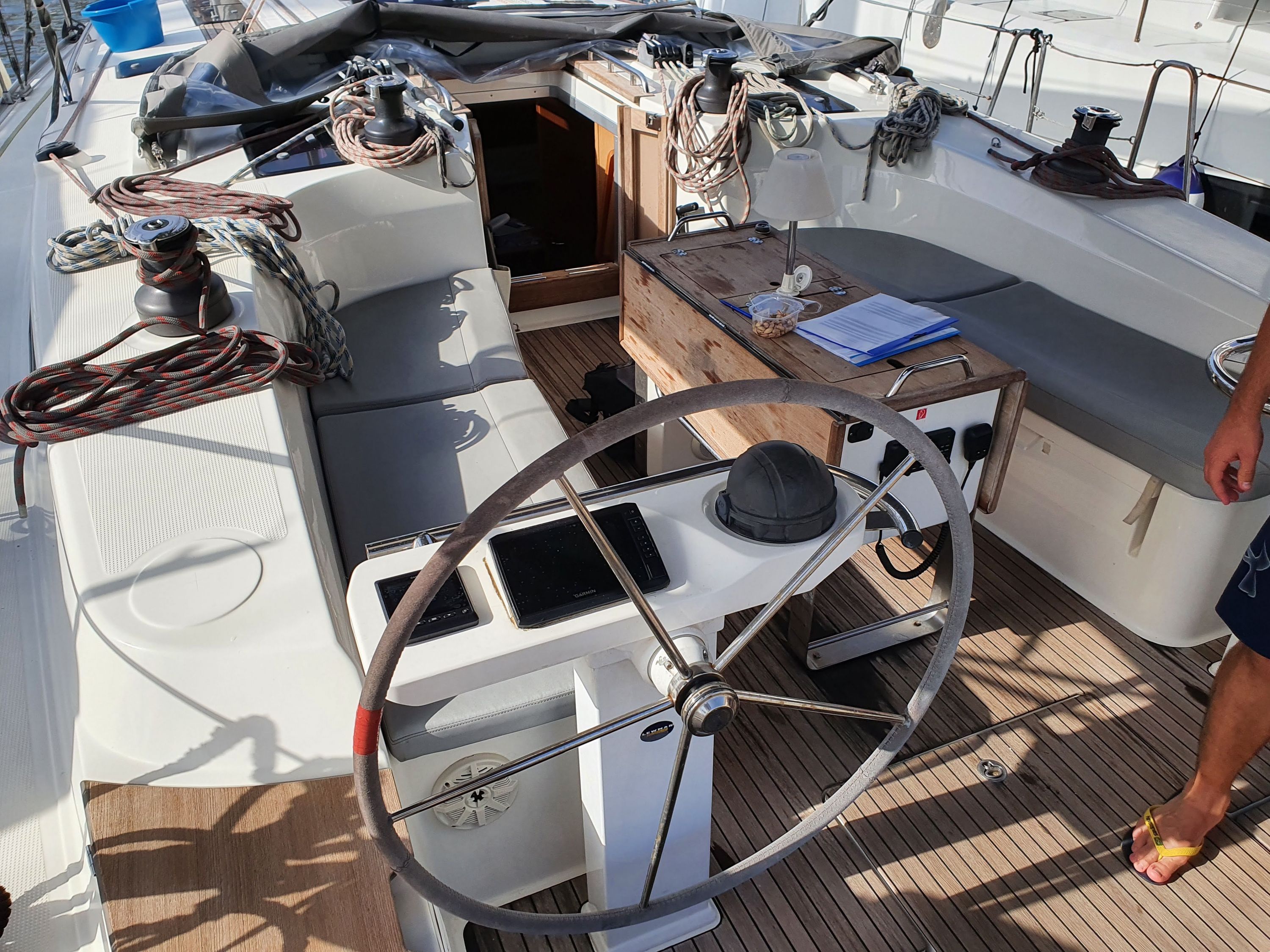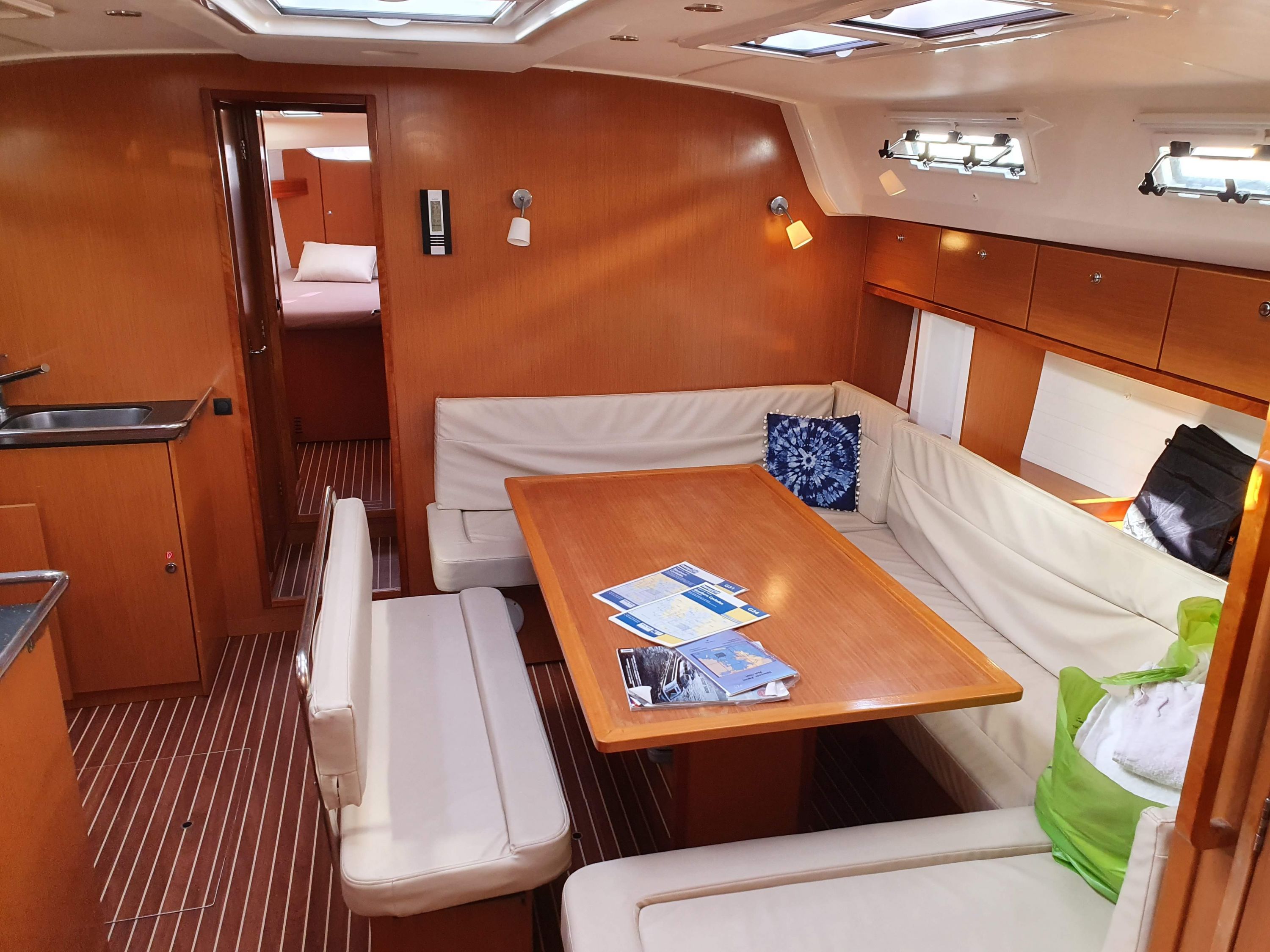 | Outside | Biminitop, Cockpitlautsprecher, elektr. Ankerwinsch, Solaranlage, Sprayhood, Teak im Cockpit |