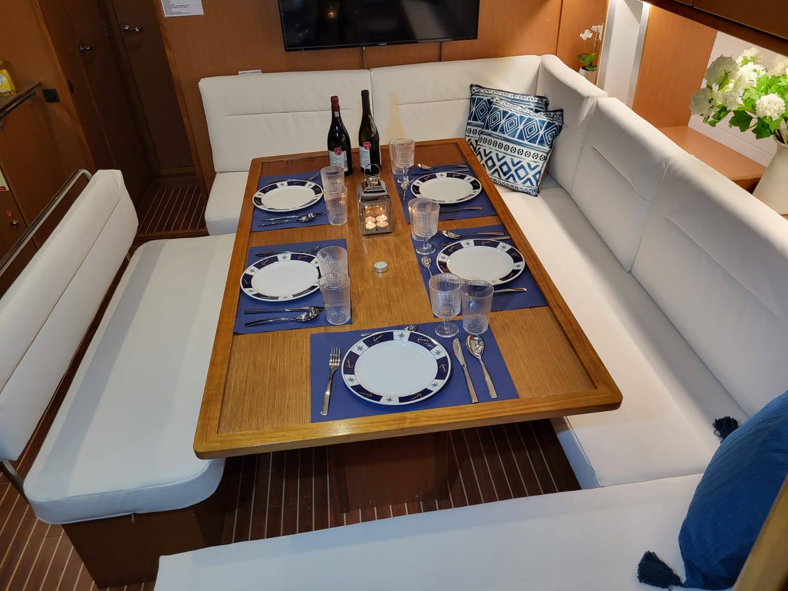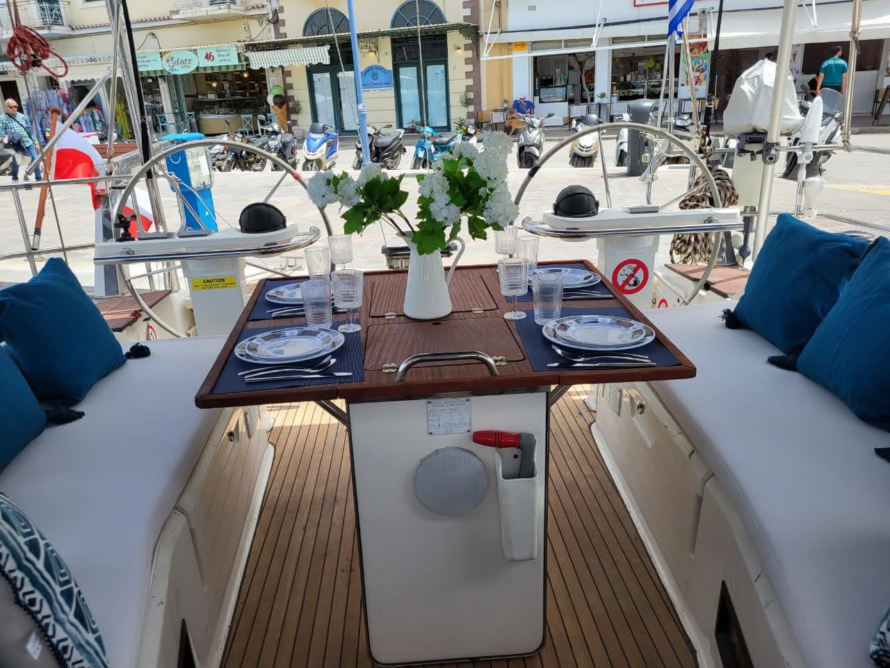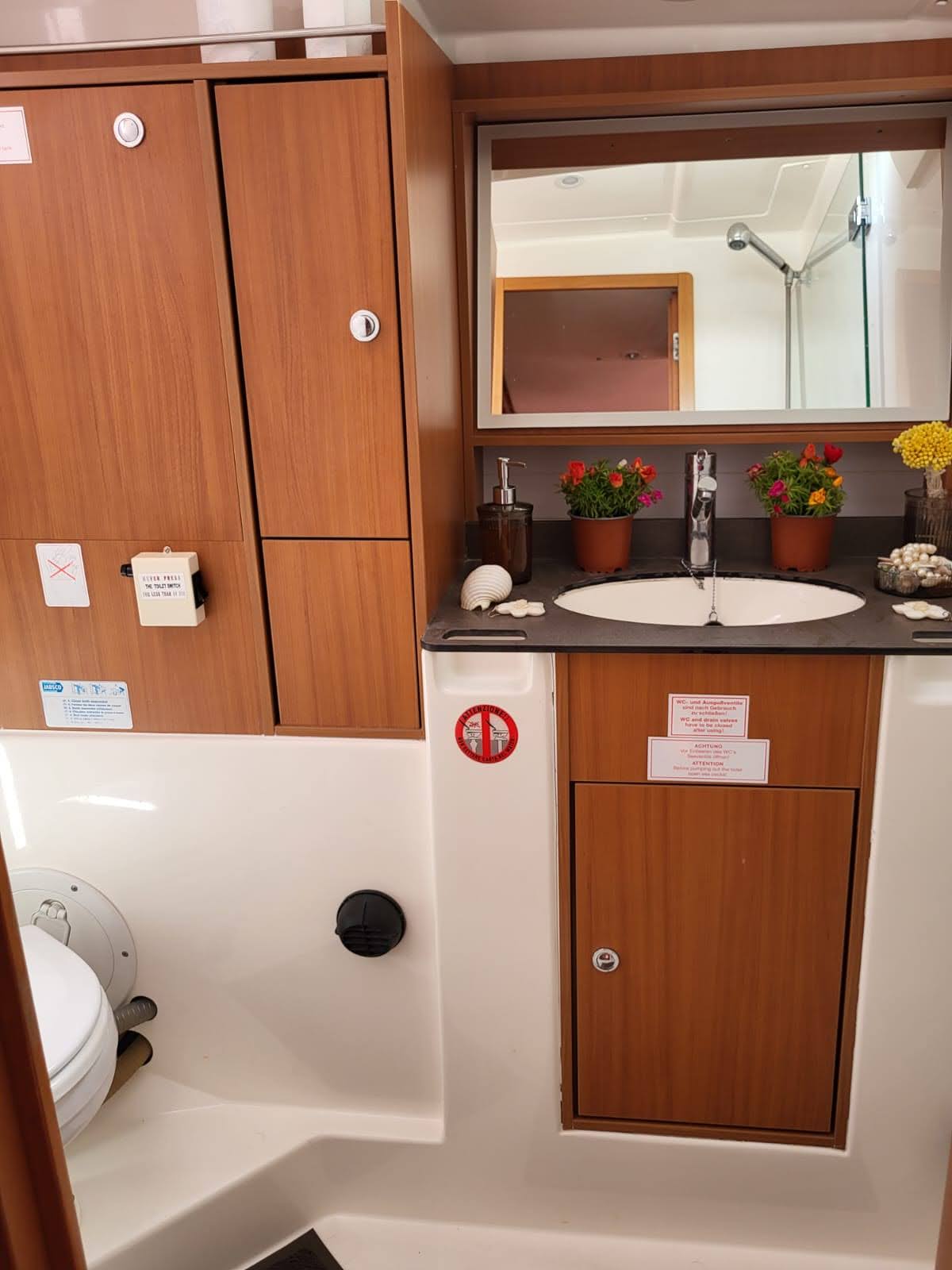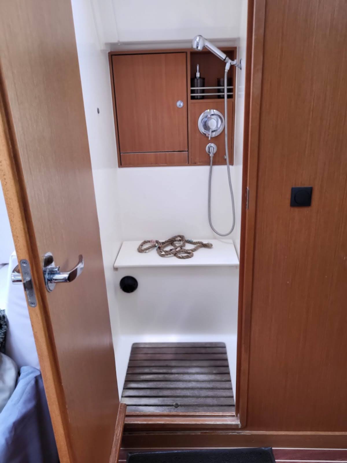 | Outside | Anker mit Kette, Badeleiter, Badeplattform, Biminitop, Cockpitdusche, Cockpitlautsprecher, Cockpitpolster, Cockpittisch, elektr. Ankerwinsch, Kugelfender, Solaranlage, Sonnensegel, Sprayhood, Teak im Cockpit, Teakdeck |