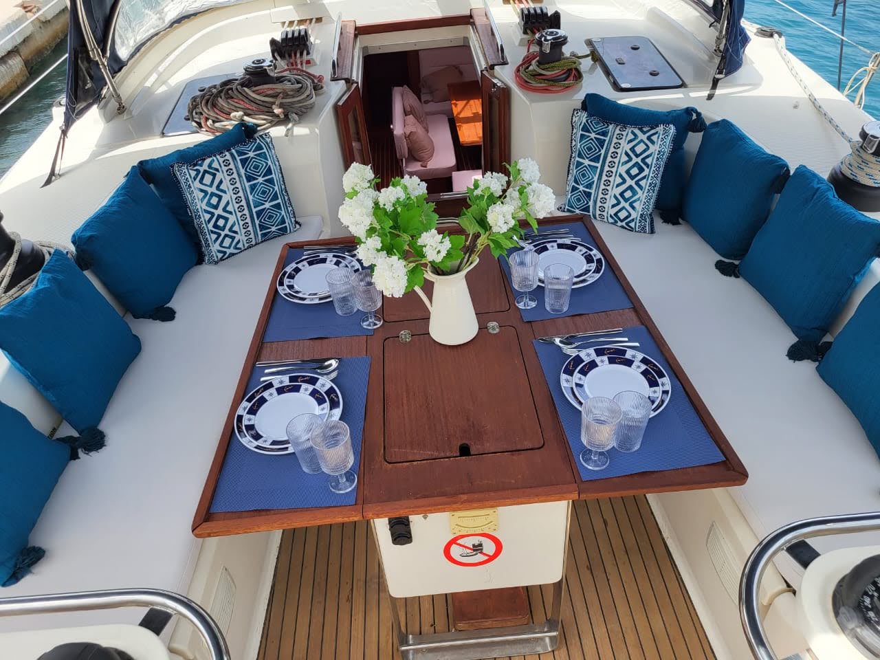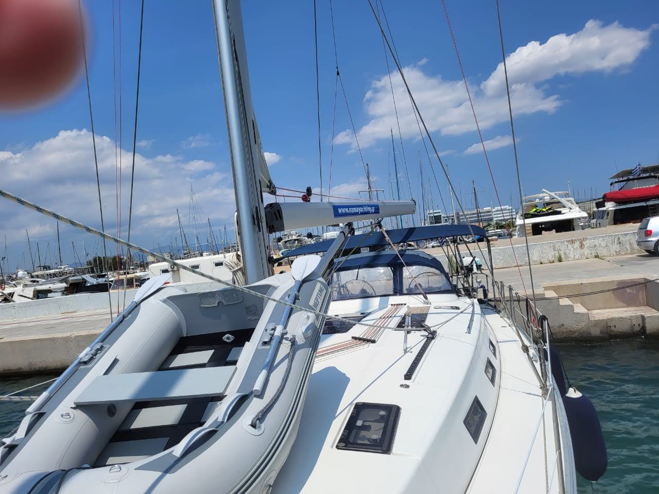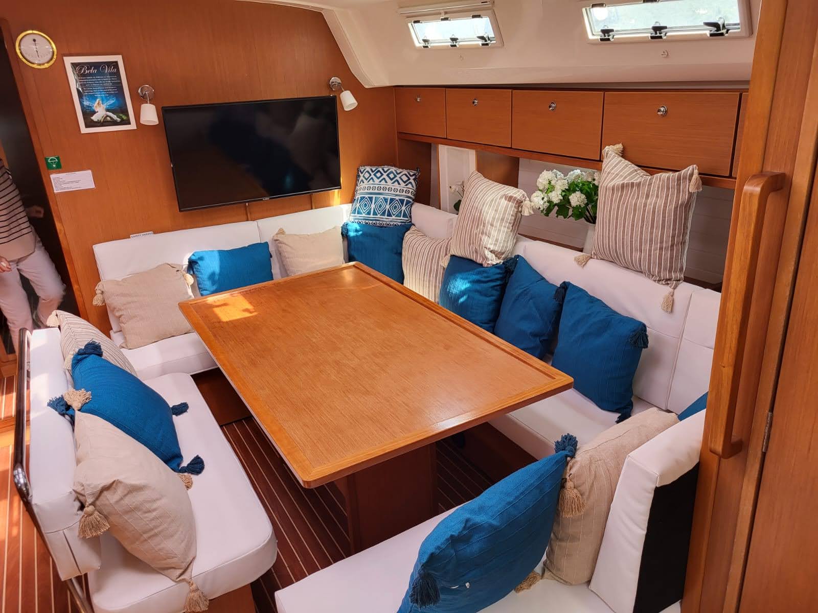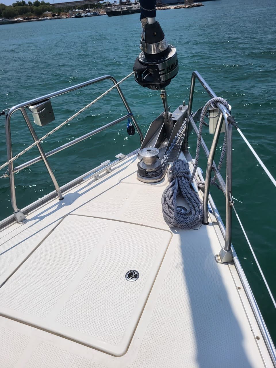 | Outside | Anker mit Kette, Badeleiter, Badeplattform, Biminitop, Cockpitdusche, Cockpitlautsprecher, Cockpitpolster, Cockpittisch, elektr. Ankerwinsch, Kugelfender, Solaranlage, Sonnensegel, Sprayhood, Teak im Cockpit, Teakdeck |