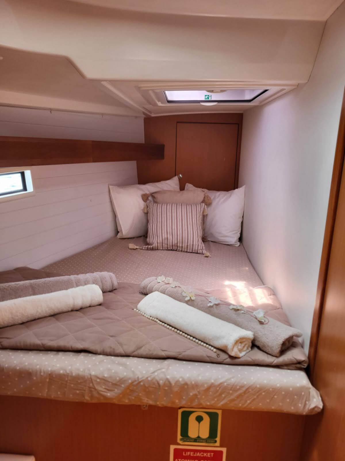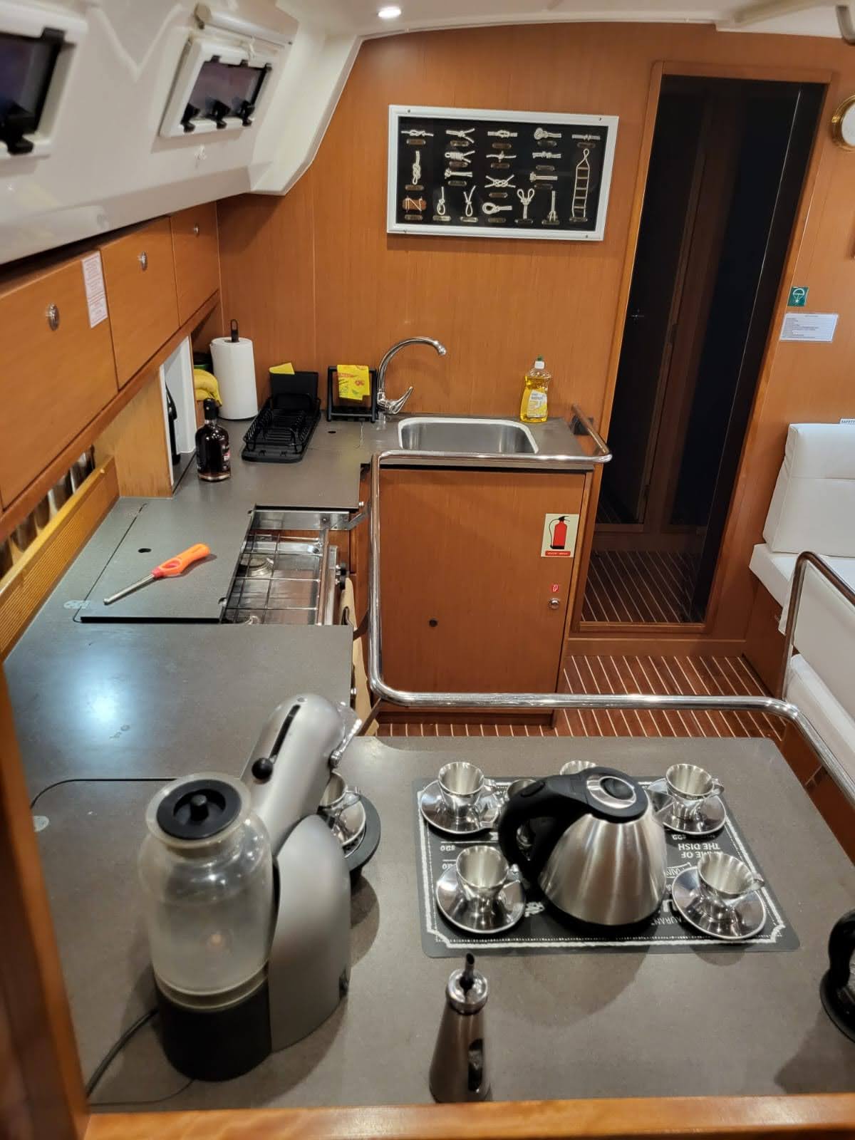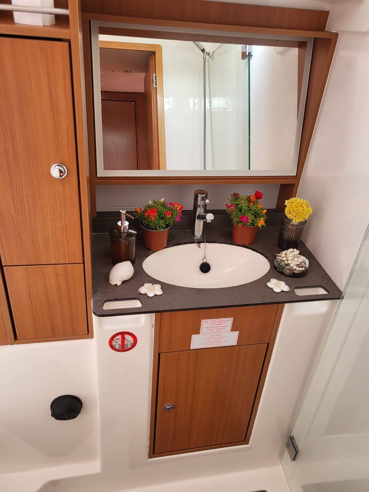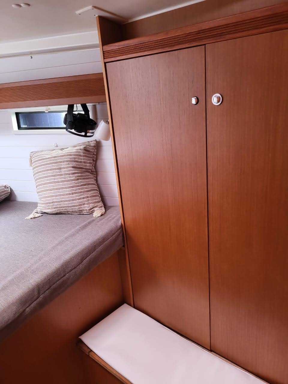| Outside | Anker mit Kette, Badeleiter, Badeplattform, Biminitop, Cockpitdusche, Cockpitlautsprecher, Cockpitpolster, Cockpittisch, elektr. Ankerwinsch, Kugelfender, Solaranlage, Sonnensegel, Sprayhood, Teak im Cockpit, Teakdeck |