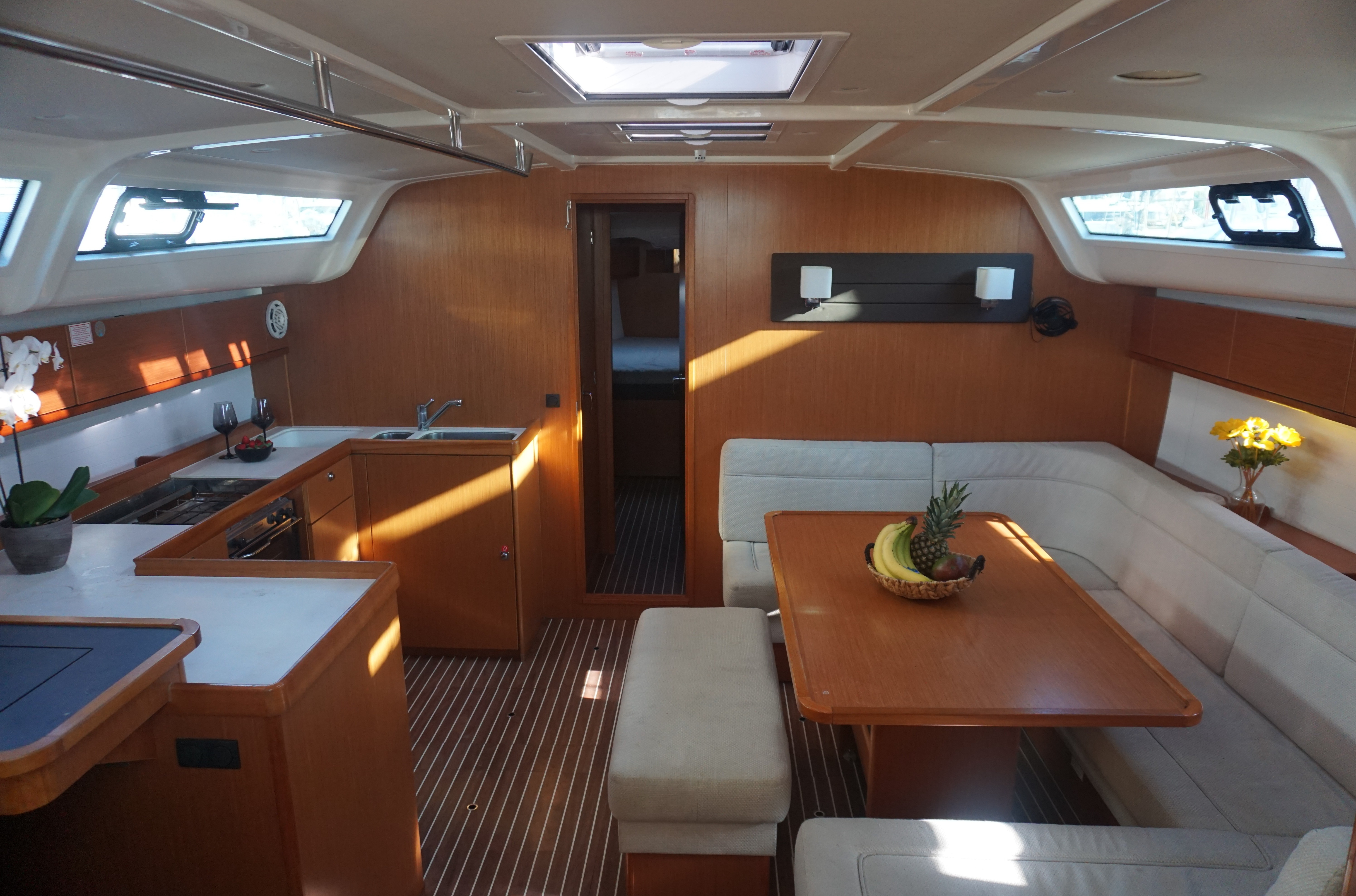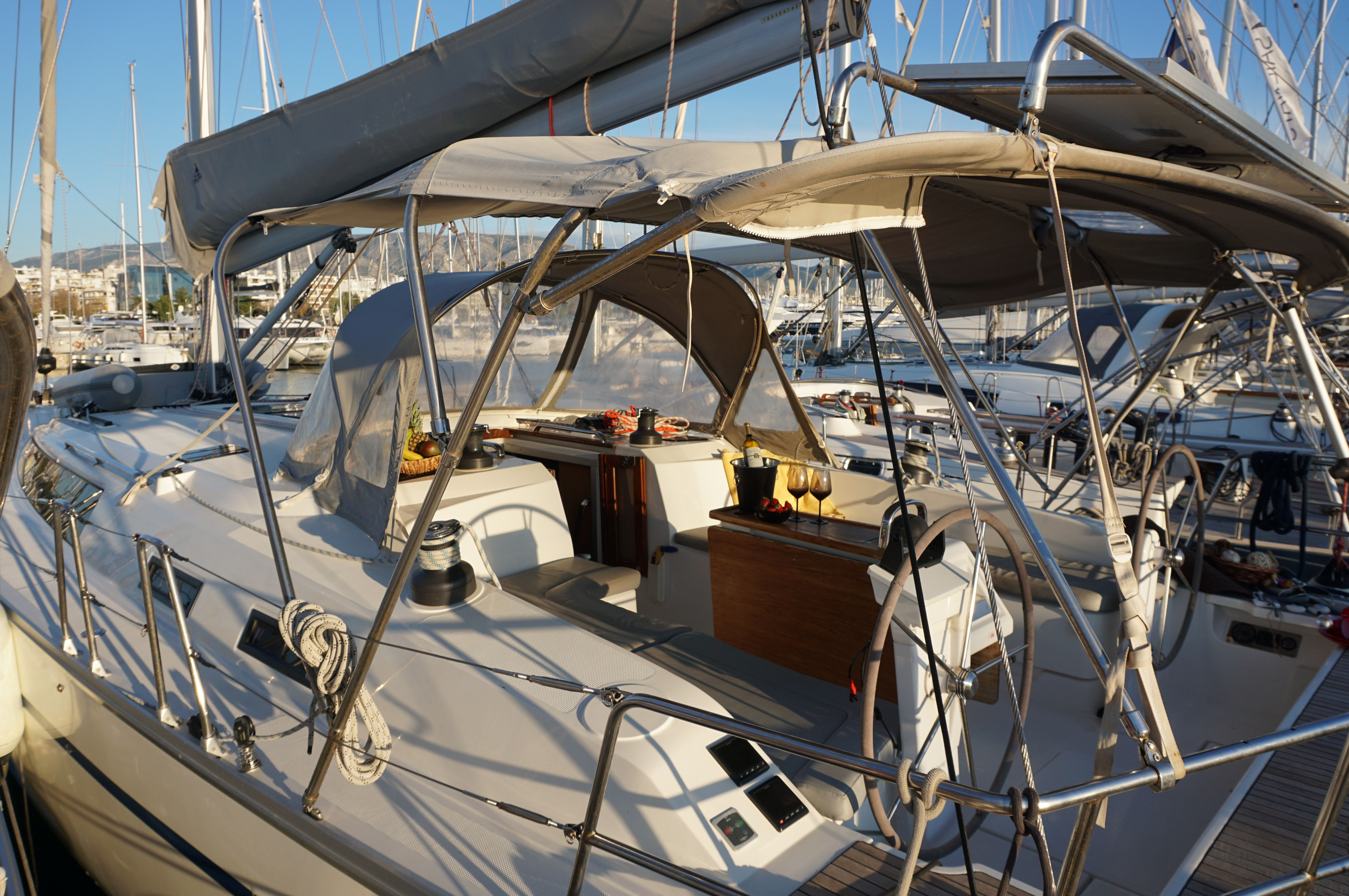| Outside | 220 V-Landanschluss, Anker mit Kette, Biminitop, Cockpitdusche, Cockpitlautsprecher, Cockpitpolster, elektr. Ankerwinsch, Sprayhood |