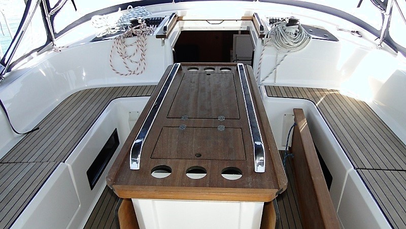 | Outside | 220 V-Landanschluss, Badeleiter, Badeplattform, Biminitop, Cockpitdusche warm/kalt, Cockpitlautsprecher, Cockpitpolster, Cockpittisch, elektr. Ankerwinsch, Gangway, Selbstholende Winschen, Sprayhood |