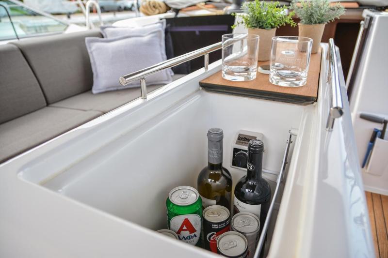 | Outside | Badeleiter, Biminitop, Cockpitdusche, Cockpitlautsprecher, Cockpitpolster, Cockpittisch, Deckpolster, elektr. Ankerwinsch, Gangway, Gas-Barbecue-Grill im Cockpit, Schnorchelausrüstung, Sprayhood, Teak im Cockpit |