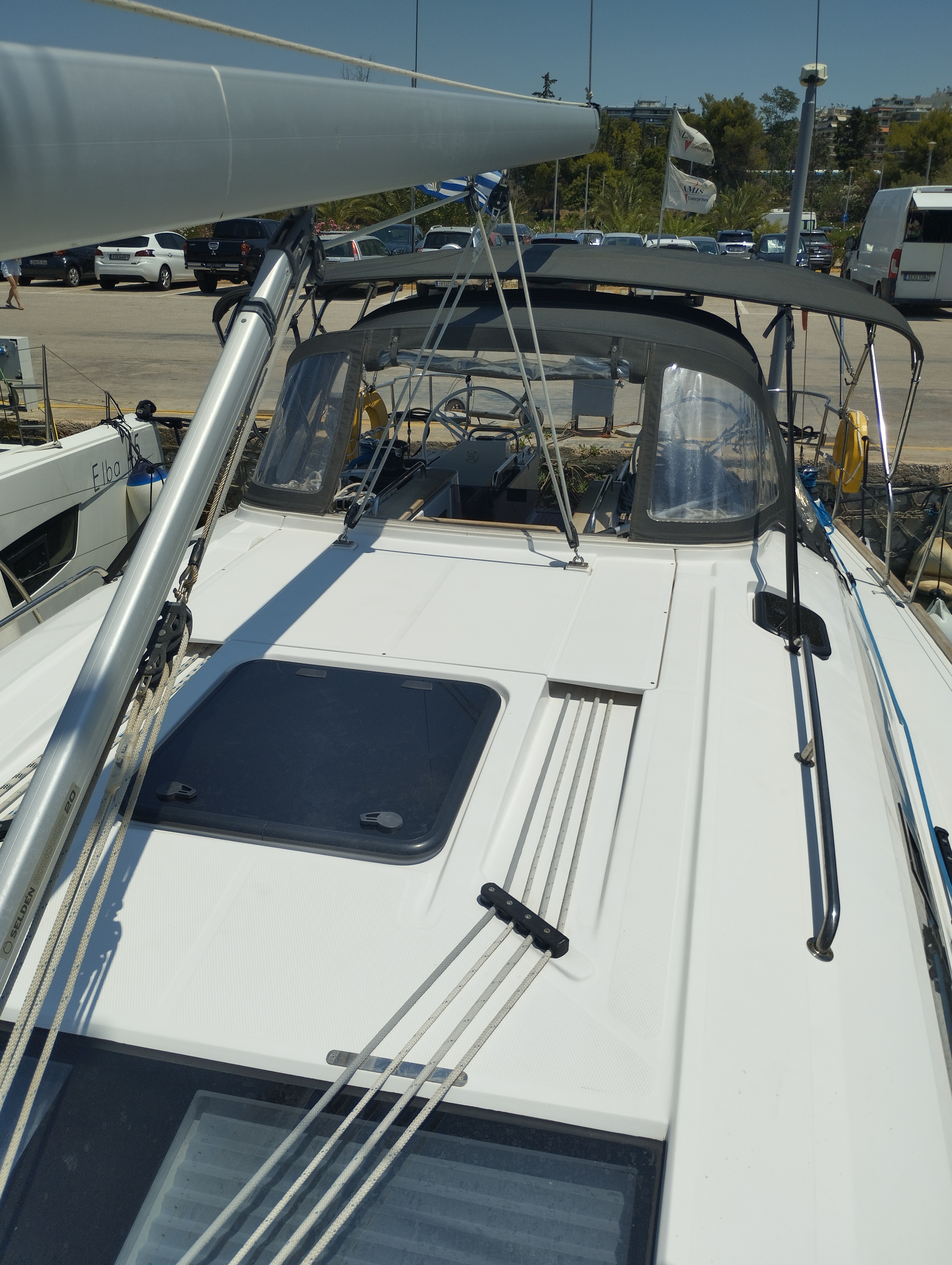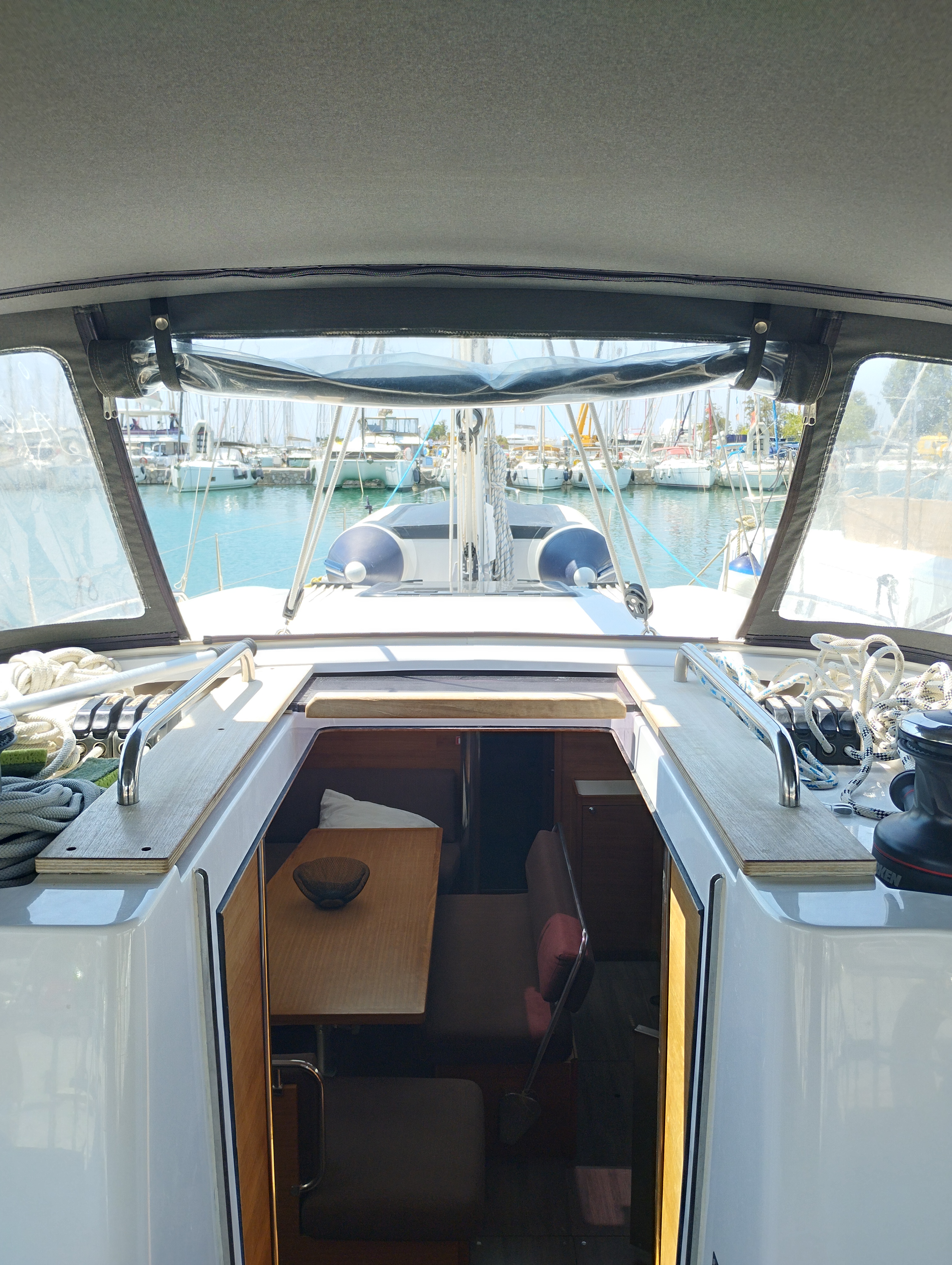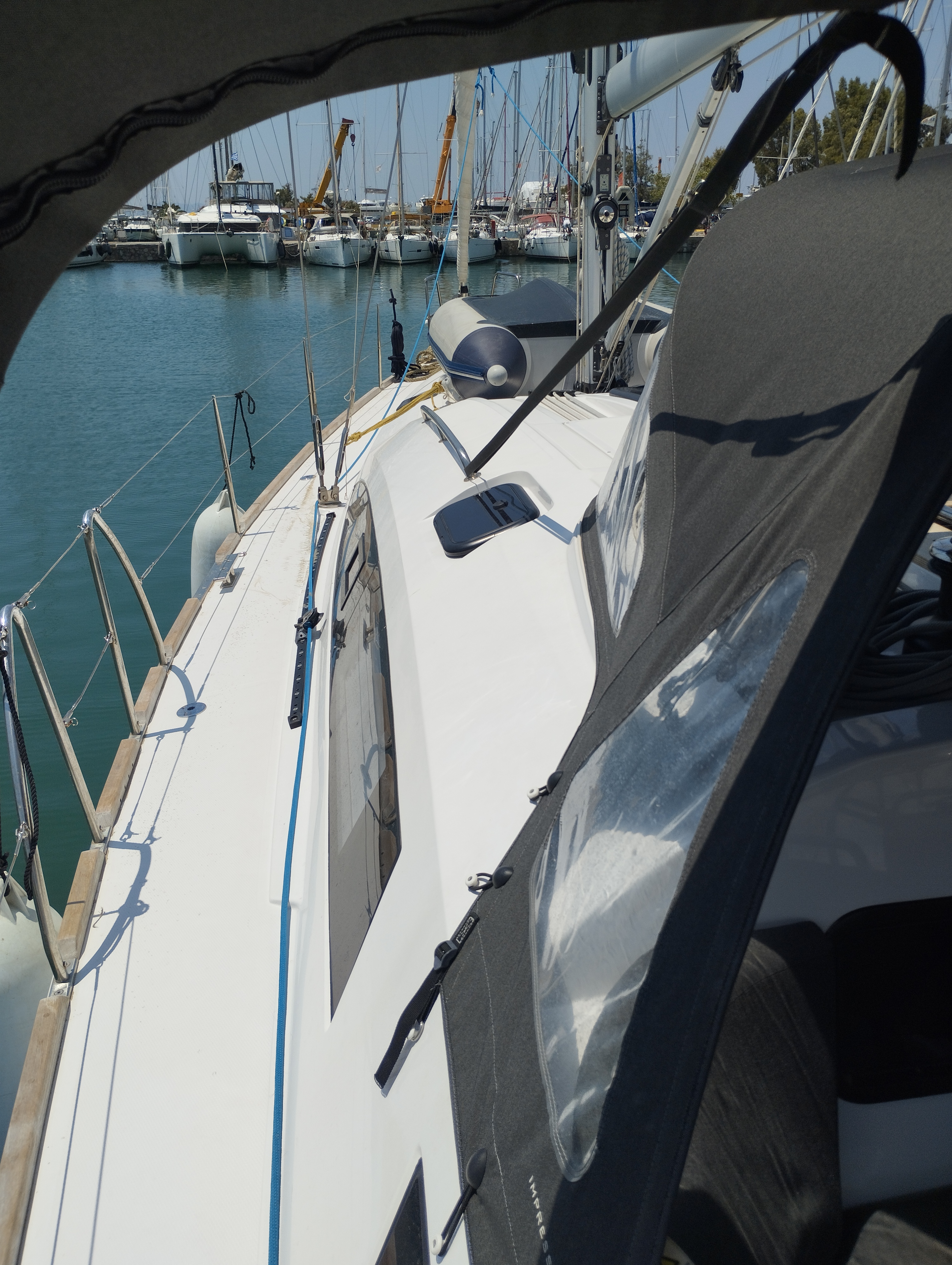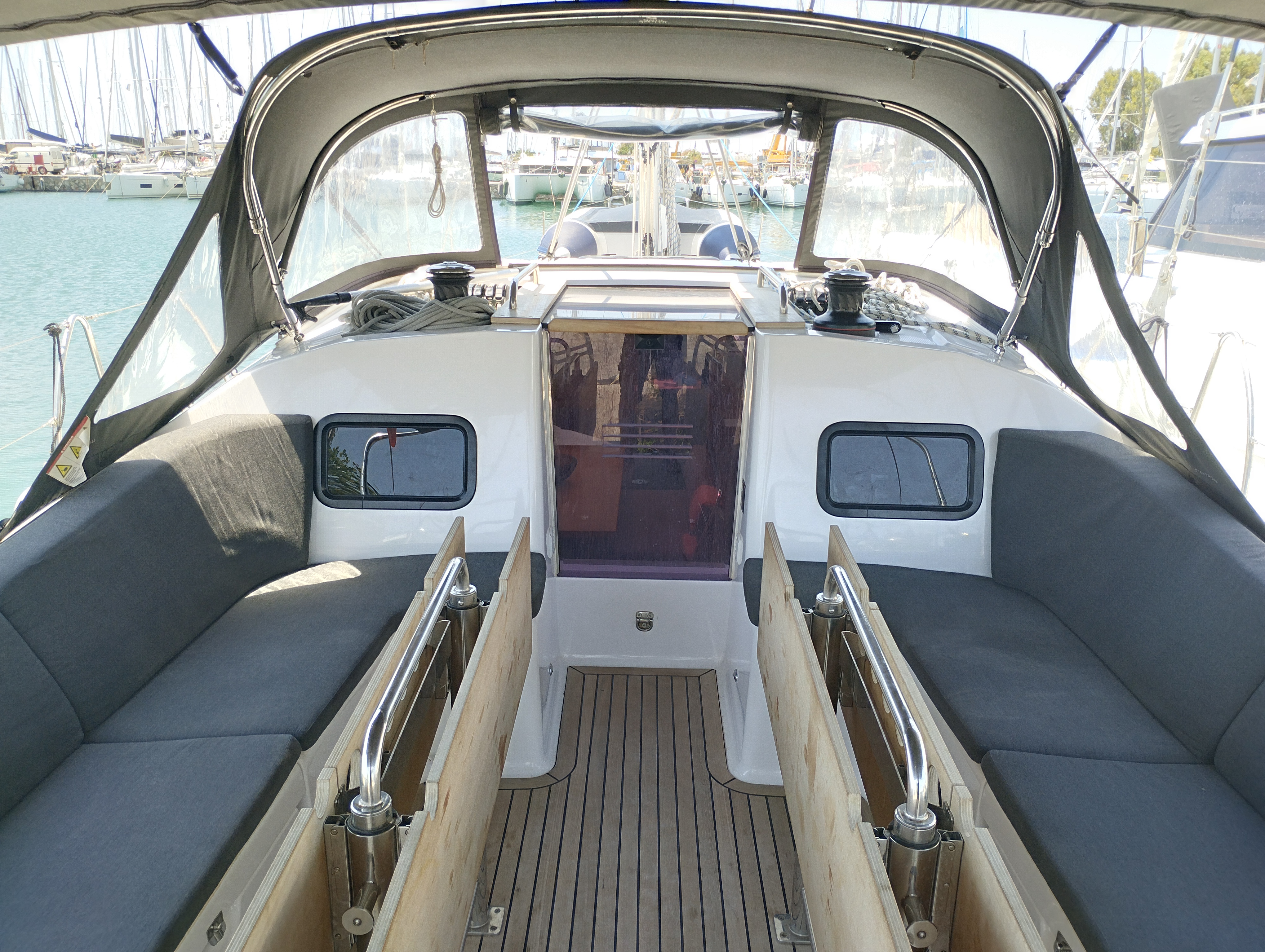 | Outside | Biminitop, Cockpitlautsprecher, Cockpittisch, elektr. Ankerwinsch, Gangway, Solaranlage, Sprayhood, Teak im Cockpit |