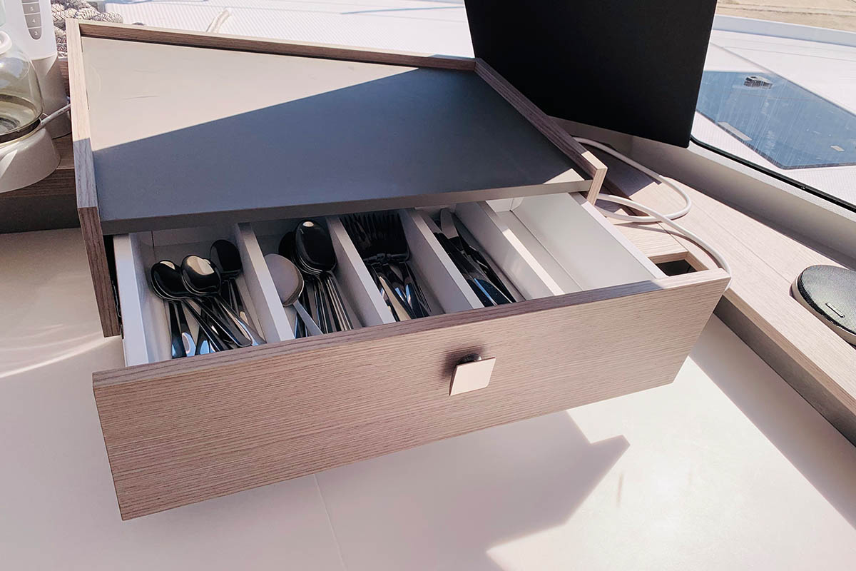 | Outside | 12 V-Anschluss, 220 V-Landanschluss, Anker mit Kette, Benzinkanister, Biminitop, Bootshaken, Cockpitdusche, Cockpitpolster, Cockpittisch, Davits, Deckbeleuchtung, Deckbürste, Deckpolster, Delta-Anker, elektr. Ankerwinsch, elektr. Genuawinsch, elektr. Winsch, Fallwinschen, Fender, Festmacherleinen, Gangway, Kuchenbude, Kugelfender, Kunststoff-Eimer (Pütz), Schnorchelausrüstung, Sonnendeck, Sonnensegel, Teak im Cockpit, Unterwasserbeleuchtung, Wantenschneider, Windex, Winschen |