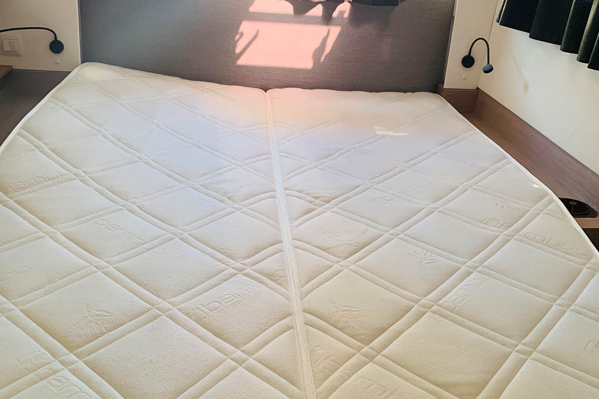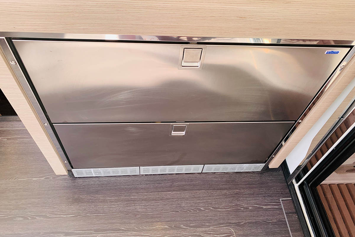 | Inside | 220V Steckdosen, Backofen, Besen und Kehrblech, Deckenleuchten, Fäkalientank, Gasherd, Generator, Geschirrspüler, Inverter 12V/220V, Kaffeemaschine, Klimaanlage (ohne Landstrombedarf), Klobürste, Kühlschrank, Landstromkabel, LED-Innenleuchten, Mikrowelle, Pantryausstattung, Radio, Salontisch absenkbar, Spülbecken, Trichter, Ventilatoren in Kabinen, Wasserkocher, Watermaker |