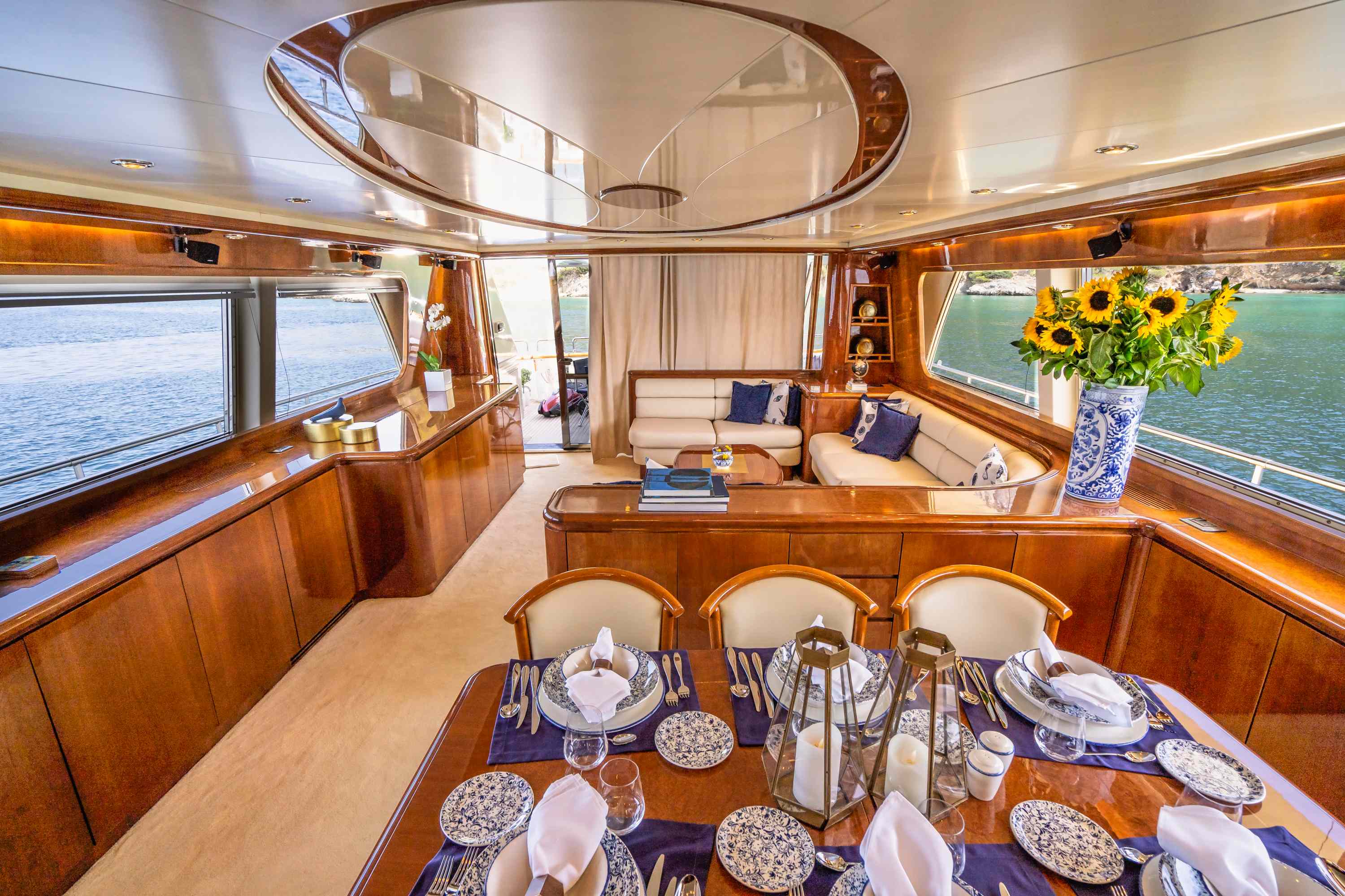 | Inside | Backofen, DVD-Player, Eiswürfelmaschine, Gasherd, Gefrierschrank, Generator, Geschirrspüler, Heizlüfter, Inverter 12V/220V, Kaffeemaschine, Klimaanlage (ohne Landstrombedarf), Kühlschrank, Lautsprecher im Salon, LCD Fernseher, Mikrowelle, Pantryausstattung, Radio mit CD und MP3, Spülbecken, Waschmaschine, Watermaker |