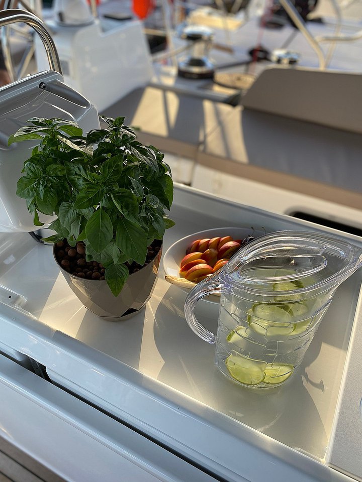 | Outside | 220 V-Landanschluss, Badeleiter, Badeplattform, Biminitop, Cockpitdusche, Cockpitlautsprecher, Cockpitpolster, Cockpittisch, elektr. Ankerwinsch, elektr. Winsch, hydraul. Gangway, Solaranlage, Sprayhood, Teak im Cockpit |